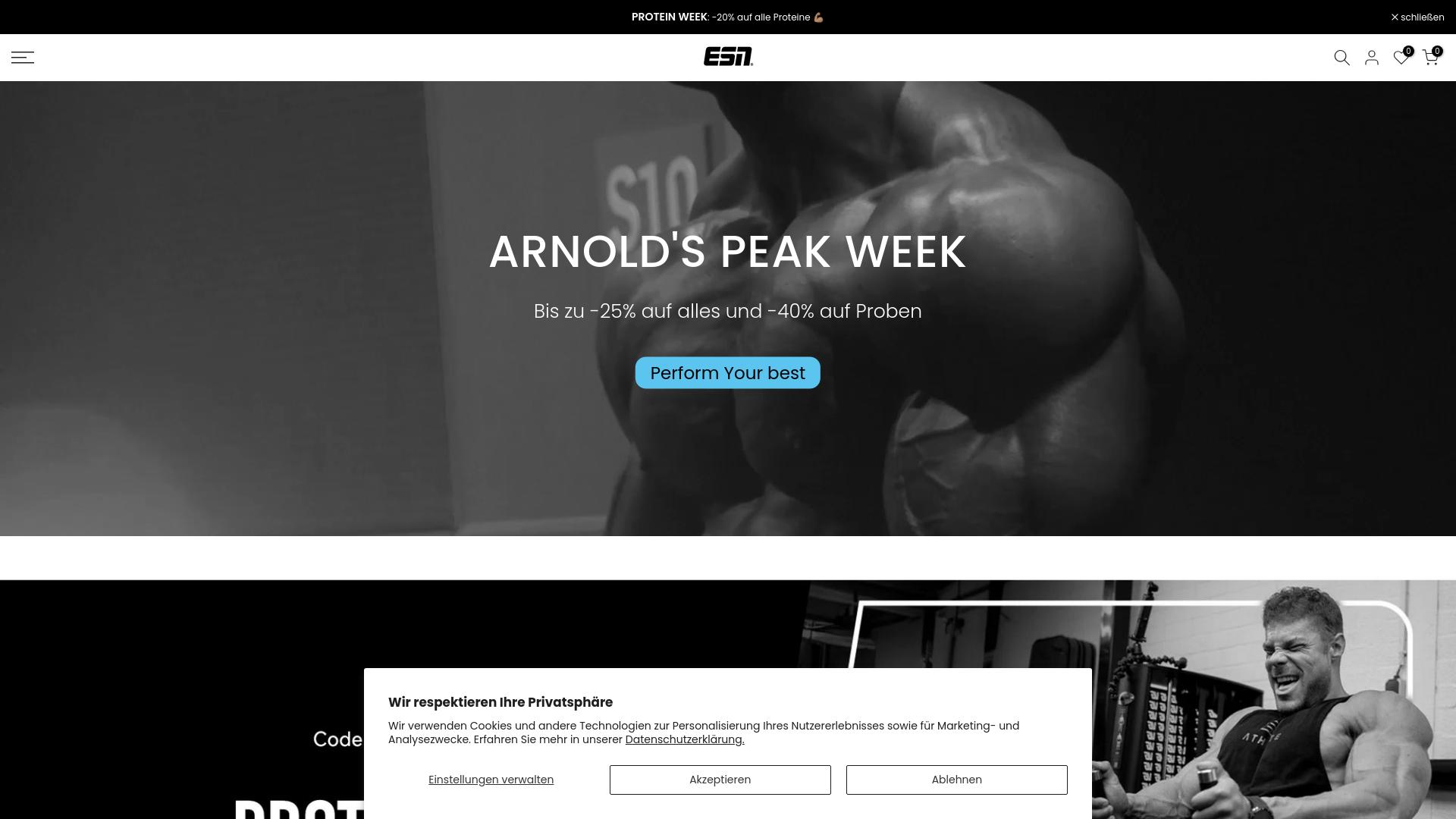 Die Webseite bietet eine Vielzahl von Produkten und Dienstleistungen, die sich auf Fitness und Ernährung konzentrieren. Zu den Hauptangeboten zählen verschiedene Proteinprodukte, die für Sportler und fitnessorientierte Verbraucher gedacht sind. Besonders hervorgehoben wird eine spezielle Aktion namens „Arnold’s Peak Week“, die Rabatte von bis zu 25 % auf alle Produkte und 40 % auf Produktproben beinhaltet. Die Gestaltung der Webseite verwendet visuelle Elemente, die Bögen und dynamische Darstellungen von sportlichen Aktivitäten umfassen. Es wird ein aktiver Lebensstil angesprochen, der durch die angebotenen Produkte unterstützt werden soll. Nutzer können sich mittels eines Buttons, der zum Aufruf zusätzlicher Informationen oder zum Kauf anregt, direkt in die Produktangebote einwählen. Des Weiteren enthält die Webseite einen Hinweis auf die Verwendung von Cookies, die für die Verbesserung der Nutzererfahrung und zu Analysezwecken eingesetzt werden. Besucher haben die Möglichkeit, ihre Cookie-Einstellungen zu verwalten oder die Verwendung abzulehnen. Dies zeigt, dass die Webseite auch auf Datenschutzaspekte eingeht, wobei eine klare Option für die Nutzer bereitgestellt wird. Zudem sind im unteren Bereich der Seite weitere Bilder und Informationen dargestellt, die Trainings- und Fitnesskontexte zeigen. Es wird somit eine visuelle Verbindung zu den Produkten hergestellt, um Nutzer anzusprechen, die an einem aktiven und gesunden Lebensstil interessiert sind. Die Webseite könnte auch ein Registrierungs- oder Login-System haben, um eine personalisierte Erfahrung für die Nutzer zu schaffen. Insgesamt zielt die Plattform darauf ab, verschiedene Fitness- und Ernährungsprodukte anzubieten und fördert durch Aktionen und visuelle Gestaltung ein aktives Nutzerinteresse.