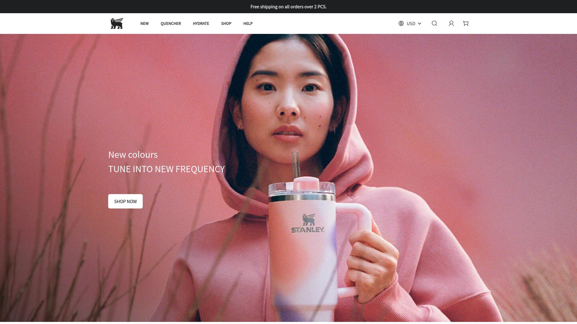 Die Webseite präsentiert Produkte der Marke Stanley, insbesondere in Bezug auf Trinkbehälter und Accessoires. Es wird ein breites Spektrum an Farben und Designs angeboten, die anscheinend für eine jüngere Zielgruppe gedacht sind. Die Startseite weist auf neue Farben hin und verwendet den Slogan „TUNE INTO NEW FREQUENCY“. Die dargestellten Produkte scheinen funktional gestaltet zu sein, um die Bedürfnisse der Nutzer in Bezug auf Hydration und Mobilität zu erfüllen. Ein prominentes Produktbild zeigt einen Trinkbehälter mit einem integrierten Strohhalm und einer markanten Farbgebung. Zusätzlich wird hervorgerufen, dass der Versand bei Bestellungen über zwei Stück kostenfrei ist. Die Navigation der Webseite scheint einfach und benutzerfreundlich zu sein, mit klaren Kategorien wie „NEW“, „QUENCHER“, „HYDRATE“, „SHOP“ und „HELP“. Diese Struktur deutet darauf hin, dass Nutzer leicht auf Informationen zu den Produktlinien und deren spezifischen Funktionen zugreifen können. Der Abschnitt „Shop“ könnte eine umfassende Produktübersicht bieten, in der die verschiedenen Trinkbehälter, Flaschen und möglicherweise auch ergänzende Zubehörteile präsentiert werden. Informationen zu Materialien, Größe und Pflegehinweisen könnten ebenfalls enthalten sein. Die Webseite könnte zudem Funktionen zur Registrierung und zum Kauf anbieten, allerdings sind dazu keine spezifischen Details sichtbar. Zusätzlich gibt es möglicherweise einen Bereich für Kundenservice oder häufig gestellte Fragen (FAQ) unter der Kategorie „HELP“, der Nutzer bei Fragen oder Anliegen unterstützen soll. Insgesamt legt die Webseite den Fokus auf die Verkaufsförderung von Trinken, wobei visuelle Elemente und ansprechende Designs betont werden. Eine genauere Analyse der spezifischen Angebote und Bedingungen hätte jedoch weitere Informationen erfordert.