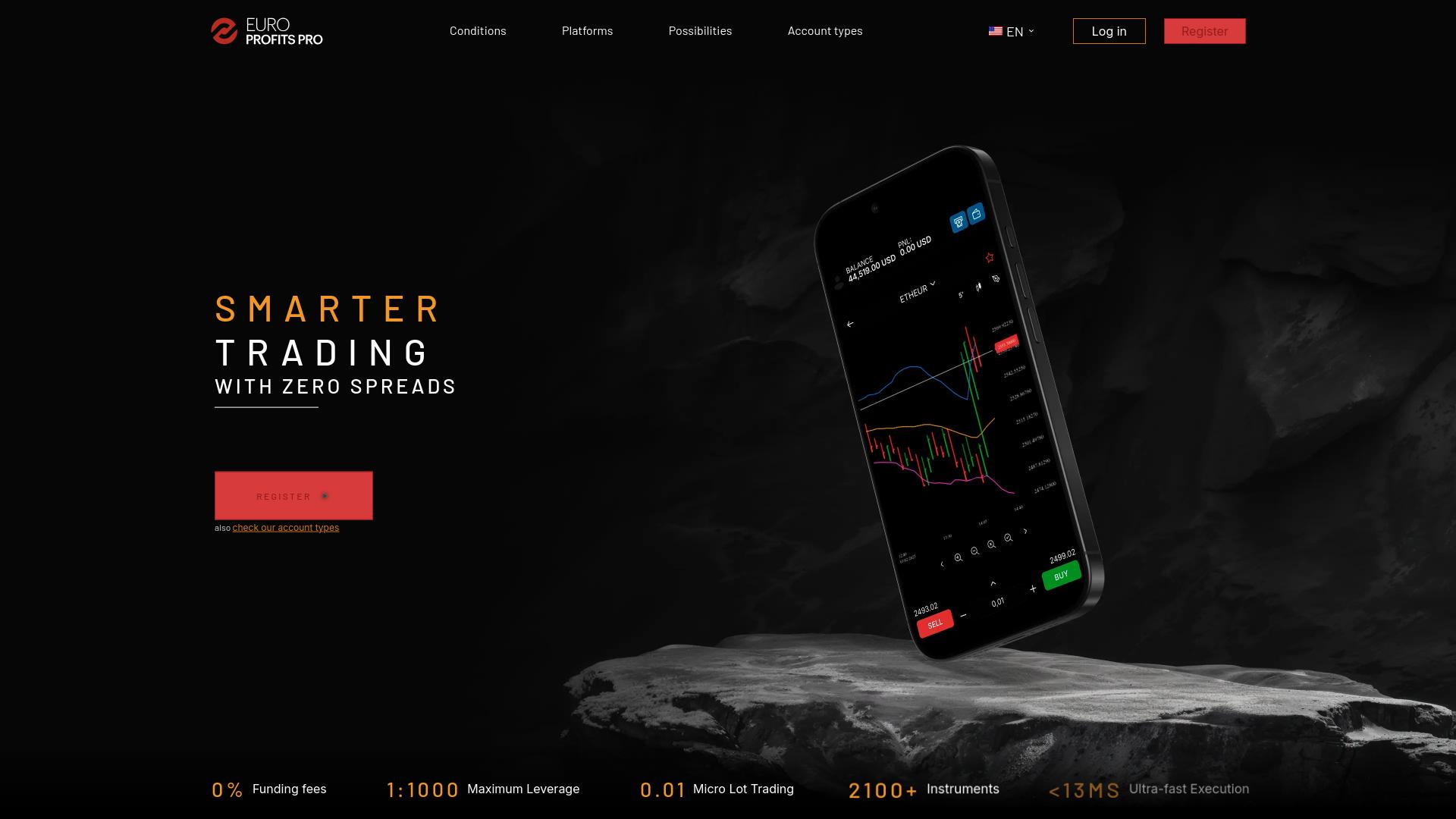 Die Webseite „Euro Profits Pro“ bietet eine Handelsplattform für verschiedene Finanzinstrumente. Auf der Startseite wird eine Benutzeroberfläche dargestellt, die auf einem mobilen Gerät abgebildet ist, und zeigt Diagramme von Handelsaktivitäten. Die Plattform betont das Angebot des Handels mit „null Spreads“ und hebt hervor, dass keine Funding-Gebühren anfallen. Die Seite informiert darüber hinaus über verschiedene Handelsbedingungen. Ein maximales Hebelverhältnis von 1:1000 wird angegeben, mit der Möglichkeit, Micro-Lots ab 0,01 zu handeln. Dies deutet auf Flexibilität in der Handelsgröße hin. Die Plattform bewirbt über 2100 verfügbare Handelsinstrumente, was eine breite Palette an Optionen für Nutzer impliziert. Zusätzlich wird die Ausführungszeit von weniger als 13 Millisekunden erwähnt, was auf die Schnelligkeit der Transaktionen hinweist. Nutzer haben die Möglichkeit, sich zu registrieren oder sich in ein bestehendes Konto einzuloggen. Es gibt auch einen Hinweis auf verschiedene Kontotypen, die zur Auswahl stehen, was darauf hindeutet, dass die Benutzer je nach ihren individuellen Bedürfnissen oder Strategien verschiedene Optionen haben könnten. Die Gestaltung der Webseite ist geprägt von einem dunklen Farbkonzept und modernem Design, was eine gewisse Benutzerfreundlichkeit und ästhetische Ansprache vermittelt. Jedoch kann keine konkrete Aussage über die Benutzererfahrung oder die Funktionsweise der Webseite gemacht werden, basierend lediglich auf der visuellen Darstellung. Insgesamt bietet „Euro Profits Pro“ eine Plattform, die darauf abzielt, Nutzern den Zugang zu Handelsmöglichkeiten in verschiedenen Finanzmärkten zu erleichtern. Es wird sowohl auf technische Aspekte als auch auf die angebotenen Dienstleistungen verwiesen, die potenziellen Nutzern zur Verfügung stehen könnten.