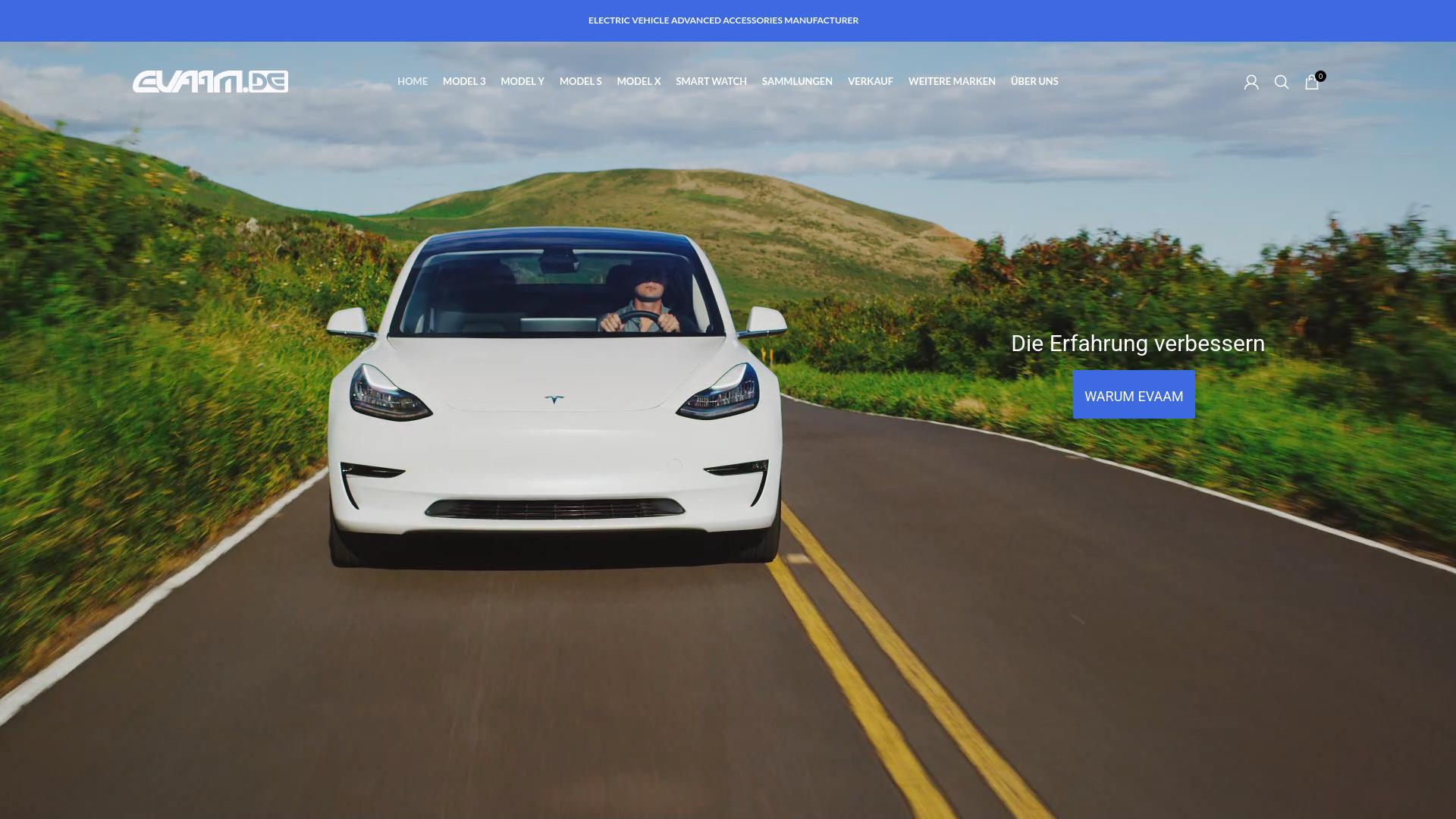 Die Webseite evam.de bietet eine Auswahl an Produkten und Zubehör für Elektrofahrzeuge an und richtet sich insbesondere an Besitzer von Tesla-Fahrzeugen. Auf der Seite sind verschiedene Fahrzeugmodelle gelistet, darunter Model 3, Model Y, Model S und Model X. Darüber hinaus werden Smartwatches erwähnt, die möglicherweise im Zusammenhang mit der Nutzung oder Überwachung von Elektrofahrzeugen stehen. Die Hauptnavigation der Webseite umfasst Menüpunkte wie „Home“, „Modelle“, „Smart Watch“, „Sammlungen“, „Verkauf“ und „Weitere Marken“. Unter den Modellkategorien könnten spezifische Produkte oder Zubehörteile für die jeweiligen Fahrzeugmodelle zu finden sein. Zusätzlich weist die Webseite einen Abschnitt „Über uns“ auf, in dem Informationen über das Unternehmen oder die Marke bereitgestellt sein könnten. Der Slogan „Die Erfahrung verbessern“ legt nahe, dass die angebotenen Produkte darauf abzielen, die Nutzung von Elektrofahrzeugen zu optimieren oder zu erweitern. Visuell wird ein modernes Fahrzeug in einer naturnahen Umgebung dargestellt, was darauf hindeutet, dass die Produkte möglicherweise für eine umweltbewusste Zielgruppe gedacht sind, die an der Nutzung von Elektrofahrzeugen interessiert ist. Grundsätzlich dient die Webseite als Plattform für den Verkauf von Elektrofahrzeugzubehör sowie möglicherweise verwandten Gadgets und Technologien, mit einem spezifischen Fokus auf Produkte, die die Bedienung oder das Fahrerlebnis von Elektrofahrzeugen verbessern sollen.