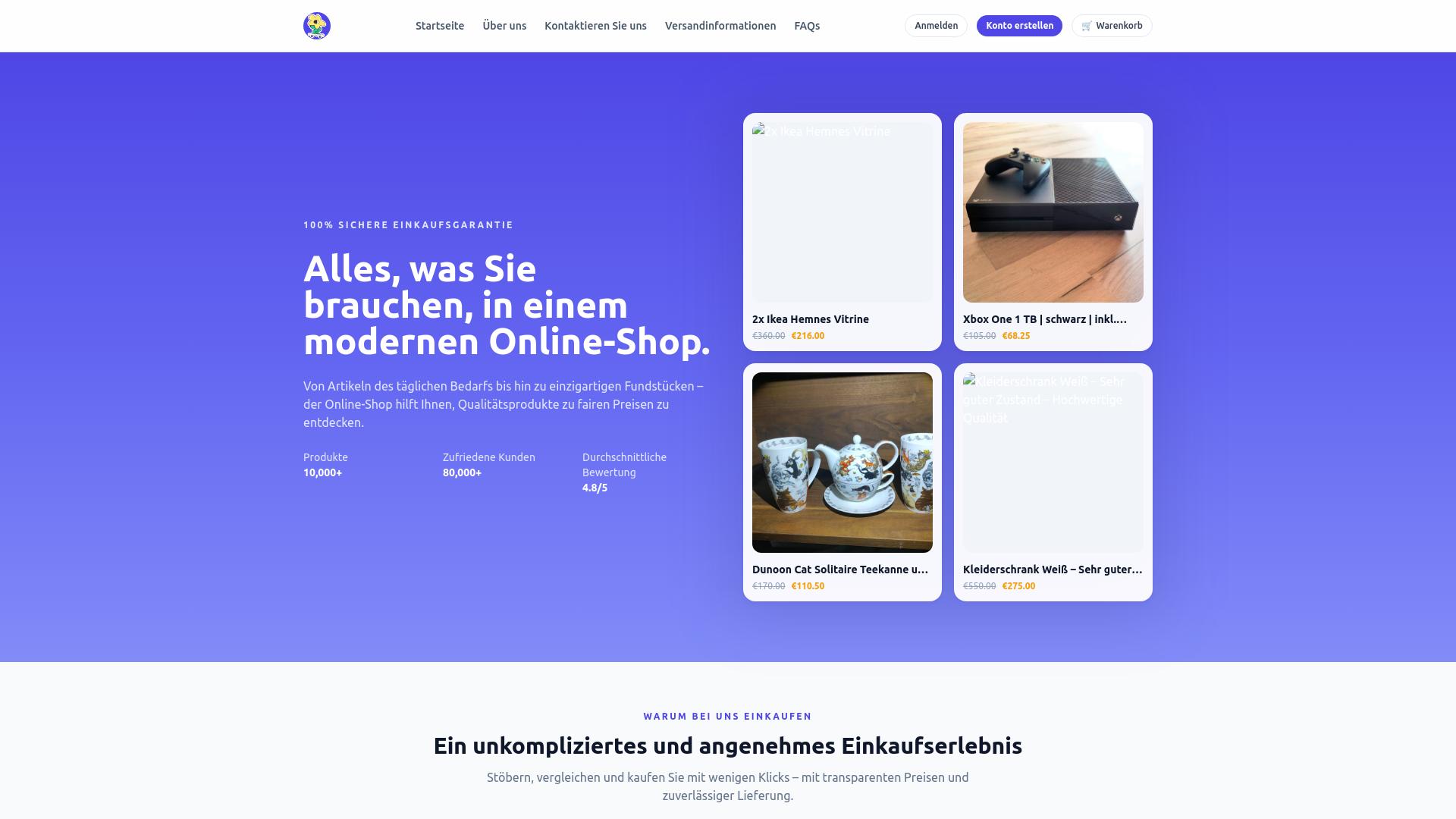 Die Webseite präsentiert sich als Online-Shop mit einer Vielzahl von Produkten, die in unterschiedlichen Kategorien angeboten werden. Der Fokus liegt auf Artikeln des täglichen Bedarfs sowie speziellen Fundstücken, die in dem Shop erhältlich sind. Die Seite weist darauf hin, dass eine große Auswahl an mehr als 10.000 Produkten bereitgestellt wird. Zu den Produkten, die auf der Webseite gelistet sind, gehören Möbel, Elektronik und Haushaltswaren. Beispiele aus den dargestellten Artikeln umfassen unter anderem Vitrinen, eine Xbox One Konsole und spezielle Teekannen. Die Preisgestaltung wird ebenfalls angesprochen und variiert je nach Produkt. Die angezeigten Preise sind in Euro angegeben und scheinen im Vergleich zu unverbindlichen Preisempfehlungen deutlich reduziert zu sein. Darüber hinaus wird die Kundenzufriedenheit in Zahlen ausgedrückt; angeben werden über 80.000 zufriedene Kunden sowie eine durchschnittliche Bewertung von 4,8 von 5 möglichen Punkten. Diese Informationen sind auf der Hauptseite sichtbar und sollen das Einkaufserlebnis hervorheben. Es werden keine spezifischen Informationen zu den Zahlungsmethoden oder Versanddetails bereitgestellt, jedoch wird auf die Möglichkeit hingewiesen, Kontakt mit dem Kundenservice aufzunehmen. Die Seite hebt hervor, dass sie eine 100%ige Einkaufs- und Datenverkehrsgarantie beinhaltet. Zudem werden keine persönlichen Informationen oder sensiblen Daten von den Nutzern verlangt, um die Sicherheit zu gewährleisten. Im unteren Bereich wird auf ein unkompliziertes Einkaufserlebnis verwiesen, welches das Stöbern, Vergleichen und den Kauf von Produkten in wenigen Klicks ermöglicht. Zusammenfassend bietet die Webseite eine breite Palette von Produkten für unterschiedliche Bedürfnisse an und betont dabei eine unkomplizierte Nutzung sowie die Zufriedenheit ihrer Kunden.