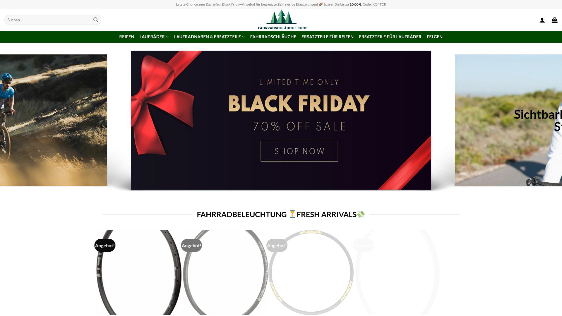 Die Webseite präsentiert eine Vielzahl von Produkten im Bereich Fahrradzubehör, insbesondere Reifen, Laufräder und Ersatzteile. Zu den Hauptkategorien gehören Reifen für verschiedene Fahrradtypen sowie Laufräder und entsprechende Ersatzteile. Zudem wird ein spezielles Angebot zur Black Friday-Aktion hervorgehoben, das Rabatte von bis zu 70 % verspricht. Im oberen Bereich der Seite ist ein Banner zu sehen, der auf die zeitlich begrenzte Rabattaktion hinweist. Neben den Angeboten für Reifen sind auch spezifische Produkte für Fahrradbeleuchtung zu finden, die unter einer Rubrik mit dem Titel „Fresh Arrivals“ aufgeführt sind. Diese Kategorie könnte neue Produkte oder aktuelle Trends im Bereich der Fahrradbeleuchtung darstellen. Die Seite ist übersichtlich strukturiert und bietet eine Suchfunktion, die es den Nutzern ermöglicht, gezielt nach bestimmten Produkten zu suchen. Verschiedene Produktkategorien sind klar gegliedert, was die Navigation durch das Angebot erleichtert. Darüber hinaus sind einige Produkte in den Kategorien mit dem Hinweis „Angebot“ gekennzeichnet, was darauf hindeutet, dass diese Artikel möglicherweise zu reduzierten Preisen angeboten werden. Es wird darauf hingewiesen, dass der Nutzer beim Einkaufen auf der Seite möglicherweise von speziellen Angeboten profitieren kann. Die Produktdarstellung könnte durch Bilder und kurze Beschreibungen erfolgen, um den Käufern eine informierte Kaufentscheidung zu ermöglichen. Insgesamt umfasst die Webseite eine breite Palette an Fahrradprodukten mit dem Fokus auf Funktionalität und Zubehör, die für Fahrradfahrer von Interesse sein können. Der Einsatz saisonaler Verkaufsaktionen könnte darauf abzielen, potenzielle Käufer zu attraktiven Käufen zu bewegen.