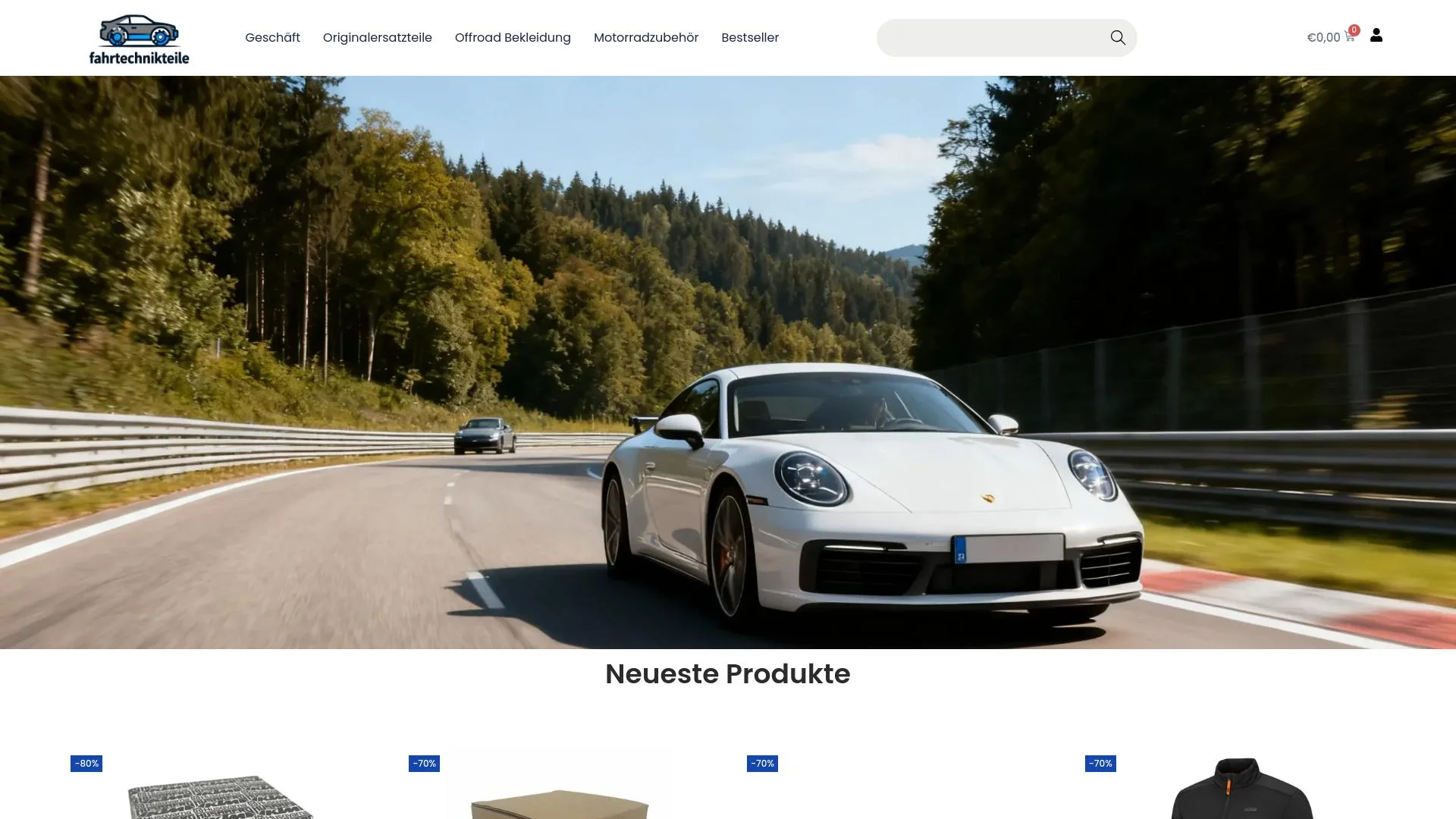Die Webseite „fahrtechnikteile“ bietet eine Vielzahl von Produkten im Bereich Autozubehör, darunter sowohl Originalersatzteile als auch spezielle Bekleidung für Offroad-Aktivitäten. Auf der Startseite sind verschiedene Kategorien und Angebote visuell hervorgehoben. Der Nutzer wird durch eine ansprechende Grafik begrüßt, die ein Fahrzeug in einer dynamischen Umgebung zeigt. Unter dem Bereich „Neueste Produkte“ werden aktuelle Artikel präsentiert, wobei einige von ihnen mit deutlichen Rabattinformationen versehen sind, die Preisnachlässe von bis zu 80% anzeigen. Dies schließt verschiedene Produktkategorien ein, wie z.B. Autoteile, die möglicherweise für die Wartung oder Verbesserung von Fahrzeugen gedacht sind, sowie Bekleidungsartikel, die anscheinend für den Einsatz in Offroad-Umgebungen konzipiert wurden. Zusätzlich gibt es einen spezifischen Abschnitt für Motorradzubehör, der Produkte für Motorradfahrer umfasst. Diese Kategorie könnte Artikel wie Bekleidungsstücke, Schutzgeräte und andere Zubehörteile beinhalten, die für die Sicherheit und den Komfort beim Fahren wichtig sein könnten. Es ist unklar, ob die angebotenen Artikel mit bestimmten Marken assoziiert sind oder ob sie generische Produkte darstellen. Die Webseite enthält auch Links zu weiteren Bereichen wie „Geschäft“, „Bestseller“ und „Originalersatzteile“, wodurch Nutzern ermöglicht wird, sich gezielt über die verfügbaren Angebote zu informieren oder schnell auf beliebte Produkte zugreifen zu können. Die Navigation scheint klar strukturiert, so dass Benutzer gezielt nach den gewünschten Artikeln suchen oder durch die verschiedenen Kategorien browsen können. Es wird kein spezifischer Hinweis auf Unternehmensinformationen oder Kundendienststrukturen gegeben, was für potenzielle Käufer relevant sein könnte, um bei Fragen oder Problemen Unterstützung zu erhalten. Die Inhalte auf der Seite sind insgesamt informativ gestaltet, um den Nutzern einen Überblick über die verfügbaren Produkte zu bieten.