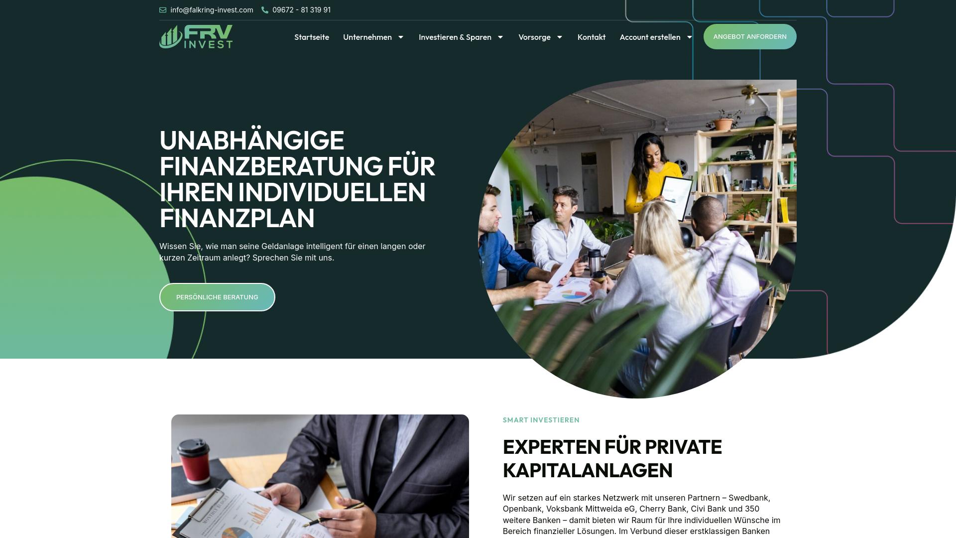 Die Webseite FRV Invest bietet Informationen und Dienstleistungen im Bereich der Finanzberatung an. Der Fokus liegt auf der individuellen Finanzplanung für private Anleger. Die Hauptangebote umfassen persönliche Beratung, um individuelle Geldanlage-Strategien für sowohl kurze als auch lange Zeiträume zu entwickeln. Die Seite beschreibt die Möglichkeit, die eigene Geldanlage intelligent zu gestalten und informiert die Nutzer darüber, wie sie ihre finanziellen Ziele erreichen können. Zudem wird auf eine enge Zusammenarbeit mit verschiedenen Banken und Finanzinstituten hingewiesen, um den Kunden maßgeschneiderte Lösungen anzubieten. Es wird betont, dass ein starkes Netzwerk von Partnerinstitutionen wie Swedbank, Volksbank Mittweida eG, Cherry Bank, Civi Bank und anderen Banken besteht, um den Kunden eine Vielzahl von Optionen in Bezug auf Kapitalanlagen zur Verfügung zu stellen. Unter dem Abschnitt „Persönliche Beratung“ wird die Möglichkeit hervorgehoben, direkt mit Finanzexperten in Kontakt zu treten, die den individuellen Finanzbedarf analysieren und entsprechende Empfehlungen aussprechen. Es gibt einen klaren Aufruf zur Kontaktaufnahme für die Anforderung eines Angebots. Die Seite enthält zusätzlich eine visuelle Darstellung, in der Personen in einem professionellen Umfeld bei einer Beratung zu sehen sind. Die Webseite ist so strukturiert, dass sie leicht navigierbar ist, mit ausgewiesenen Abschnitten für Informationen über das Unternehmen, Investitionen und Sparmöglichkeiten sowie Vorsorgeplanung. Ein Kontaktbereich ermöglicht es Nutzern, direkt mit den Beratern in Verbindung zu treten. Insgesamt bietet FRV Invest umfassende Informationen zu Finanzberatung und Kapitalanlagen, wobei der Schwerpunkt auf einer individuellen Herangehensweise liegt. Die Nutzer haben die Möglichkeit, sich über verschiedene Finanzprodukte und -dienstleistungen zu informieren und eine persönliche Beratung in Anspruch zu nehmen, um ihre finanziellen Strategien zu optimieren.