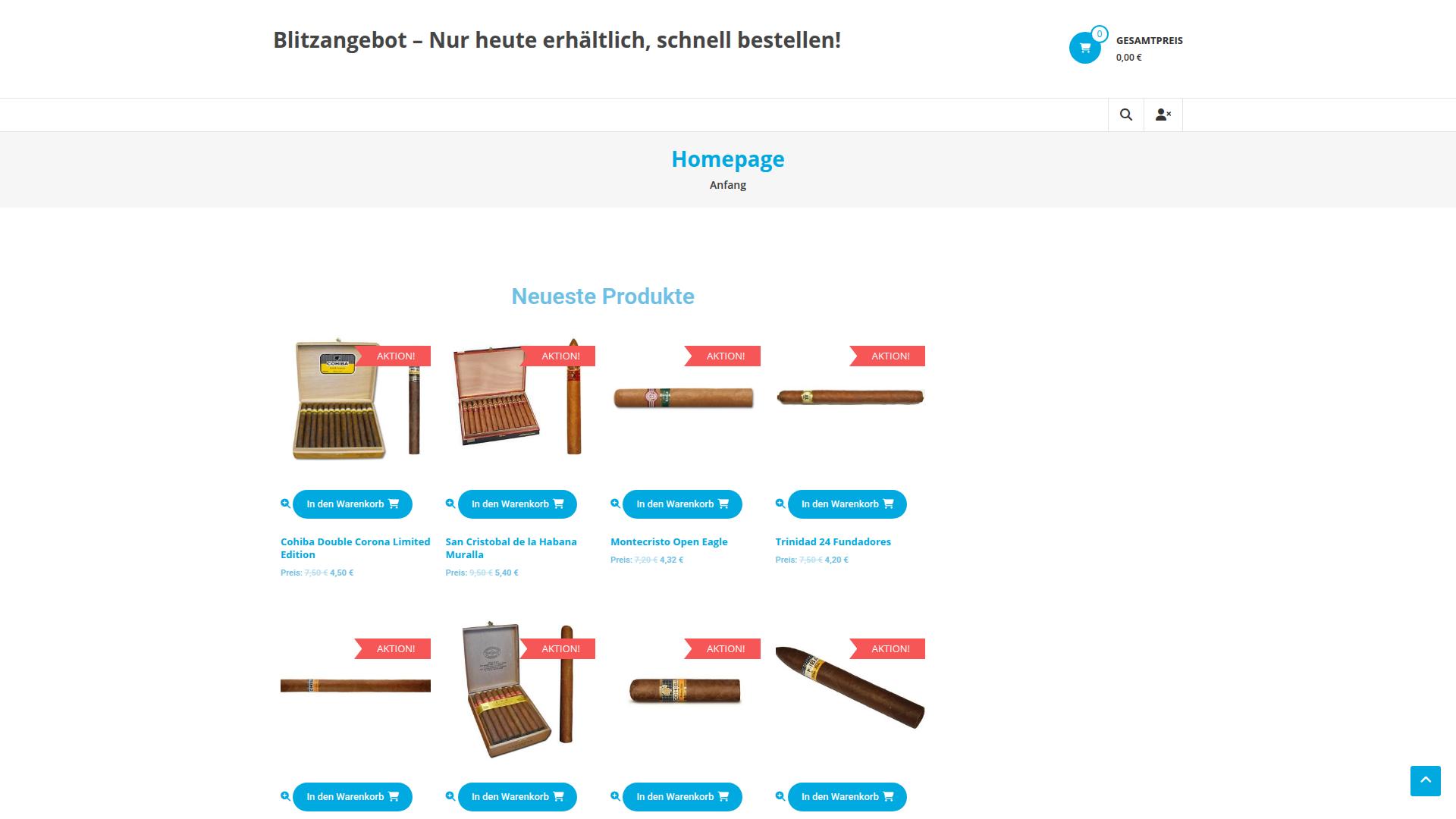 Die Webseite bietet eine Auswahl an Zigarren und Zigarrenboxen zum Verkauf an. Dabei wird ein spezielles Blitzangebot hervorgehoben, das die vermeintliche Dringlichkeit des Kaufs betont, indem es auf die Verfügbarkeit für den aktuellen Tag hinweist. Die Seite ist so gestaltet, dass die neuesten Produkte klar in einer Übersicht angezeigt werden. Unter den angebotenen Produkten sind verschiedene Zigarren zu finden, die jeweils einen Namen, eine kurze Beschreibung und einen Preis aufweisen. Zu den Produkten zählen unter anderem „Cohiba Double Corona Limited Edition“, „San Cristobal de la Habana Muralla“, „Montecristo Open Eagle“ und „Trinidad 24 Fundadores“. Diese Produkte haben jeweils einen Preis, der deutlich angezeigt wird. Außerdem gibt es für viele der angebotenen Artikel einen Button mit der Aufschrift „In den Warenkorb“, was darauf hinweist, dass die Seite eine Funktion zum Online-Kauf bietet. Neben den Produktinformationen sind in einigen Fällen auch Aktionshinweise zu finden, die auf spezielle Angebote hinweisen, welche für ein begrenztes Zeitfenster gelten könnten. Die gesamte Nutzeroberfläche ist ansprechend gestaltet und ermöglicht es Besuchern, durch verschiedene Produktkategorien zu navigieren. Es wird auch eine Gesamtpreisanzeige angezeigt, die den aktuellen Warenwert im Warenkorb darstellt. Die Benutzer können sich anmelden oder ein Nutzerkonto erstellen, um ihre Bestellung zu verwalten. Insgesamt konzentriert sich die Webseite auf den Verkauf von Zigarren und verwandten Produkten, präsentiert eine Vielzahl von Optionen und lockt mit zeitlich begrenzten Aktionen. Sie hat eine einfache Benutzeroberfläche, die den Nutzern den Zugang und die Auswahl der Produkte erleichtert.