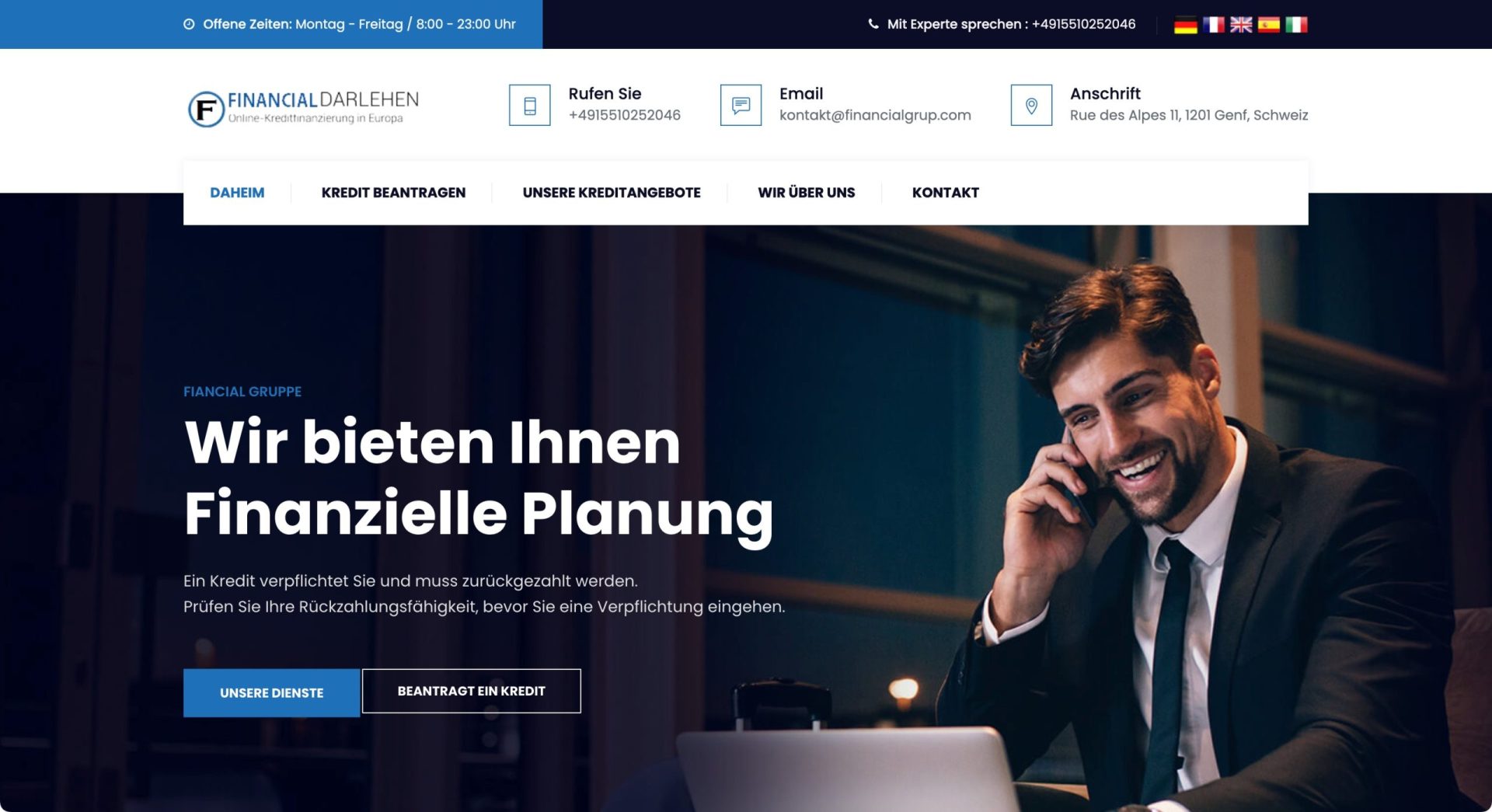 Die Webseite „financialdarlehen“ bietet Informationen und Dienstleistungen im Bereich der Kreditfinanzierung an. Auf der Startseite wird betont, dass die Webseite eine Plattform für finanzielle Planung ist. Es wird darauf hingewiesen, dass ein Kredit eine Verpflichtung darstellt, die zurückgezahlt werden muss, und dass Interessenten ihre Rückzahlungsfähigkeit prüfen sollten, bevor sie eine Verpflichtung eingehen. Die Hauptnavigation der Webseite umfasst mehrere Bereiche, darunter „Daheim“, „Kredit beantragen“, „Unsere Kreditangebote“, „Wir über uns“ und „Kontakt“. Diese Bereiche ermöglichen den Besuchern, sich umfassend über die angebotenen Dienstleistungen zu informieren und Anfragen zu stellen. Im Abschnitt „Unsere Dienste“ werden verschiedene Kreditangebote angepriesen. Detaillierte Informationen zu den verschiedenen Arten von Krediten sind hier möglicherweise zu finden, einschließlich der Voraussetzungen für die Beantragung und möglicher Zinssätze. Es wird empfohlen, sich vor der Beantragung eingehend mit den spezifischen Bedingungen und Anforderungen vertraut zu machen. Der Kontaktbereich der Webseite bietet verschiedene Kommunikationsmöglichkeiten. Nutzer können die angegebene Telefonnummer oder E-Mail-Adresse verwenden, um direkte Anfragen zu stellen. Des Weiteren wird eine physische Adresse in Genf, Schweiz, angegeben, was auf einen Standort des Unternehmens hinweist. Die Benutzeroberfläche der Webseite scheint mehrsprachig zu sein, mit Optionen, in verschiedenen Sprachen zu navigieren, darunter Deutsch, Englisch, Französisch, Spanisch und Italienisch. Dies deutet darauf hin, dass die Seite möglicherweise ein breiteres Publikum ansprechen möchte. Zusammenfassend lässt sich sagen, dass die Webseite „financialdarlehen“ eine Plattform ist, die verschiedene Kreditdienstleistungen und Informationen zu finanzieller Planung anbietet. Nutzer haben die Möglichkeit, Kredite zu beantragen und Informationen über die Seite und die Kontaktmöglichkeiten zu erhalten.