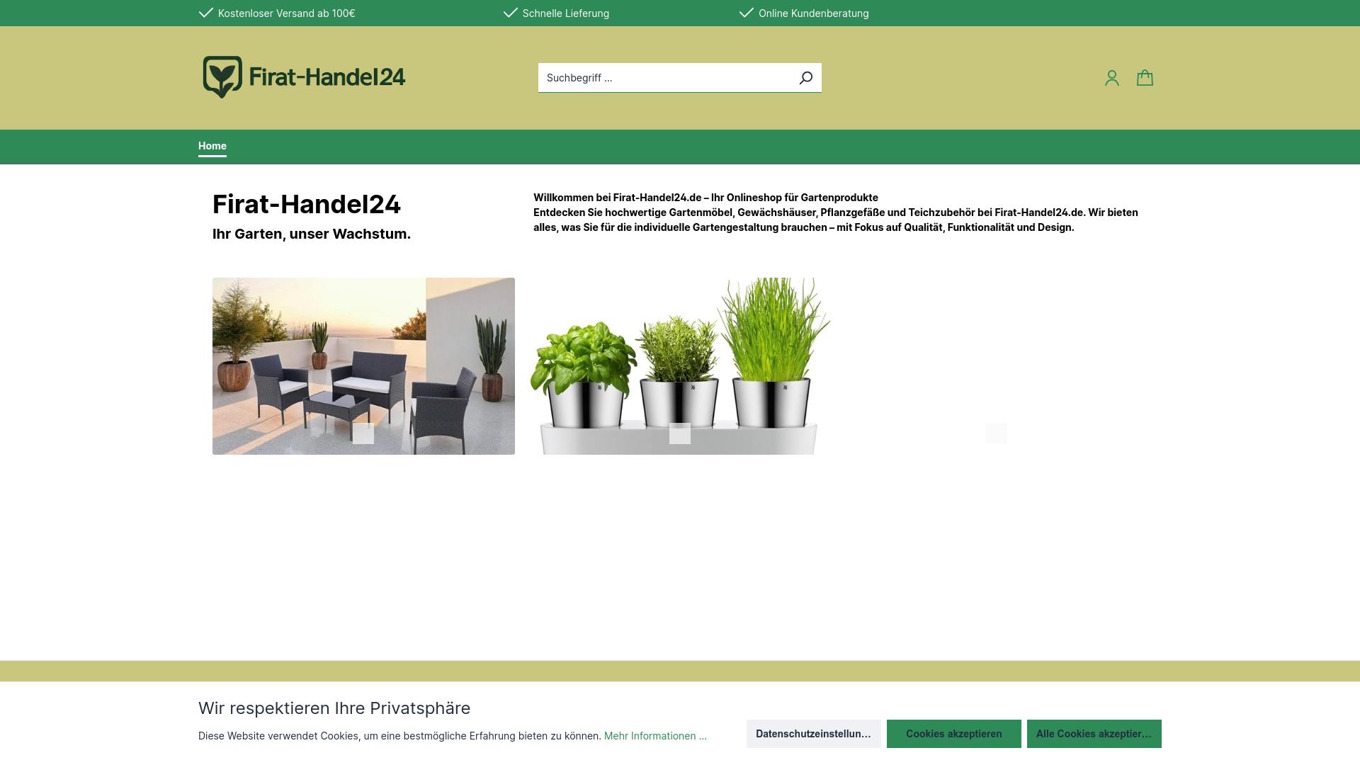 Die Webseite „Firat-Handel24“ präsentiert sich als Online-Shop für Gartenprodukte. Das Angebot umfasst eine Vielzahl von Gartenmöbeln, Gewächshäusern, Pflanzgefäßen und Teichzubehör. Zielgruppe sind insbesondere Gartenbesitzer und Gartenliebhaber, die ihre Außenbereiche gestalten und ausstatten möchten. Auf der Homepage betont die Webseite den Fokus auf Qualität, Funktionalität und Design ihrer Produkte. Es wird darauf hingewiesen, dass sowohl ästhetische als auch praktische Bedürfnisse berücksichtigt werden. Die Bilder auf der Seite zeigen verschiedene Gartenmöbel, darunter Sitzgruppen und Pflanzenbehälter, die zur Gestaltung von Terrassen, Balkonen und Gärten geeignet sind. Des Weiteren hebt die Webseite Annehmlichkeiten wie kostenlosen Versand ab einem Bestellwert von 100 Euro und schnelle Lieferzeiten hervor. Eine Online-Kundenberatung wird ebenfalls angeboten, was darauf hinweist, dass Nutzer bei der Auswahl ihrer Produkte Unterstützung in Anspruch nehmen können. Die Struktur der Seite erlaubt es den Nutzern, unkompliziert nach Produkten zu suchen, und es gibt offensichtlich Kategorien, die die Navigation für interessierte Käufer erleichtern sollen. Die Nutzung von Cookies wird erwähnt, um die Benutzererfahrung zu optimieren. Zusammenfassend bietet die Webseite eine variierte Palette an Gartenprodukten und legt Wert auf eine ansprechende Präsentation der Artikel sowie auf zusätzliche Dienstleistungen zur Unterstützung der Kunden. Eine detaillierte Produktbeschreibung oder spezifische Informationen zu Preisen und Verfügbarkeit wurden im Screenshot nicht bereitgestellt. Die Webseite scheint darauf ausgelegt zu sein, potenzielle Kunden zur Stöber und zum Kauf zu animieren.
