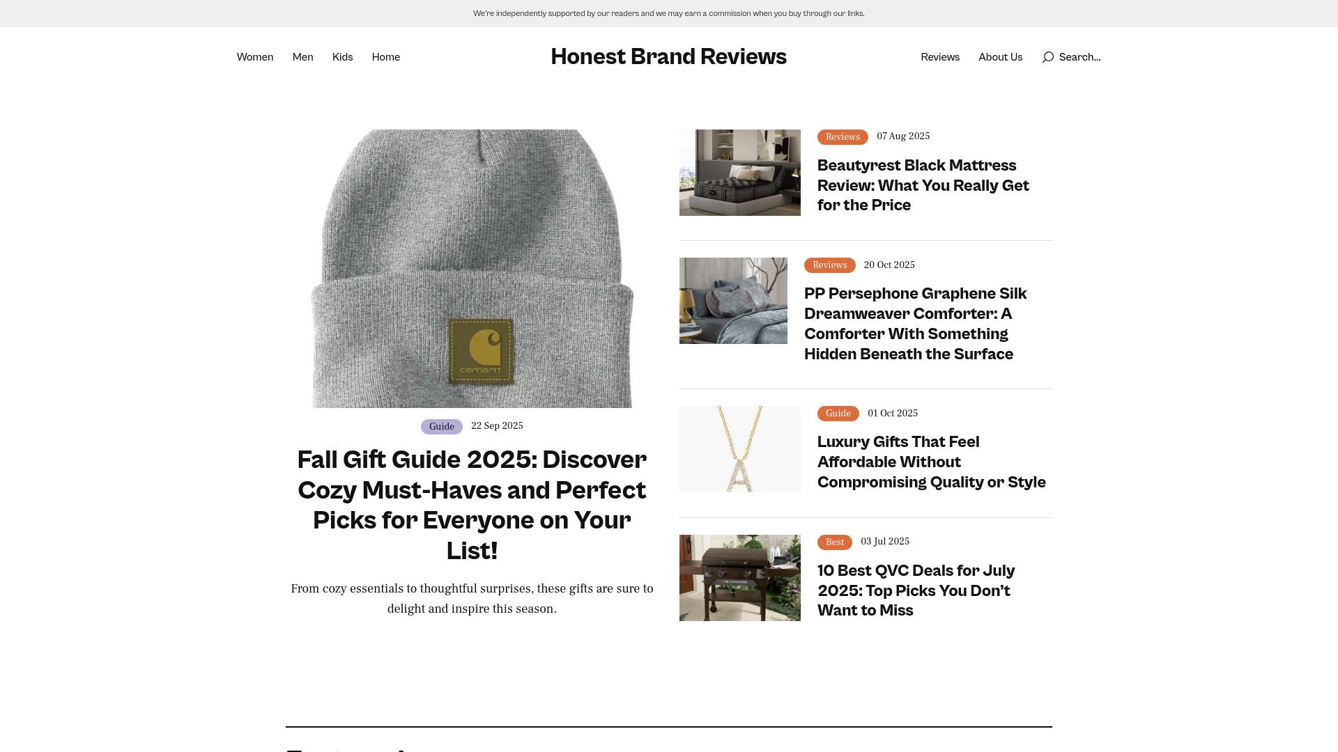 Die Webseite „Honest Brand Reviews“ präsentiert eine Vielzahl von Inhalten, die sich auf Produktbewertungen und Kaufanleitungen konzentrieren. Sie ist in mehrere Kategorien unterteilt, darunter Frauenmode, Herrenmode, Kinderbekleidung und Haushaltswaren. Die Seite enthält verschiedene Artikel und Anleitungen, die darauf abzielen, den Lesern bei der Auswahl von Produkten zu helfen. Ein Beispiel für die Inhalte auf der Seite ist der Artikel „Fall Gift Guide 2025“, der Empfehlungen für Geschenke zu verschiedenen Anlässen bietet. In diesem Leitfaden wird eine Auswahl an Produkten präsentiert, die als nützliche oder angenehme Geschenke gelten. Darüber hinaus gibt es mehrere Produktbewertungen, die spezifische Artikel im Detail untersuchen. Einige der bewerteten Produkte umfassen Matratzen und Bettwäsche, wie beispielsweise die „Beautyrest Black Mattress“ und der „PP Persephone Graphene Silk Dreamweaver Comforter“, die jeweils in eigenen Rezensionen behandelt werden. Die Bewertungen sind darauf ausgelegt, den Lesern eine informierte Kaufentscheidung zu ermöglichen, indem sie Informationen über die Vor- und Nachteile der jeweiligen Produkte bereitstellen. Die Webseite enthält auch spezielle Leitfäden wie „Luxury Gifts That Feel Affordable Without Compromising Quality or Style“, in dem Produkte vorgestellt werden, die als erschwinglich gelten, ohne an Qualität oder Stil einzubüßen. Des Weiteren wird eine Liste von „Best QVC Deals“ angeboten, um den Lesern Einblicke in aktuelle Angebote und Schnäppchen zu gewähren. Die Struktur der Webseite ist benutzerfreundlich gestaltet, mit einer klaren Navigation, die es den Nutzern ermöglicht, schnell zu den gewünschten Informationen zu gelangen. In den Artikelüberschriften werden sowohl Produktbewertungen als auch Kaufempfehlungen aufgeführt, was dem Leser hilft, sich in den verschiedenen Themenbereichen zurechtzufinden. Insgesamt bietet die Webseite eine Sammlung verschiedener Inhalte, die den Lesern nützliche Informationen zu einer Vielzahl von Produkten und Dienstleistungen bereitstellt.
