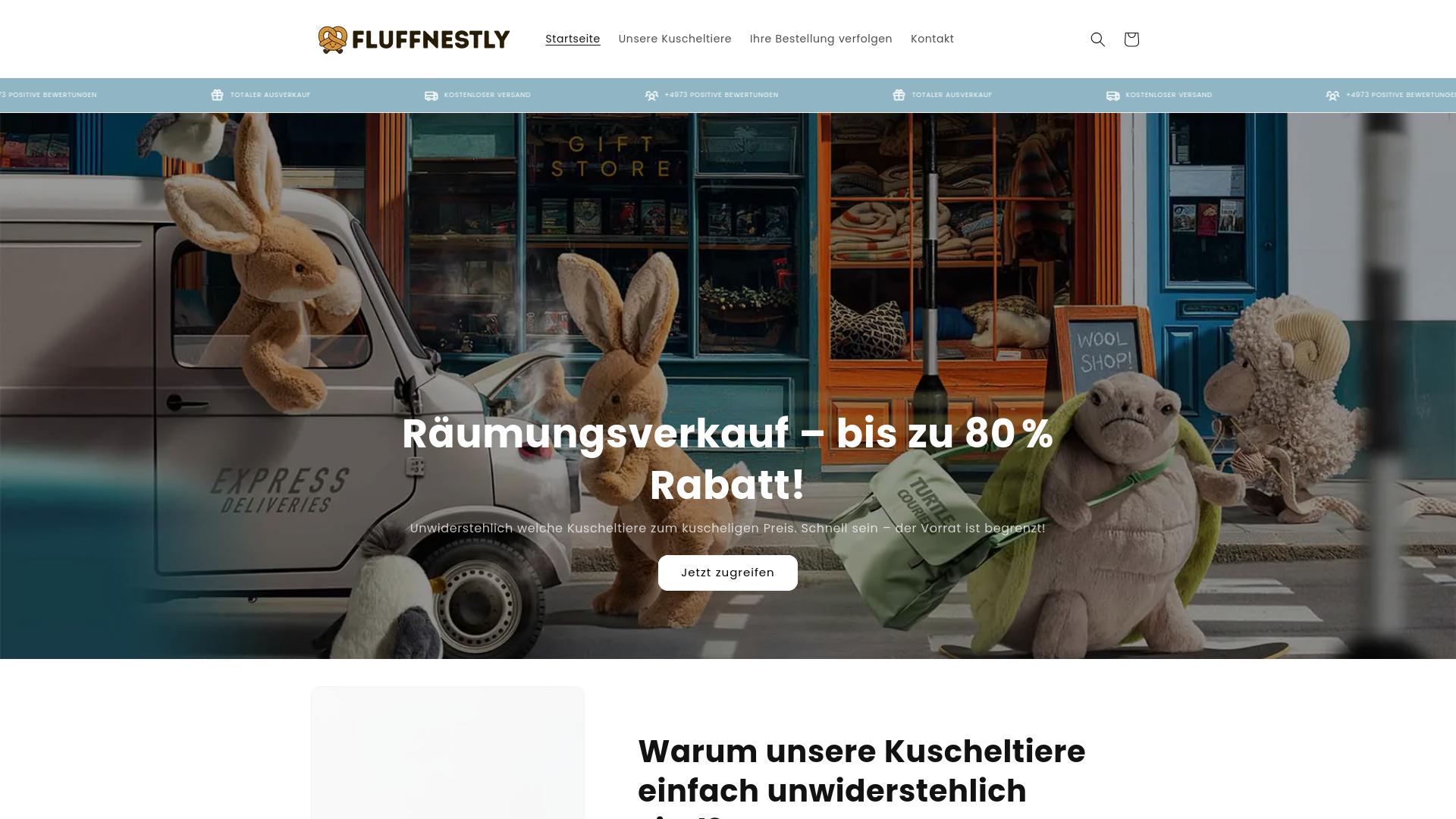Die Webseite „Fluffnestly“ präsentiert eine Verkaufsaktion, die auf einen Räumungsverkauf mit Rabatten von bis zu 80 % hinweist. Der zentrale Fokus liegt auf dem Angebot von Kuscheltieren, die in verschiedenen Ausführungen und Designs dargestellt werden. Die Seite bietet eine benutzerfreundliche Navigation, die es Nutzern ermöglicht, durch verschiedene Kategorien von Kuscheltieren zu stöbern. Zusätzlich gibt es einen Abschnitt, der die Vorteile der angebotenen Kuscheltiere thematisiert. In diesem Kontext wird eine Beschreibung angeboten, warum die Produkte als besonders ansprechend oder begehrenswert angesehen werden könnten, ohne jedoch spezifische Details zu den Materialien oder Herstellungsverfahren zu geben. Die Website hebt den Aspekt des kostenlosen Versands hervor, was den Nutzern potenziell eine kostengünstigere Bestelloption bietet. In der oberen Navigationsleiste sind Links zu weiteren Informationen über die angebotenen Kuscheltiere sowie die Möglichkeit zur Verfolgung von Bestellungen zu finden. Dies deutet darauf hin, dass Nutzer nach dem Kauf den Lieferstatus ihrer Bestellungen nachvollziehen können. Darüber hinaus wird eine große Anzahl positiver Bewertungen vermeldet, die auf Kundenzufriedenheit ausgerichtet sind. Diese Bewertungen könnten angesichts der Verkaufsaktionen und Rabatte das Kundeninteresse erhöhen. Die Präsentation der Kuscheltiere erfolgt durch ansprechende visuelle Darstellungen, die die Produkte in verschiedenen Farben und Formen zeigen. Es wird geraten, bei Interesse schnell zu handeln, da eine Verknappung des Bestandes kommunikativ in den Vordergrund gerückt wird. Die Webseite vermittelt einen Eindruck von Dringlichkeit, was weitere Nutzer dazu anregen könnte, sich zeitnah mit den Angeboten auseinanderzusetzen. Zusammenfassend bietet „Fluffnestly“ ein Sortiment an Kuscheltieren zu reduzierten Preisen, ansprechend gestaltet für potenzielle Käufer. Die Webseite enthält Informationen zu den Produkten, einschließlich der Verkaufsaktionen und der Möglichkeit, Bestellungen zu verfolgen, ohne eine detaillierte Aufschlüsselung zu den spezifischen Angeboten oder der Unternehmensstruktur bereitzustellen.