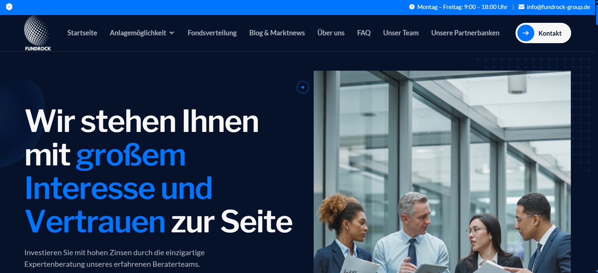 Die Webseite Fundrock bietet Informationen und Dienste, die sich auf Investitionen konzentrieren. Auf der Startseite wird ein Angebot zur Geldanlage hervorgehoben, das laut der Darstellung hohe Zinsen verspricht. Die Webseite verweist auf eine „einzigartige Expertenberatung“, die durch ein erfahrenes Beraterteam bereitgestellt wird. Zielgruppe sind offenbar potenzielle Anleger, die an hochwertigen Renditen interessiert sind. Im Menü der Webseite sind verschiedene Bereiche zugänglich, darunter Informationen zu Anlagemöglichkeiten, Fondsverteilungen sowie aktuelle Blogbeiträge und Marktanalysen. Diese unterschiedlichen Kategorien deuten darauf hin, dass die Webseite sowohl informative als auch strategische Inhalte für Investoren bereithält. Ein FAQ-Bereich ist ebenfalls vorhanden, der häufige Fragen zu den angebotenen Dienstleistungen beantwortet. Die Webseite enthält zudem Informationen über das Team hinter Fundrock und deren Partnerbanken, was darauf hinweist, dass Glaubwürdigkeit und Unterstützung durch etablierte Institutionen Teil des Angebots sind. Kontaktmöglichkeiten sind angegeben, um den direkten Austausch mit den Beratern zu erleichtern. Die visuelle Gestaltung der Webseite ist professionell, und es wird Wert auf eine ansprechende Präsentation gelegt. Bildmaterial zeigt offenbar Teammitglieder in einem Geschäftsumfeld, was den Eindruck von Seriosität und Professionalität verstärken könnte. Die Nutzung der Webseite und die angebotenen Dienstleistungen scheinen darauf abzuzielen, Benutzer in ihre finanziellen Entscheidungen zu unterstützen. Es wird eine Kontaktzeit für Anfragen angegeben, was darauf hindeutet, dass eine proaktive Kommunikation mit Interessierten vorgesehen ist. Zusammenfassend bietet die Webseite Fundrock eine Plattform für Investitionen mit besonderen Fokus auf hohe Zinsen und Expertenberatung, während sie verschiedene Informationen und Ressourcen für Anleger bereitstellt.