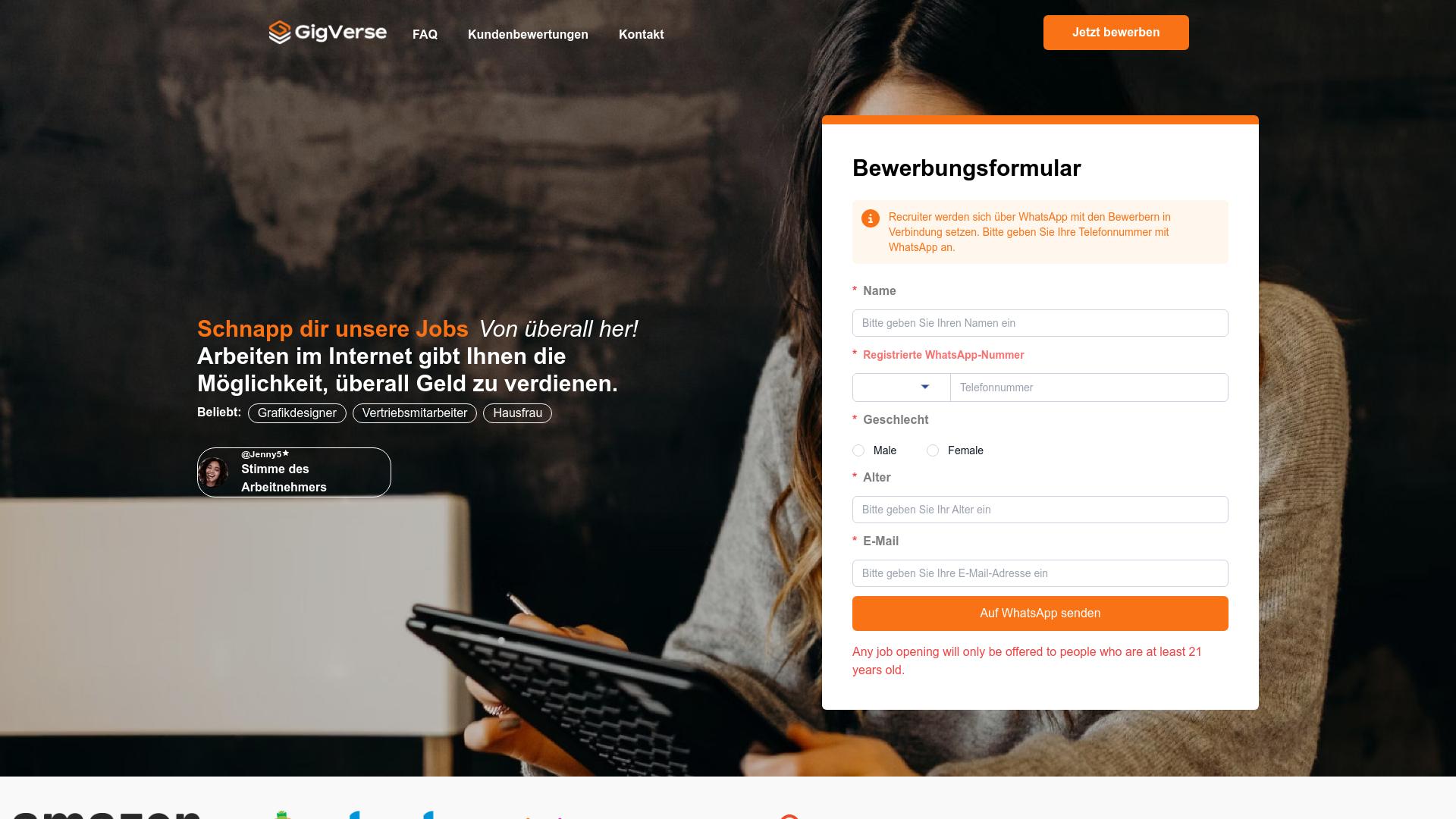 Die Webseite „GigVerse“ präsentiert sich als Plattform, die es Nutzern ermöglicht, online Jobs zu finden und Geld zu verdienen. Die Hauptaussage auf der Seite lautet, dass Arbeiten im Internet eine preiswerte Möglichkeit bietet, von überall aus Einkommen zu erzielen. Auf der Website werden verschiedene Jobkategorien hervorgehoben, darunter Berufe wie Grafikdesigner, Vertriebsmitarbeiter und Hausfrau. Diese Kategorien scheinen darauf abzuzielen, ein breites Spektrum an potenziellen Jobs anzubieten, die für unterschiedliche Interessengruppen und Qualifikationen geeignet sind. Die Plattform betont die Flexibilität des Arbeitens von jedem Ort aus und spricht damit insbesondere Menschen an, die nach heimischen oder ortsunabhängigen Arbeitsmöglichkeiten suchen. Zusätzlich enthält die Webseite ein Bewerbungsformular, das von Interessierten ausgefüllt werden kann. Das Formular fragt nach persönlichen Daten wie Name, registrierter WhatsApp-Nummer, Geschlecht, Alter und E-Mail-Adresse. Der Hinweis, dass die Kommunikation der Recruiter über WhatsApp erfolgt, könnte darauf hindeuten, dass der Kontakt zu Bewerbern in einer eher informellen und schnellen Weise hergestellt wird. Das Layout der Webseite ist übersichtlich gestaltet und legt den Fokus auf die Bewerbung für die ausgeschriebenen Jobs. Ein Button mit der Aufschrift „Jetzt bewerben“ ist prominent platziert, um die Nutzer zur Einreichung ihrer Bewerbung zu ermutigen. Das ansprechende Design und die klare Struktur könnten darauf abzielen, den Nutzern ein einfaches und effizientes Erlebnis zu bieten. Bartbereiche wie „FAQ“, „Kundenbewertungen“ und „Kontakt“ sind ebenfalls vorhanden, bieten aber keine tiefergehenden Informationen zu den spezifischen Möglichkeiten oder zu Rückmeldungen von bisherigen Nutzern. Die Webseite enthält zudem einen Hinweis, dass die Stellenangebote ausschließlich für Personen ab 21 Jahren verfügbar sind. Dies könnte ein Indiz für die Zielgruppe sein, die die Plattform ansprechen möchte. Insgesamt handelt es sich um eine Plattform, die Nutzern die Möglichkeit bieten möchte, online zu arbeiten, wobei der Schwerpunkt auf einem einfachen Bewerbungsprozess liegt.