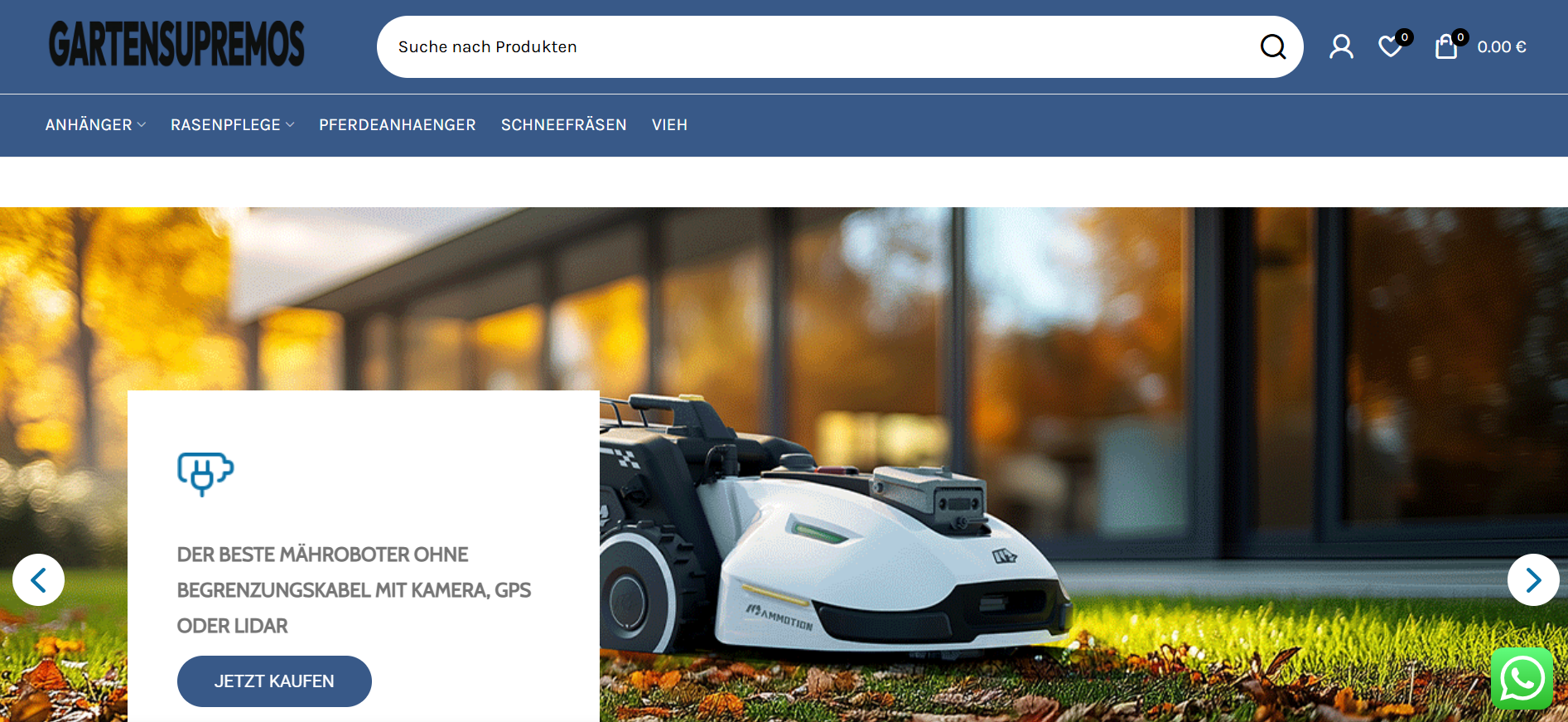 Die Webseite „gartensupremos“ bietet verschiedene Produkte im Bereich Gartenpflege und -ausstattung an. Im Fokus stehen insbesondere Mähroboter, die als kabellose Modelle mit moderner Technologie angekündigt werden. Es wird beworben, dass diese Mähroboter mit Funktionen wie integrierter Kameratechnologie, GPS und Lidar ausgestattet sind, wodurch sie laut Angaben des Anbieters in der Lage sein sollen, effizient und autonom zu arbeiten. Zusätzlich stellt die Website Kategorien zur Auswahl, darunter Anhänger, Rasenpflegegeräte, Pferdeanhänger, Schneefräsen und Viehgeräte. Diese Produktkategorien decken ein breites Spektrum an landwirtschaftlichen und gärtnerischen Bedürfnissen ab. Die Webseite bietet Benutzern die Möglichkeit, nach spezifischen Produkten zu suchen oder durch die verschiedenen Kategorien zu navigieren, um die gewünschten Artikel leichter zu finden. Die Benutzeroberfläche ist übersichtlich gestaltet, mit einer sichtbaren Suchleiste, die es den Anwendern ermöglicht, gezielt nach Produkten zu suchen. Für jedes Produkt auf der Webseite erhält der Nutzer grundlegende Informationen, die ihn über die Hauptmerkmale und Spezifikationen informieren sollen. Die Seite enthält auch einen „Jetzt kaufen“-Button für die Produkte, was darauf hinweist, dass ein Online-Kauf möglich ist. Informationen über Zahlungsoptionen oder Versandmodalitäten sind auf den ersten Blick nicht zu erkennen. Es gibt zudem einen Hinweis auf eine Kontaktmöglichkeit über WhatsApp, um Unterstützung zu erhalten oder Fragen zu klären, was auf eine aktive Kundeninteraktion hinweist. Insgesamt bietet die Webseite eine umfangreiche Auswahl an Geräten und Maschinen, die für die Garten- und Landwirtschaft nützlich sein könnten, wobei der Hauptfokus auf automatisierten Lösungen zur Pflege von Rasenflächen liegt. Weitere Informationen zu Preisen, Garantiebedingungen oder Kundenbewertungen sind nicht ersichtlich und könnten für Käufer von Interesse sein.