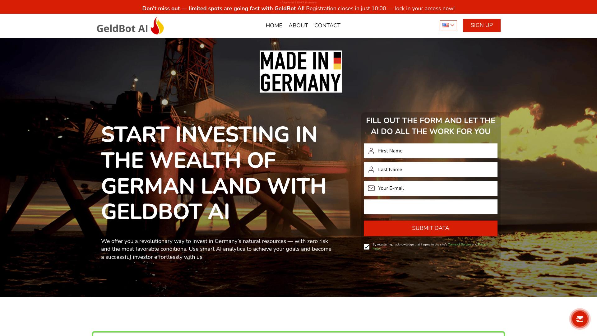 Die Webseite GeldBot AI bietet Nutzern die Möglichkeit, in die Ressourcen des deutschen Landes zu investieren. Auf der Startseite wird ein klarer Fokus auf die Verwendung von Künstlicher Intelligenz gelegt, um den Investitionsprozess zu optimieren. Die Seite hebt hervor, dass die Investition mit minimalem Risiko verbunden sein soll und bietet eine „revolutionäre“ Methode für Interessierte an, die durch den Einsatz intelligenter Analytik ihre finanziellen Ziele erreichen möchten. Das Layout der Seite ist ansprechend gestaltet und enthält Bilder, die mit natürlichen Ressourcen und Investitionen assoziiert werden, um eine visuelle Verbindung zur Thematik herzustellen. Auf der Startseite werden auch Aufforderungen eingebunden, die Nutzer dazu anregen, ein Formular auszufüllen, um weiterführende Informationen zu erhalten oder sich zu registrieren. Es wird angegeben, dass durch die Registrierung eine Anpassung des Investitionsprozesses an die individuellen Ziele des Nutzers möglich sei. Ein besonderer Punkt, der hervorgehoben wurde, ist die Aussage, dass die Nutzer durch den Einsatz von GeldBot AI „das gesamte Arbeiten“ überlassen könnten, was den Eindruck vermittelt, dass die Plattform eine automatisierte Lösung für Investitionen bietet. Darüber hinaus wird eine Dringlichkeit durch limitierte Plätze in dem Programm suggeriert, was eine schnelle Entscheidungsfindung der Nutzer anregen könnte. Insgesamt enthält die Webseite Elemente wie ein Anmeldeformular, das nach den persönlichen Daten der Nutzer fragt, wie Namen und E-Mail-Adresse. Dies könnte darauf hinweisen, dass personenbezogene Daten gesammelt werden, um die gewünschten Dienstleistungen anzubieten. Die Seite weist auch auf eine Datenschutzrichtlinie hin, die jedoch nur durch Zustimmung in der Registrierung akzeptiert werden kann. In der Fußzeile der Webseite sind Links zu den allgemeinen Geschäftsbedingungen und zur Datenschutzpolitik vorhanden, die zusätzliche Informationen zu den rechtlichen Aspekten der Nutzung der Plattform bieten könnten. Die Darstellung legt einen starken Fokus auf die vermeintlichen Vorteile und Chancen der Investition, während spezifische Details zu den angebotenen Dienstleistungen und dem Investitionsansatz in der Hauptbeschreibung weniger ausgeführt sind.