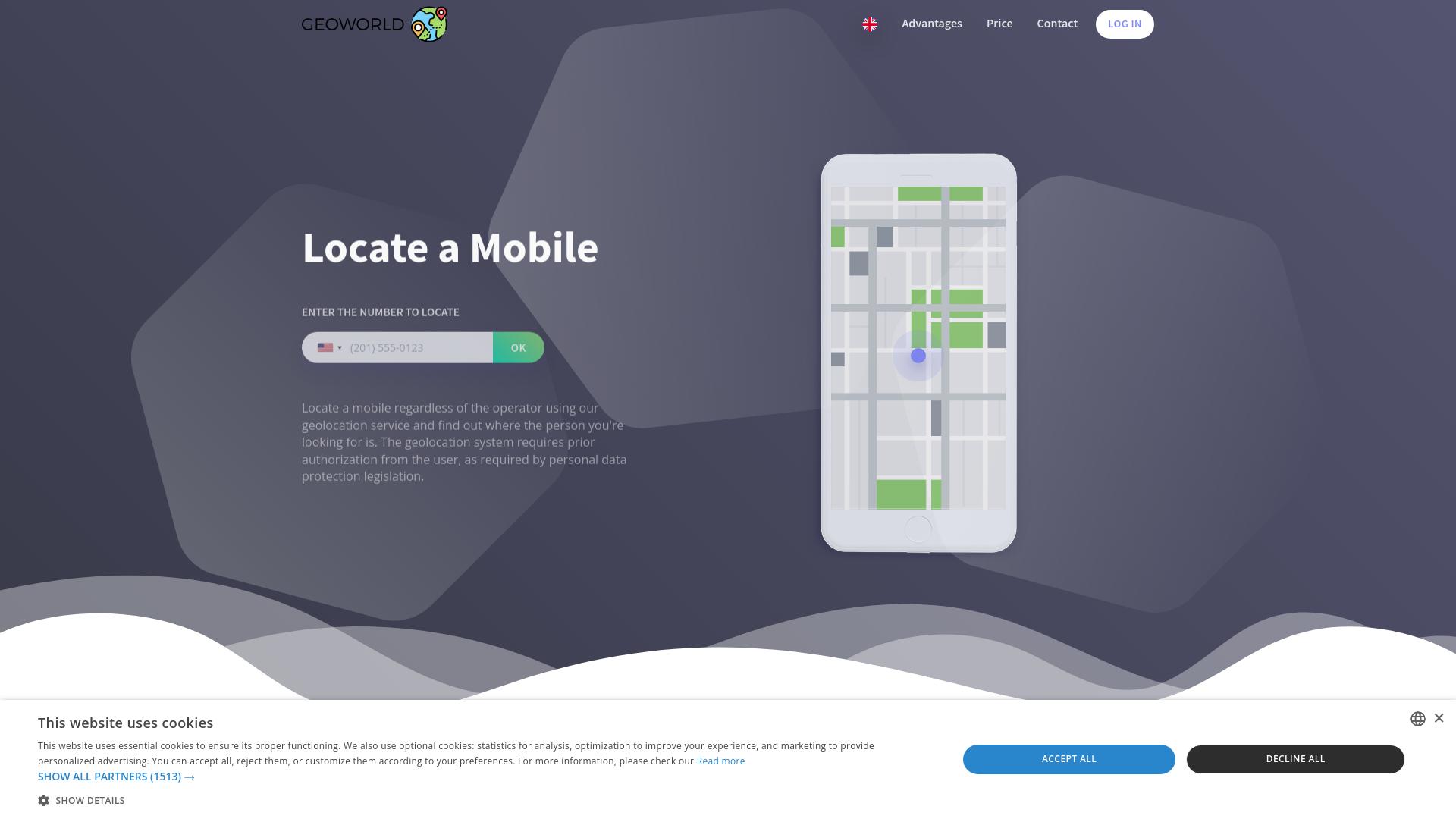 Die Webseite „geoworld“ bietet einen Dienst zur Lokalisierung von Mobiltelefonen an. Auf der Startseite wird ein Eingabefeld bereitgestellt, in das Nutzer die Telefonnummer eingeben können, die sie lokalisieren möchten. Das System behauptet, dass es möglich ist, die Position eines Mobiltelefons unabhängig vom Mobilfunkanbieter zu ermitteln. Zusätzlich wird darauf hingewiesen, dass zur Nutzung des Geolokalisierungsdienstes eine vorherige Autorisierung vom Nutzer erforderlich ist, was durch Datenschutzgesetze geregelt ist. Es wird nicht näher ausgeführt, wie genau dieser Prozess der Lokalisierung abläuft oder welche Technologien dabei zum Einsatz kommen. Im oberen Bereich der Webseite finden sich weitere Navigationsmöglichkeiten, darunter Links zu den Bereichen Vorteile („Advantages“), Preisgestaltung („Price“) und Kontakt („Contact“). Diese Optionen deuten darauf hin, dass die Webseite möglicherweise zusätzliche Informationen über die angebotenen Dienstleistungen bereitstellt, jedoch sind diese Bereiche nicht konkret beschrieben. Die Webseite informiert zudem darüber, dass Cookies verwendet werden, um die Funktionalität der Seite zu gewährleisten und um statistische Daten sowie Marketingdienstleistungen anzubieten. Nutzer haben die Option, die Verwendung von Cookies zu akzeptieren oder abzulehnen, wobei eine detaillierte Auswahl an Partnern zur Verfügung steht, die Cookies verwenden könnten. Das Design der Webseite ist modern und ansprechend, mit einer klaren Benutzeroberfläche, die visuelle Elemente wie eine Karte anzeigt, um die Funktionalität des Dienstes zu veranschaulichen. Zusammengefasst handelt es sich bei geoworld um eine Webseite, die Nutzern die Möglichkeit bietet, die Position von Mobiltelefonen zu ermitteln, wobei die genauen Abläufe und Bedingungen für die Nutzung der Dienstleistung nicht umfassend erklärt werden.