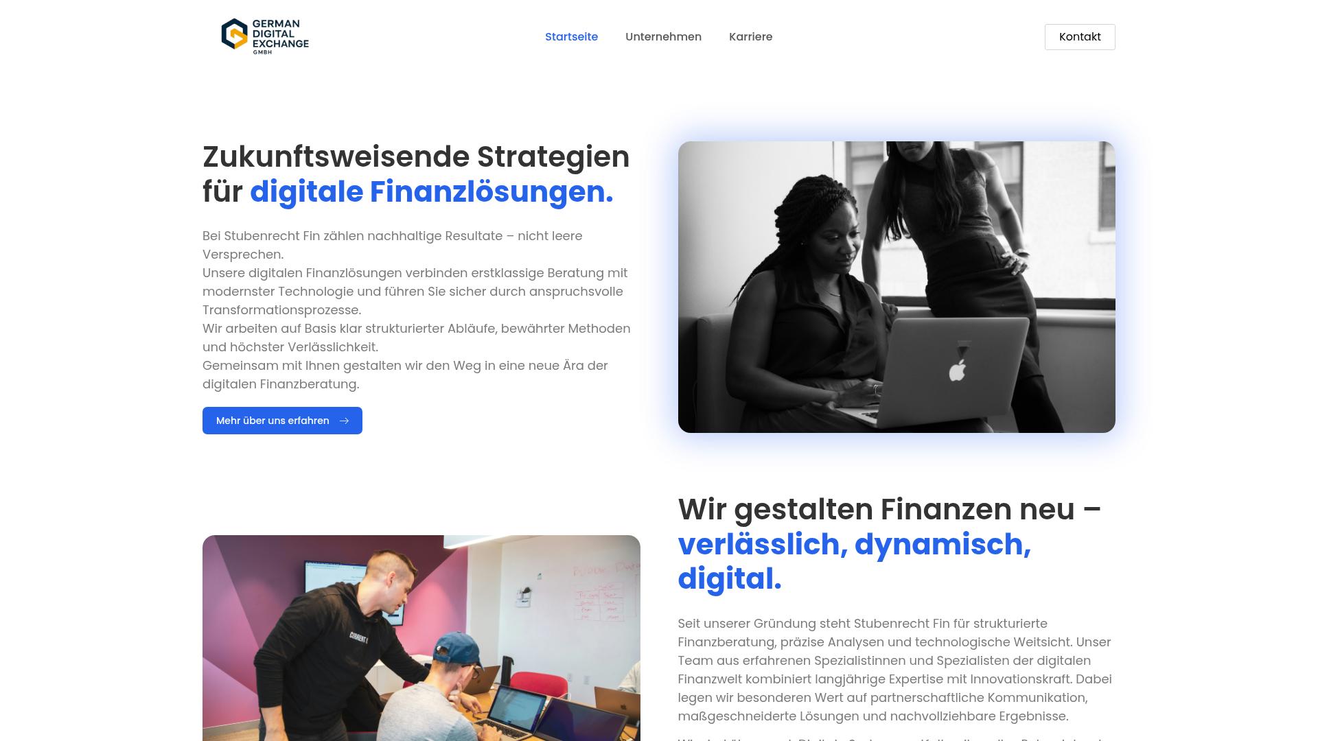 Die Webseite German Digital Exchange GmbH präsentiert sich als Anbieter von digitalen Finanzlösungen. Im Fokus steht die Verbindung von moderner Technologie und traditioneller Finanzberatung, um Kunden durch Transformationsprozesse zu begleiten. Die Plattform hebt hervor, dass sie ihren Ansatz auf klar strukturierten Abläufen und bewährten Methoden aufbaut, wobei ein Schwerpunkt auf Zuverlässigkeit gelegt wird. Das Unternehmen beschreibt seine Dienstleistungen als zukunftsweisend und nimmt Bezug auf vielfältige Strategien im Bereich digitaler Finanzlösungen. Dabei wird betont, dass man mit den Kunden zusammenarbeitet, um neue Wege in der digitalen Finanzberatung zu erschließen. Die Webseite beinhaltet auch Informationen über das Team, das aus erfahrenen Spezialisten besteht, die über langfristige Expertise in der Finanzwelt sowie über technologische Kenntnisse verfügen. Zusätzlich wird erwähnt, dass das Unternehmen einen partnerschaftlichen Kommunikationsstil pflegt, der darauf abzielt, maßgeschneiderte Lösungen zu entwickeln und nachvollziehbare Ergebnisse zu erzielen. Der Ansatz scheint sowohl präzise Analysen als auch technologische Weitsicht zu umfassen, was darauf hindeutet, dass die Dienstleistungen auf den spezifischen Bedarf der Kunden abgestimmt sind. Die Seite bietet mehrere Navigationspunkte, darunter Optionen wie „Startseite“, „Unternehmen“, „Karriere“ und „Kontakt“, was darauf hindeutet, dass potenzielle Interessenten Informationen über die Unternehmensstruktur, offene Stellen und Möglichkeiten zur Kontaktaufnahme erhalten können. Bilder auf der Seite zeigen Teaminteraktionen und Arbeitsprozesse, die eine professionelle Umgebung darstellen. Insgesamt vermittelt die Webseite Informationen zu den angebotenen Dienstleistungen im Bereich der digitalen Finanzberatung, ohne dabei spezifische Details zu den angebotenen Produkten oder Preisen zu nennen. Die Inhalte erscheinen klar strukturiert, um Interessenten eine einfache Orientierung zu ermöglichen und grundlegende Informationen zu bieten.