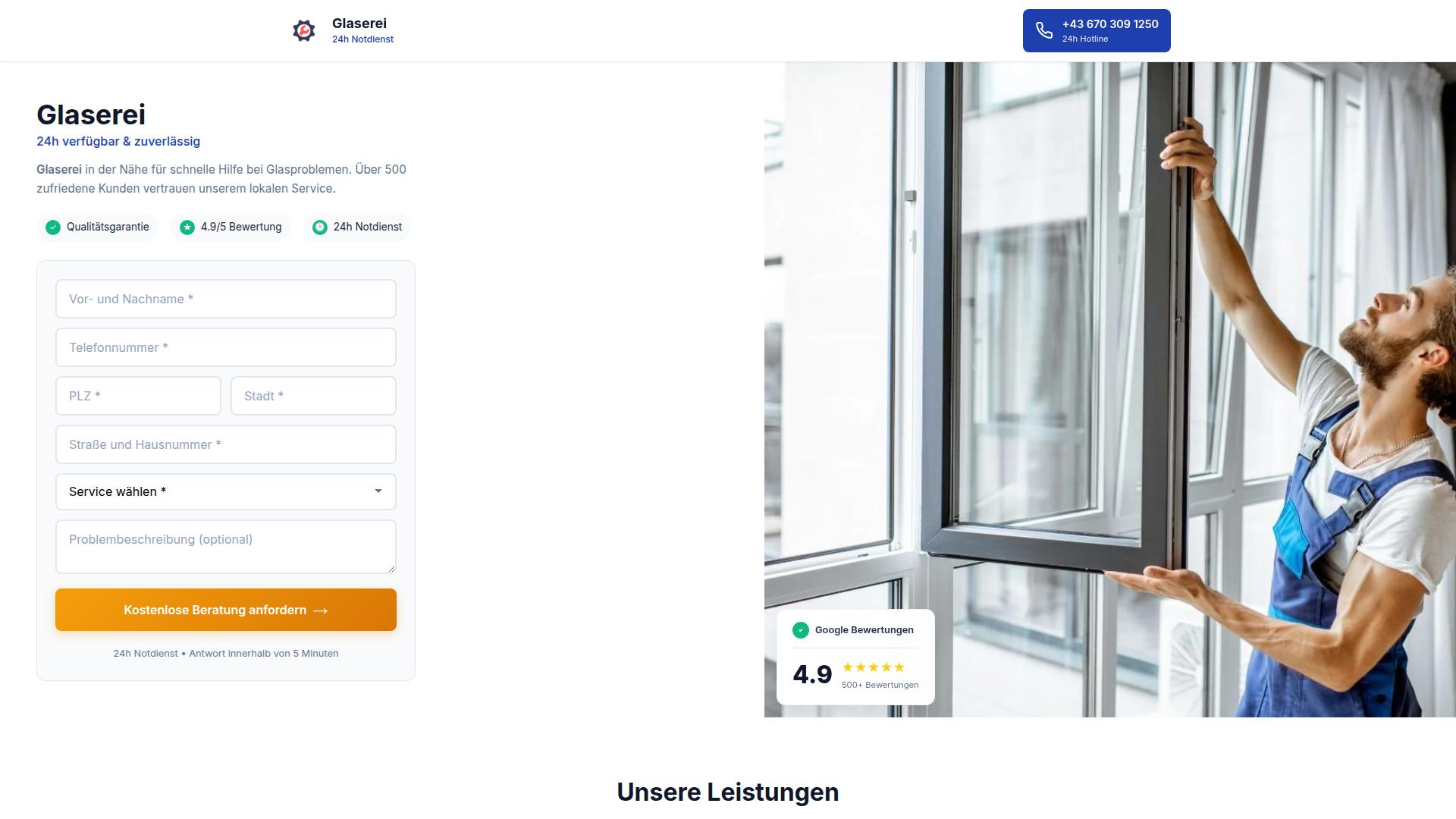 Die Webseite „Glaserei“ bietet einen 24-Stunden-Notdienst für Glasprobleme an. Die Dienstleistung richtet sich an Kunden, die in der Nähe der jeweiligen Glaserei wohnen und schnelle Hilfe benötigen. Auf der Seite wird ein Formular bereitgestellt, in dem Interessenten ihren Namen, ihre Telefonnummer, Postleitzahl, Stadt sowie die Adresse eingeben können. Darüber hinaus können die Nutzer einen spezifischen Service aus einer Liste auswählen und optional eine Problembeschreibung hinzufügen. Die Webseite hebt eine Qualitätssicherung sowie eine hohe Kundenbewertung von 4,9 von 5 Sternen hervor, basierend auf über 500 Bewertungen. Dies könnte darauf hinweisen, dass die Seite einen Fokus auf Kundenzufriedenheit legt, jedoch wird nicht näher erläutert, welche spezifischen Dienstleistungen angeboten werden. Es gibt auch eine Kontaktmöglichkeit über eine angegebene Telefonnummer, die ebenfalls rund um die Uhr verfügbar ist. Die Zahlungen und die Interaktion mit dem jeweiligen Service scheinen ebenfalls digital erfolgt, doch die genauen Zahlungsmethoden oder vertraglichen Details sind auf der Webseite nicht zu finden. Zusammenfassend lässt sich sagen, dass die Webseite ein Formular zur Anforderung eines kostenlosen Beratungsgesprächs bietet und Informationen zu einem Notdienst im Glasbereich bereitstellt, während sie gleichzeitig eine Möglichkeit zur direkten Kontaktaufnahme über ein Telefonat gewährt. Die Vermittlung von Dienstleistungen im Bereich Glasreparatur oder -installation wird angedeutet, jedoch fehlen spezifische Informationen zu den genauen Serviceleistungen und Preisen. Nutzer sollten die Gebotenheiten genau prüfen und weitere Informationen einholen, bevor sie eine Anfrage stellen.