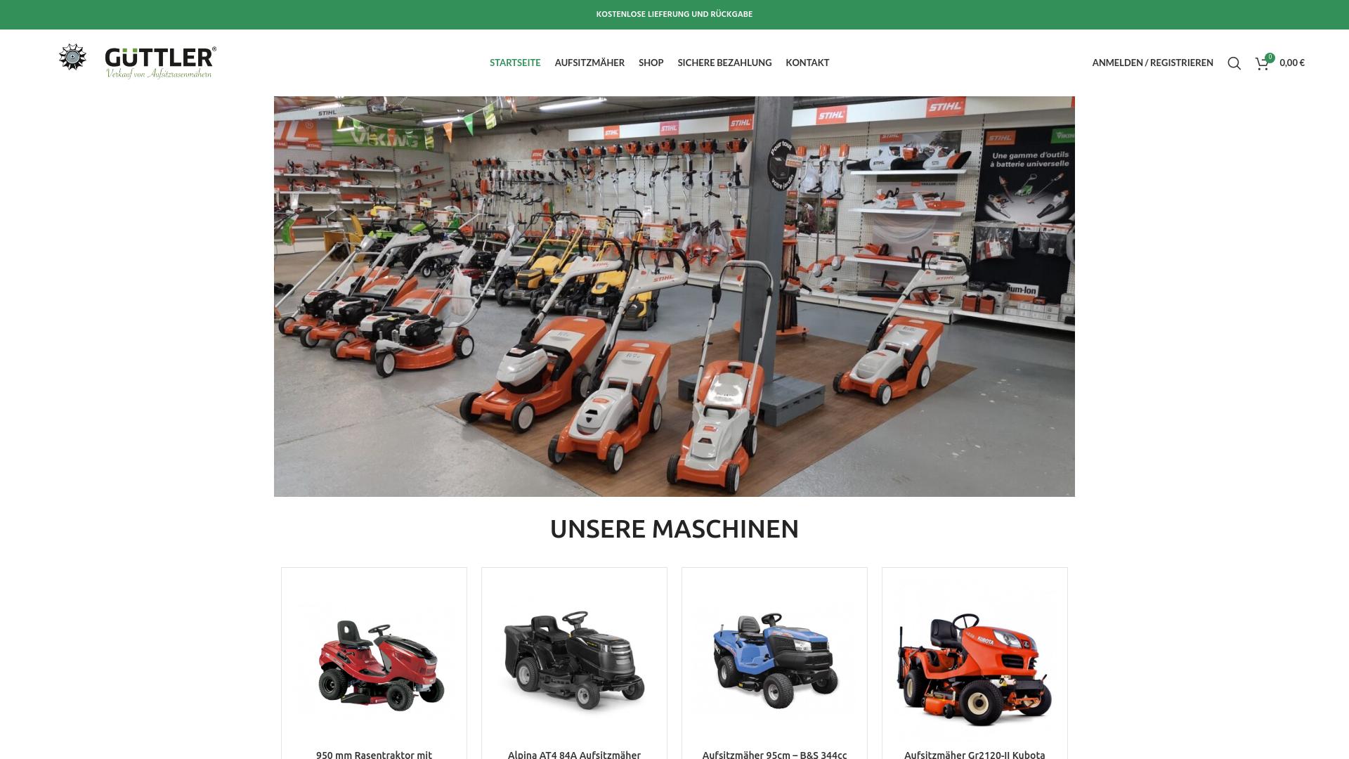 Die Webseite „GÜTTLER“ präsentiert ein Sortiment an Maschinen für die Garten- und Landschaftspflege. Im Vordergrund stehen verschiedene Modelle von Aufsitzmähern, die speziell für die Pflege von Rasenflächen konzipiert sind. Die Produkte sind in ansprechender Weise ausgestellt und bieten eine Vielzahl von Optionen für unterschiedliche Bedürfnisse. Das Sortiment umfasst verschiedene Typen von Rasenmähern, darunter Modelle mit unterschiedlichen Breiten und Motorstärken. Die dargestellten Mäher scheinen sowohl für private als auch für gewerbliche Anwendungen geeignet zu sein. Neben Aufsitzmähern werden möglicherweise auch verschiedene Gartengeräte und Zubehörteile angeboten, die für die Pflege und Wartung von Außenanlagen erforderlich sind. Die Seite ermöglicht es Nutzern anteilig, durch einen Online-Shop die Maschinen auszuwählen und zu erwerben. Die Webseite enthält außerdem Informationen zu den Merkmalen und Spezifikationen der angebotenen Produkte. Einige der Maschinen sind mit den neuesten Technologien ausgestattet, um eine effiziente Nutzung zu gewährleisten. Es gibt auch Hinweise zur Lieferung und Rückgabe der Waren, die potenziell Kundenanfragen zur Abwicklung von Bestellungen abdecken. Zusätzlich zu den Produktinformationen bietet die Seite einen Kontaktbereich, über den Nutzer mit dem Anbieter in Verbindung treten können, um Fragen zu stellen oder weitere Informationen zu den Produkten zu erhalten. Die Navigation auf der Webseite erscheint benutzerfreundlich gestaltet, was es den Besuchern erleichtert, durch die verschiedenen Kategorien zu browsen und sich über das komplette Angebot zu informieren. Die Webseite verwendet Bilder der Maschinen in einem Verkaufsraum, um potenzielle Käufer visuell anzusprechen und einen Eindruck von der Produktverfügbarkeit zu vermitteln. Es ist davon auszugehen, dass die Gestaltung darauf abzielt, ein umfassendes Einkaufserlebnis zu bieten, indem die Produkte klar und detailliert präsentiert werden. Insgesamt ermöglicht die Webseite den Nutzern den Zugang zu einer breiten Palette an Maschinen zur Gartenpflege unter der Marke GÜTTLER, die sich an verschiedene Kundenbedürfnisse richtet.