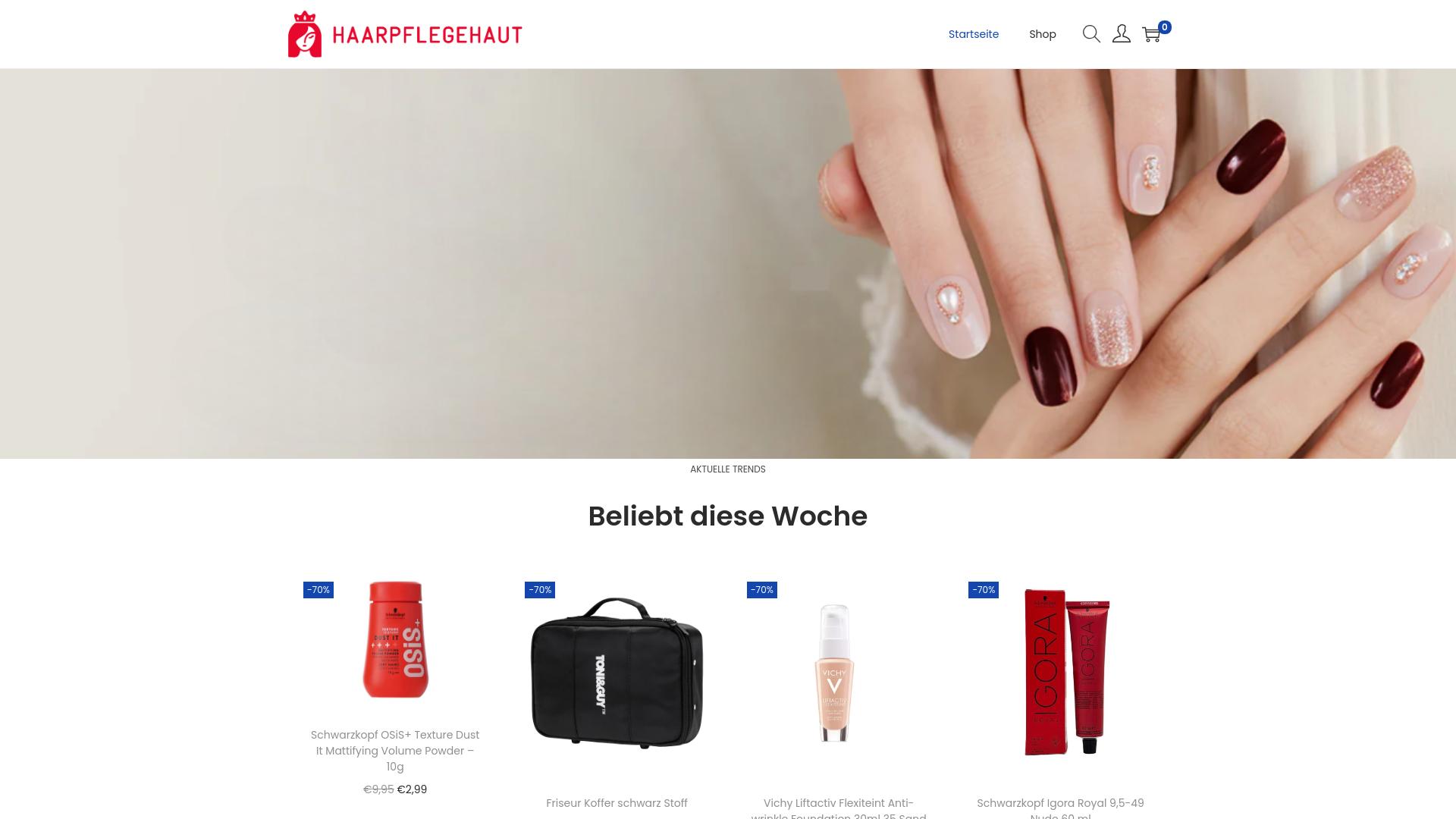 Die Webseite „haarpflegehaut“ bietet offenbar eine Auswahl an Produkten für die Haar- und Hautpflege an. Auf der Startseite werden verschiedene Artikel präsentiert, darunter Pflegeprodukte sowie Zubehör, die anscheinend zur Verbesserung des äußeren Erscheinungsbildes dienen sollen. Unter den hervorgehobenen Produkten sind ein mattierendes Volumenpulver von Schwarzkopf, das sowohl zur Texturierung als auch zur Volumensteigerung des Haares gedacht ist. Des Weiteren wird ein schwarzer Friseurkoffer angeboten, der vermutlich zur Aufbewahrung von Friseurwerkzeugen gedacht ist. Auch enthalten sind Produkte von Vichy, wie ein Anti-Aging-Serum, das der Hautstraffung dienen soll. Außerdem ist eine Haarfarbe von Schwarzkopf gelistet. Die Webseite könnte als Plattform zur Vermarktung und zum Verkauf von Kosmetikprodukten und Frisurus Zubehör betrachtet werden. Die Produkte scheinen mit Preisnachlässen beworben zu werden, was darauf hindeutet, dass es möglicherweise aktuelle Angebote oder deutlich reduzierte Preise gibt. Visuell wird die Seite durch ein Bild von gepflegten Händen mit verschiedenen Nageldesigns ergänzt, was auf ein zusätzliches Augenmerk auf Nagelpflege und -styling hinweisen könnte. Diese Gestaltung könnte darauf abzielen, ein ansprechendes Bild von Schönheit und Pflege zu vermitteln. Zusammengefasst bietet die Webseite eine Bandbreite an Produkten, die im Bereich Haar- und Hautpflege sowie dazugehörigem Zubehör angesiedelt sind. Kunden, die auf der Suche nach kosmetischen Artikeln oder Friseurbedarf sind, könnten hier auf eine breite Auswahl stoßen.