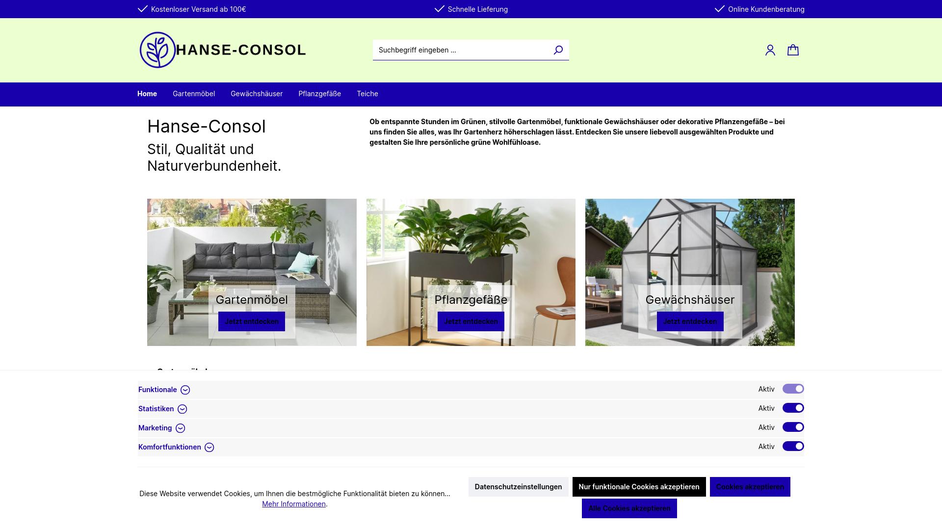 Die Webseite „Hanse-Consol“ präsentiert ein Sortiment an Produkten, die sich auf Gartenbedarf und die Gestaltung von Außenbereichen konzentrieren. Im Angebot sind verschiedene Kategorien von Artikeln zu finden, die für die Nutzung im Freien gedacht sind. Dazu zählen insbesondere Gartenmöbel, Gewächshäuser und Pflanzgefäße. Unter der Kategorie „Gartenmöbel“ werden stilvolle und funktionale Möbel für den Außenbereich angeboten. Diese Möbel sind darauf ausgelegt, eine komfortable und ästhetische Nutzung im Garten oder auf der Terrasse zu ermöglichen. Die Sektion für „Gewächshäuser“ umfasst unterschiedliche Modelle, die Gärtnern helfen sollen, Pflanzen in einem geschützten Umfeld zu ziehen. Hierbei werden verschiedene Größen und Ausführungen vorgestellt, die auf die Bedürfnisse von Hobbygärtnern zugeschnitten sind. Zusätzlich bietet die Webseite Pflanzgefäße an, die sowohl für den Innen- als auch für den Außenbereich geeignet sind. Diese Gefäße dienen der Präsentation und Pflege von Pflanzen und sind in verschiedenen Designs erhältlich. Die Webseite enthält ebenfalls Informationen über Versandoptionen, die bei Bestellungen über einem bestimmten Betrag kostenlos angeboten werden. Zudem wird ein Kundenservice erwähnt, bei dem Nutzer Unterstützung erhalten können, was auf eine mögliche Online-Beratung hinweist. Das Design der Seite ist einfach gehalten, mit klaren Kategorien und Angeboten, die eine gezielte Suche nach spezifischen Produkten ermöglichen. Nutzer können durch das Angebot navigieren und sich gezielt über die verschiedenen Produkte informieren. Auf der gesamten Webseite wird durch verschiedene visuelle Elemente eine ansprechende Präsentation der Produkte gewährt, um eine einfache Identifikation der Angebote zu erreichen. Es wird zudem auf die Verbindung von Stil, Qualität und Naturverbundenheit hingewiesen, was die thematische Ausrichtung und das Angebot der Webseite zusammenfasst.