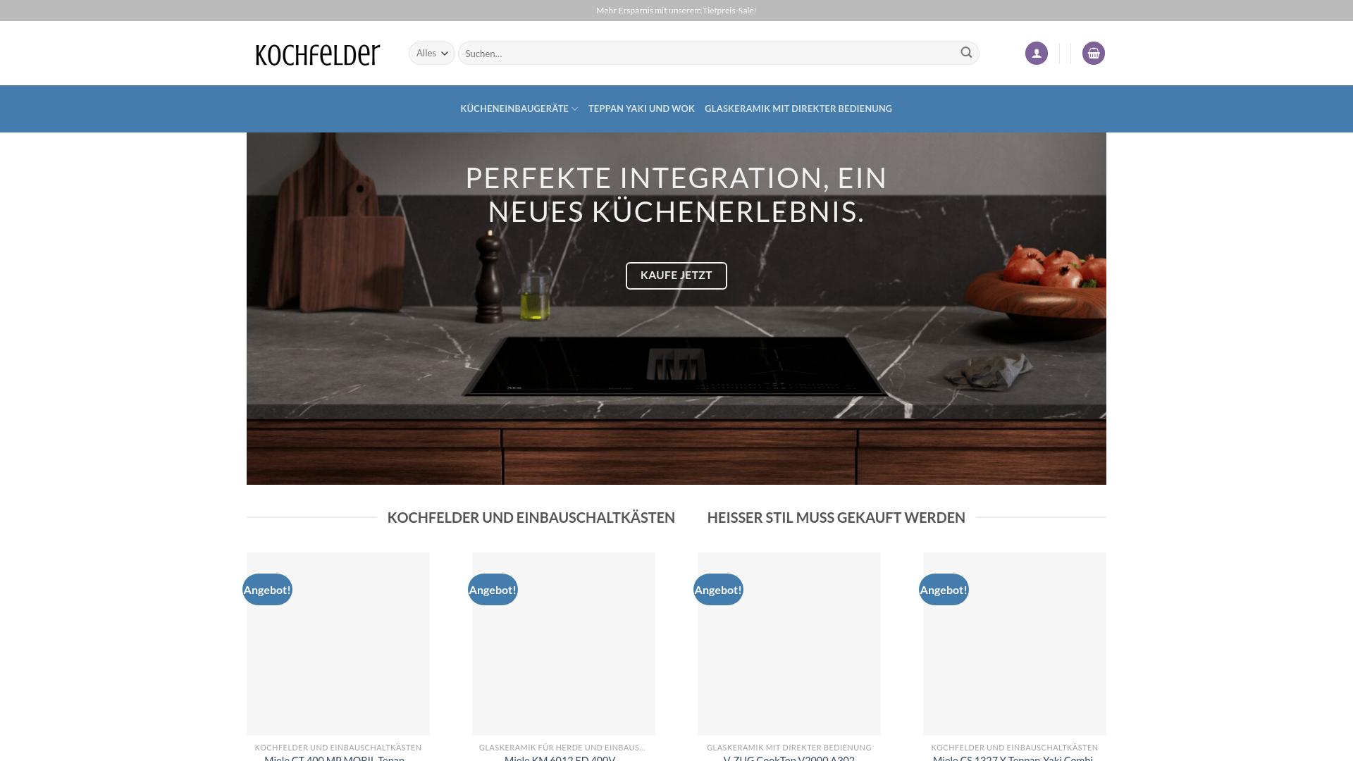 Die Webseite „kochfelder.de“ bietet eine Vielzahl von Einbaugeräten für Küchen an, insbesondere Kochfelder und entsprechende Einbauschaltsysteme. Auf der Seite finden sich verschiedene Produktkategorien, die auf die Bedürfnisse von Nutzern abgestimmt sind, die moderne Kochtechniken in ihren Küchen integrieren möchten. Die Hauptmerkmale der Webseite umfassen eine Auswahl an Kochfeldern, die sich durch verschiedene Technologien wie Induktion und Glaskeramik auszeichnen. Jede Kategorie ist detailliert beschrieben, wobei verschiedene Modelle und deren Spezifikationen hervorgehoben werden. Eine besondere Betonung liegt auf der Integration dieser Kochgeräte in die Küche, um ein nahtloses und ästhetisches Design zu fördern. Zusätzlich werden auf der Webseite spezifische Angebote zu einzelnen Produkten angezeigt. Die Nutzer haben die Möglichkeit, direkt von der Hauptseite aus zu den jeweiligen Angeboten zu navigieren und weitere Informationen zu den individuellen Produkten anzufordern. Ein Button mit der Aufschrift „Kaufe jetzt“ ist ebenfalls prominent platziert, um den Kaufprozess zu fördern. Die Webseite wirbt mit dem Anspruch, moderne Küche neu zu gestalten und eine direkte Bedienerfahrung durch innovative Technologien zu bieten. Die Nutzer finden Informationen über verschiedene Kochfeldtypen und deren Einsatzmöglichkeiten in der modernen Küche. Die visuelle Gestaltung der Seite ist modern und ansprechend, wobei hochwertige Bilder von Produkten in realistischen Küchenumgebungen verwendet werden, um die Funktionalität und das Design der Angebote zu verdeutlichen. Die Navigation auf der Seite erfolgt über ein klar strukturiertes Menü, das es den Nutzern ermöglicht, gezielt nach bestimmten Produktkategorien oder Angeboten zu suchen. Im oberen Bereich finden sich auch Suchfunktionen, die eine schnellere Auffindbarkeit der gewünschten Ware unterstützen. Insgesamt bietet die Webseite umfassende Informationen zu Einbaukochfeldern und verwandten Küchengeräten, mit einem Fokus auf moderne Designlösungen und einfache Bedienung.