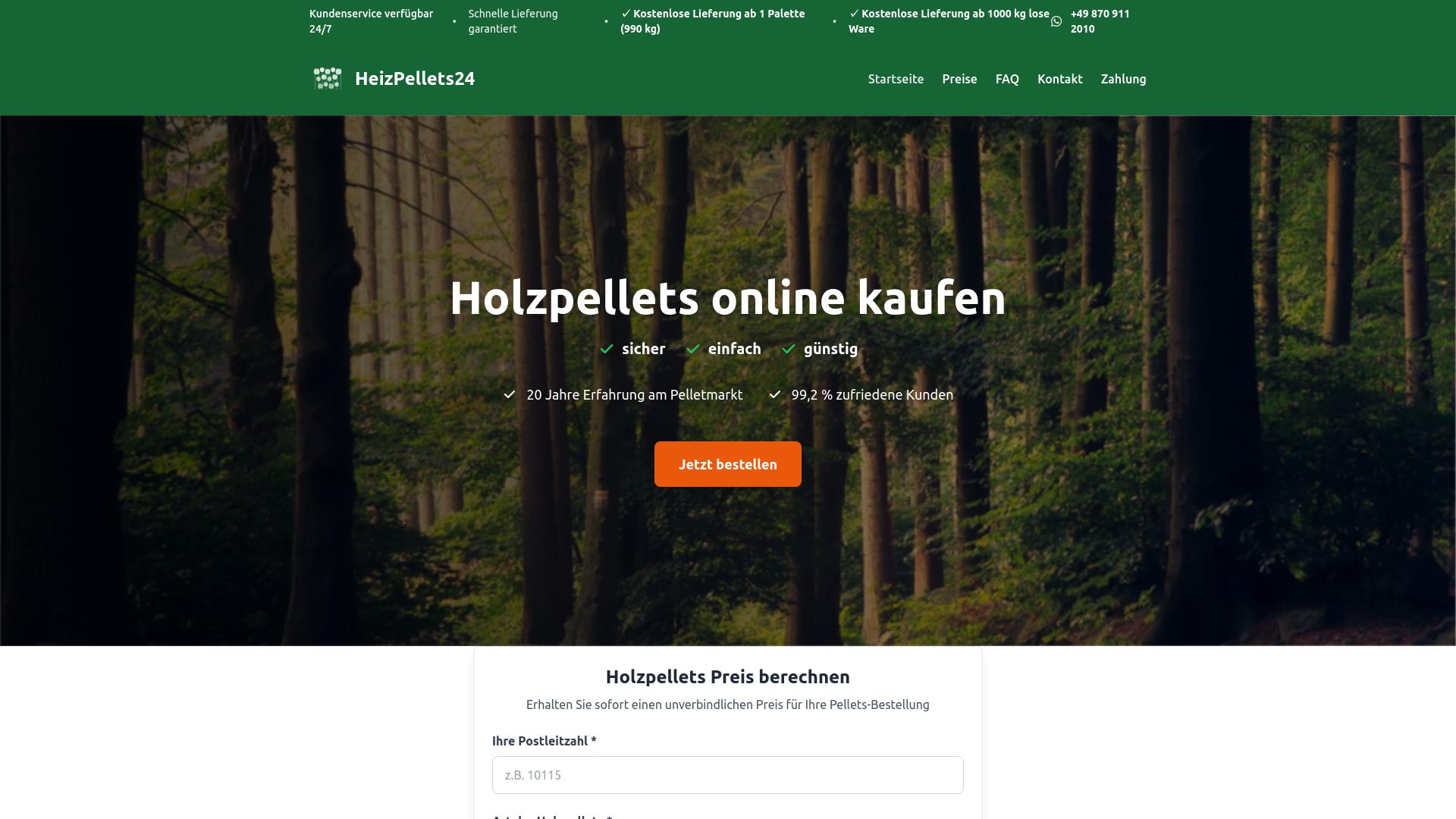 Die Webseite HeizPellets24 bietet Nutzern die Möglichkeit, Holzpellets online zu erwerben. Auf der Startseite wird die Beschreibung des Angebots mit dem Hinweis auf eine 20-jährige Erfahrung im Pelletsmarkt sowie eine angebliche Zufriedenheit von 99,2 % bei den Kunden hervorgehoben. Die zentrale Funktion der Webseite besteht darin, dass Nutzer Preise für Holzpellets berechnen können, indem sie ihre Postleitzahl eingeben. Unter dem Abschnitt „Preise“ können Nutzer Details zu den Kosten und Mengen der Pellets erhalten. Die Seite weist außerdem auf eine schnelle Lieferung hin und informiert über kostenlose Lieferungen, die ab einer Palette von 990 kg oder bei Bestellungen von 1000 kg in loser Form angeboten werden. Die durch die Webseite angebotenen Holzpellets sind in der Regel ein Produkt zur Beheizung von Räumlichkeiten und können in variablen Mengen bestellt werden. Zusätzlich sind Bereiche wie „FAQ“ (Häufig gestellte Fragen) und „Kontakt“ vorhanden, die Nutzern weitere Informationen und Unterstützung bieten sollen. Dort könnten Preise, Lieferzeiten und Zahlungsmodalitäten angesprochen werden. Die Webseite zeigt auch einen Bereich zum Kundenservice, der als rund um die Uhr verfügbar gekennzeichnet ist, was darauf hindeutet, dass die Nutzer jederzeit Fragen zu Bestellungen oder anderen Anliegen stellen können. Insgesamt fokussiert sich die Webseite darauf, Holzpellets als Heizmaterial anzubieten und den Nutzern eine bequeme Möglichkeit zu verschaffen, diese online zu bestellen, einschließlich der Berechnung der Preise basierend auf ihrem Standort. Kommentar oder Bewertungen von anderen Nutzern sind auf der Webseite nicht sichtbar, wodurch die Nutzererfahrung vor einem Kauf nicht direkt einschätzbar ist.