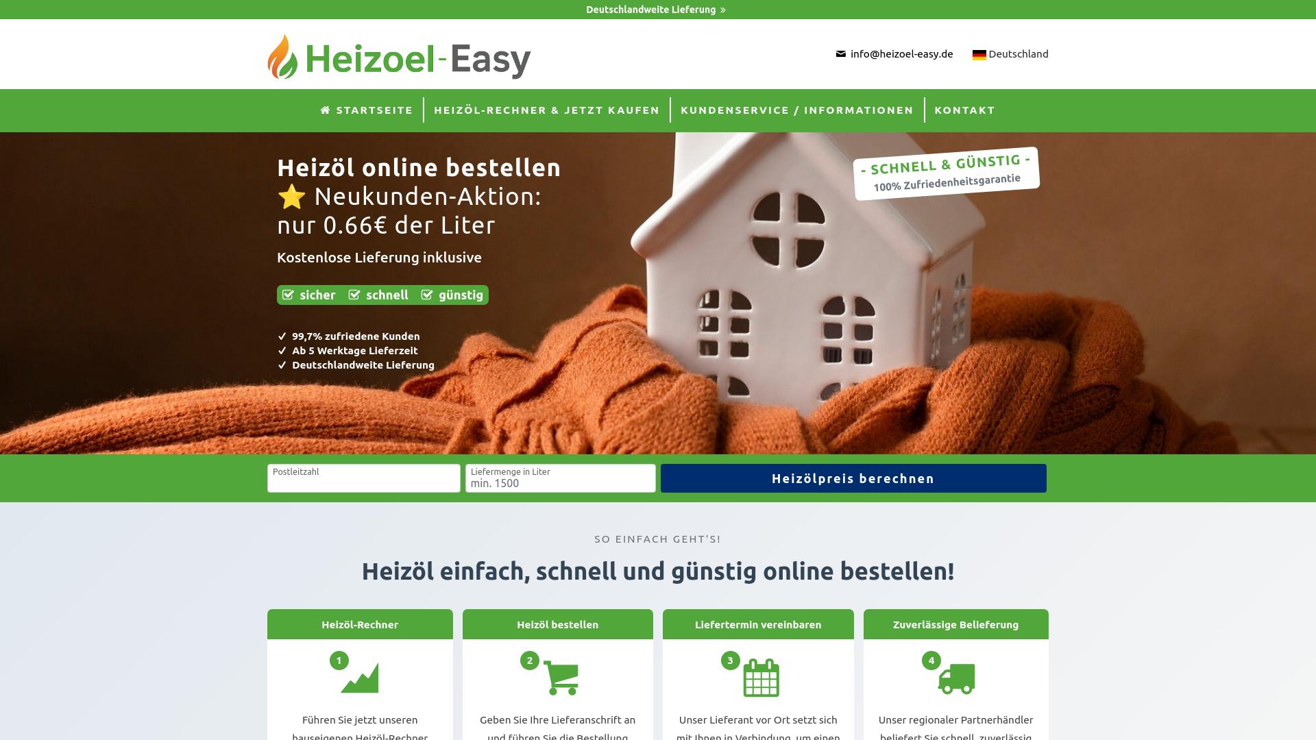 Die Webseite „Heizoel-Easy“ bietet den Nutzern die Möglichkeit, Heizöl online zu bestellen. Auf der Seite wird ein aktuelles Angebot für Neukunden hervorgehoben, bei dem der Liter Heizöl zu einem Preis von 0,66 Euro erhältlich ist. Es wird darauf hingewiesen, dass die Lieferung in diesem Preis enthalten ist. Zudem gibt die Seite an, dass die Bestellung in Deutschland möglich ist und sie eine Lieferzeit ab fünf Werktagen in Aussicht stellt. Die Webseite beinhaltet einen Heizöl-Rechner, über den Nutzer die benötigte Menge Heizöl berechnen können. Der Bestellprozess wird in mehreren Schritten erläutert: Zunächst geben die Nutzer ihre Lieferanschrift ein, gefolgt von der Bestellung des Heizöls. Anschließend wird ein Liefertermin vereinbart, und schließlich wird die Lieferung durch einen regionalen Partnerhändler organisiert. Des Weiteren findet sich auf der Webseite ein Bereich, der die Zufriedenheit der Kunden anspricht, mit einem Hinweis auf 99,7 % zufriedene Kunden. Es werden auch verschiedene Vorteile angeführt, wie die schnelle und unkomplizierte Bestellung. Zudem wird auf eine 100 % Zufriedenheitsgarantie verwiesen. Die Seite ist optisch ansprechend gestaltet, mit einer klaren Struktur, die den Nutzern die Navigation erleichtert. Im oberen Bereich der Seite sind Kontaktinformationen in Form einer E-Mail-Adresse zu finden, die den Nutzern ermöglichen, direkt mit dem Betreiber der Webseite in Verbindung zu treten. Insgesamt zielt die Webseite darauf ab, eine online Plattform für den Heizölkauf bereitzustellen, die einfach nutzbar ist und eine schnelle Lieferung verspricht. Die Informationen sind so strukturiert, dass potenzielle Käufer in der Lage sind, ohne große Schwierigkeiten ihre Bestellung aufzugeben und weitere Informationen zu erhalten.