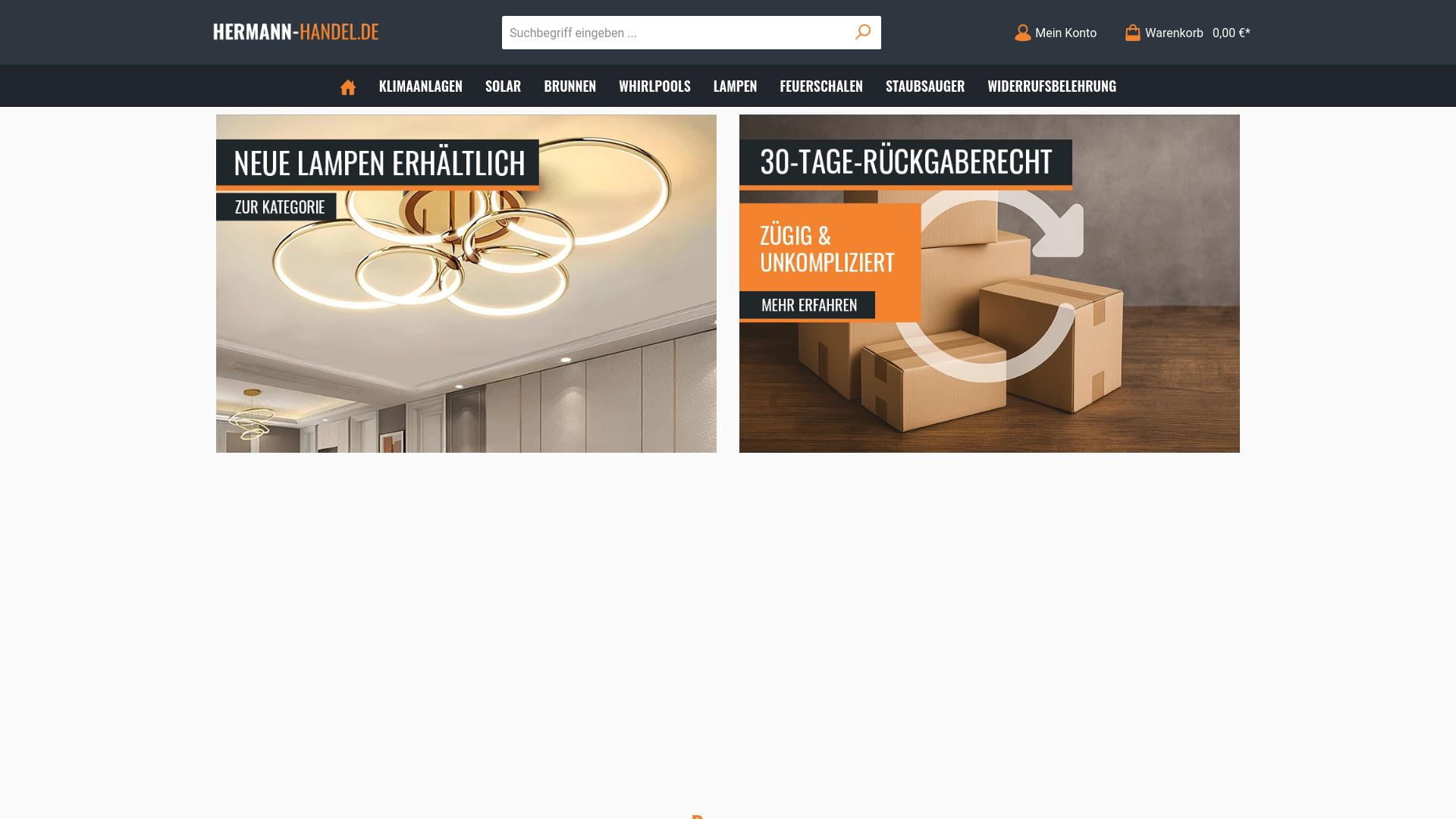 Die Webseite hermann-handel.de bietet eine Vielzahl von Produkten an, die sich hauptsächlich auf den Bereich Beleuchtung und technische Geräte konzentrieren. Auf der Seite wird eine Kategorie für Lampen hervorgehoben, in der verschiedene Modelle präsentiert werden. Es wird darauf hingewiesen, dass neue Lampen erhältlich sind und Nutzer dazu aufgefordert werden, die entsprechende Kategorie zu besuchen. Zusätzlich zur Beleuchtung gibt es Informationen über Klimaanlagen und Solaranlagen, die ebenfalls Teil des Angebots sind. Die genaue Produktpalette und die Spezifikationen der angebotenen Artikel sind auf der Webseite nicht näher ausgeführt, jedoch scheint es eine breite Auswahl an sowohl dekorativen als auch funktionalen Beleuchtungslösungen zu geben. Ein weiteres Merkmal der Webseite ist der Hinweis auf ein 30-tägiges Rückgaberecht, das Nutzern die Möglichkeit bietet, Produkte unkompliziert zurückzugeben. Diese Information wird visuell unterstützt durch ein Bild von Verpackungen, was darauf hindeutet, dass der Rückgabeprozess potenziell einfach gestaltet ist. Die Navigation auf der Webseite erfolgt über ein Menü, das verschiedene Produktkategorien auflistet, einschließlich Whirlpools, Brunnen, Feuerschalen, Staubsauger und einen Bereich zur Widerrufsbelehrung. Dies deutet darauf hin, dass die Seite ein breites Spektrum an Haushalts- und Gartenprodukten abdeckt. Die Webseite spricht anscheinend ein Publikum an, das Interesse an Heimelektronik und -zubehör hat und legt Wert auf eine benutzerfreundliche Erfahrung, wie das bevorstehende Rückgaberecht zeigt. Es gibt keine weiteren spezifischen Informationen über die Preise der Produkte oder besondere Aktionen, die für Nutzer von Interesse sein könnten. Insgesamt ist hermann-handel.de als Plattform für verschiedene Produkte im Bereich Beleuchtung und technische Geräte konzipiert, ohne jedoch detaillierte Beschreibungen der einzelnen Artikel bereitzustellen. Die Darstellung der Dienstleistungen und der angebotenen Produkte bleibt objektiv und informierend.