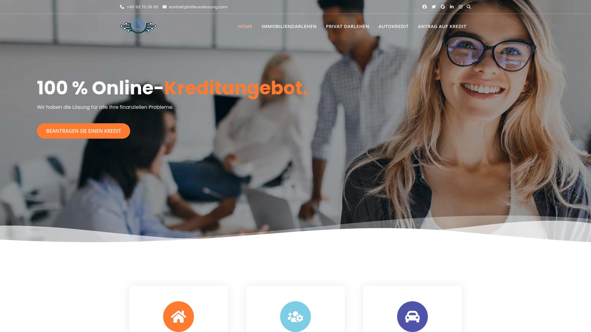 Die Webseite bietet ein Online-Kreditangebot an und ist darauf ausgerichtet, Lösungen für verschiedene finanzielle Probleme bereitzustellen. Nutzer können direkt über die Seite einen Kredit beantragen. In der Kopfzeile wird ein vollständiges Online-Angebot hervorgehoben, das alle notwendigen Informationen auf einer einzigen Plattform bereitstellen soll. Das Hauptaugenmerk der Seite liegt auf den verschiedenen Arten von Krediten, die angeboten werden. Dazu gehören Immobilienkredite, private Darlehen und Autokredite. Jede dieser Kategorien wird durch spezifische Symbole visualisiert, die den Nutzern die Orientierung erleichtern sollen. Unter dem Bereich für die Kreditbeantragung wird ein auffälliger Button platziert, der zur Initiierung des Kreditprozesses einlädt. Die Webseite enthält auch Kontaktinformationen, die es Nutzern ermöglichen, Fragen zu stellen oder weitere Informationen zu den angebotenen Dienstleistungen zu erhalten. Die Benutzeroberfläche scheint modern gestaltet zu sein, was die Navigation erleichtern könnte. Der Inhalt insgesamt legt den Fokus auf die Bereitstellung einer schnellen und einfachen Möglichkeit, einen Kredit online zu beantragen. Zusätzlich könnte die Seite Informationen zur Kreditvergabe oder zu spezifischen Anforderungen für verschiedene Kreditarten offerieren, jedoch ist dies aus der Darstellung nicht final ersichtlich. Die Seite möchte möglicherweise Transparenz darüber schaffen, wie der Prozess des Kreditangebots funktioniert, und könnte darauf abzielen, den Nutzern klarzumachen, welche Schritte notwendig sind, um einen Antrag erfolgreich einzureichen. Es ist zu beachten, dass es sich um eine Platform handelt, die im Finanzbereich tätig ist, insbesondere im Zusammenhang mit Krediten. Die Präsentation und die angebotenen Dienstleistungen könnten darauf abzielen, signifikante finanzielle Lösungen zu präsentieren. Nutzer sind eingeladen, Aktion zu ergreifen, indem sie einen Kredit beantragen, wobei sie möglicherweise auch auf die unterschiedlichen Kreditprodukte hingewiesen werden, die ihrer finanziellen Situation gerecht werden.