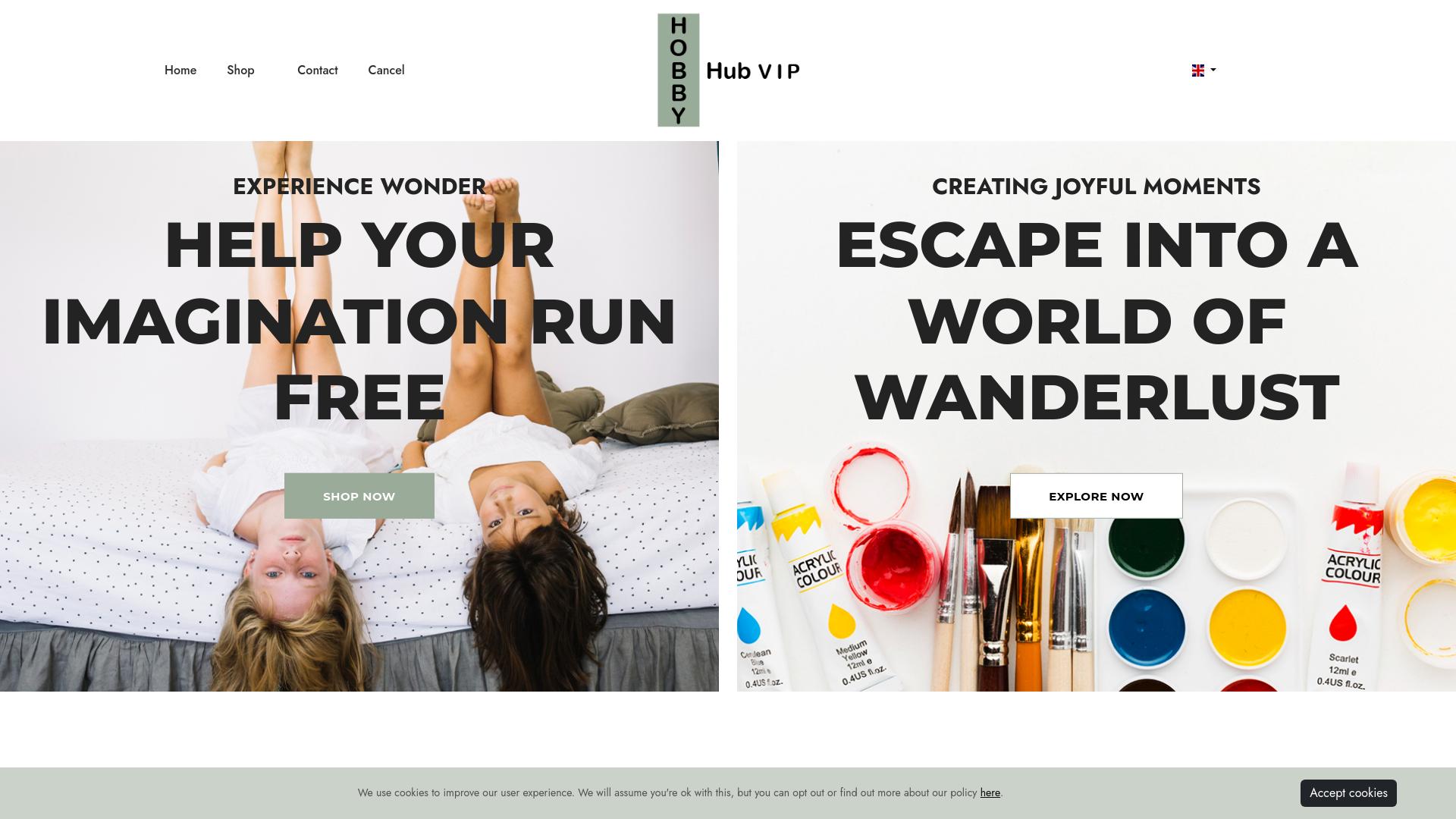 Die Webseite „Hobby VIP“ präsentiert eine Reihe von Inhalten, die sich auf kreative Hobbys und Aktivitäten konzentrieren. Im oberen Bereich der Webseite findet sich ein einladender Slogan, der darauf hinweist, dass die Nutzer ihre Vorstellungskraft entfalten und Freude an kreativen Tätigkeiten haben können. Direkt unter diesem Slogan wird ein Button zur Schaltfläche „Shop Now“ angeboten, der vermutlich zu einem Online-Shop führt, in dem Produkte für kreative Projekte erhältlich sind. Die visuelle Gestaltung der Seite umfasst Bilder von Aktivitäten, die für Kinder und Familien geeignet sind. Eines der hervorgehobenen Bilder zeigt zwei Kinder, die auf einem Bett liegen und dabei scheinen, Spaß zu haben. Dies deutet darauf hin, dass die Webseite möglicherweise Produkte oder Anleitungen für kreative Beschäftigungen in einem familiären Kontext anbietet. Auf der rechten Seite des Bildschirms ist ein weiterer Slogan zu sehen, der dazu einlädt, in eine Welt des Reisens und der Abenteuerlust einzutauchen. Dies könnte darauf hindeuten, dass die Webseite auch Materialien oder Informationen zu kreativen Reisen oder ähnlichen Themen anbietet. Darüber hinaus sind im Bild auch Farbfarben und Malutensilien zu sehen, was darauf schließen lässt, dass die Webseite vielleicht Produkte für Mal- und Bastelprojekte führt. Zusätzlich enthält die Webseite einen Hinweis zur Verwendung von Cookies, der darauf abzielt, die Nutzererfahrung zu verbessern. Dies zeigt, dass die Seite auch die Datensicherheit der Nutzer berücksichtigt und informiert, dass die Zustimmung zur Verwendung von Cookies vorausgesetzt wird. Die Webseite bietet also umfangreiche Inhalte, die sich sowohl an Kinder als auch an Erwachsene richten könnten, und zielt darauf ab, kreative Aktivitäten und Unterhaltung zu fördern. Die Angebote scheinen ein breites Spektrum an künstlerischen und handwerklichen Projekten abzudecken, einschließlich, aber nicht beschränkt auf Malen und Basteln. Es gibt auch Optionen zur direkten Kontaktaufnahme, die die Nutzer gegebenenfalls nutzen können, um weitere Informationen zu erhalten oder Unterstützung bei Fragen oder Anliegen in Anspruch zu nehmen. Die Struktur der Webseite und die angebotenen Produkte scheinen darauf ausgelegt zu sein, das Interesse an kreativen Hobbys zu wecken und die Nutzer dazu zu ermutigen, aktiv zu werden.