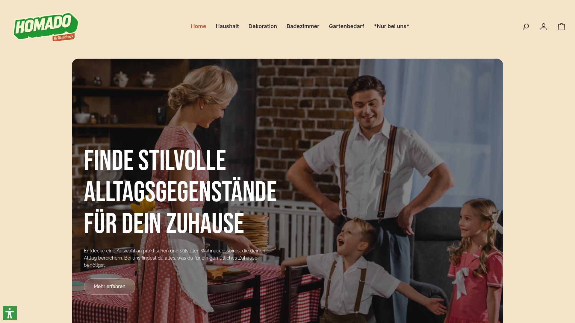 Die Webseite „HOMADO“ präsentiert eine Auswahl an Alltagsgegenständen und Wohnaccessoires, die für den häuslichen Gebrauch gedacht sind. Auf der Startseite wird der Nutzer eingeladen, stilvolle Produkte zu entdecken, die das Zuhause bereichern sollen. Das Produktsortiment umfasst verschiedene Kategorien, darunter Haushalt, Dekoration, Badezimmer und Gartenbedarf. Im Bereich Haushalt werden vermutlich Artikel angeboten, die für die tägliche Nutzung in der Küche und im Wohnraum geeignet sind. Die Dekorationskategorie könnte Produkte beinhalten, die zur Verschönerung des Wohnraums beitragen, wie etwa Bilder, Vasen oder andere dekorative Elemente. Zusätzlich scheint die Seite Produkte für das Badezimmer anzubieten, möglicherweise mit Fokus auf Badtextilien, Sanitärartikel oder Organisationselemente. Der Gartenbedarf könnte eine Reihe von Gartenaccessoires oder -geräten umfassen, die beim Gärtnern oder der Gartenpflege unterstützen. Ein auffälliges Element der Webseite ist die Betonung auf praktischen und stilvollen Designaspekten, was darauf hindeutet, dass die Produkte sowohl funktional als auch ästhetisch ansprechend sein sollen. Durch den Einsatz visueller Inhalte wird eine einladende Atmosphäre geschaffen, die den Nutzer ansprechen soll. Die Navigation auf der Webseite scheint klar strukturiert zu sein, mit spezifischen Kategorien, die den Besuchern helfen, schnell die gewünschten Produkte zu finden. Es wird auch eine Möglichkeit angeboten, mehr Informationen zu den angebotenen Produkten zu erhalten, jedoch sind keine konkreten Details zu Preisen, Zahlungsmethoden oder Lieferoptionen im Screenshot ersichtlich. Insgesamt bietet die Webseite eine Plattform, um eine Vielzahl von Wohnaccessoires zu entdecken, die dazu dienen, den Alltag im eigenen Zuhause zu verbessern.