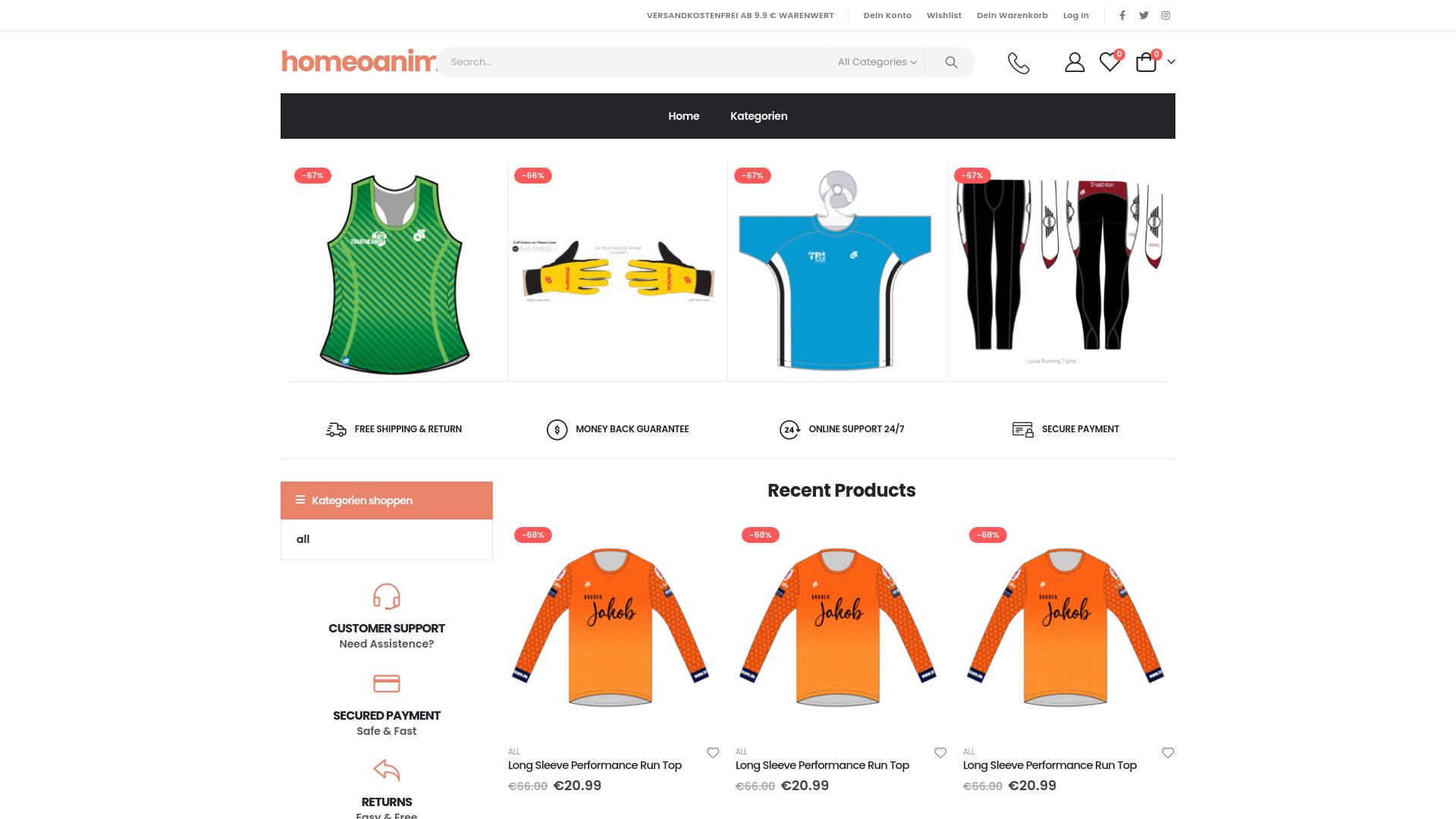 Die Webseite „homeoanir“ bietet eine Auswahl an Sportbekleidung an. Im oberen Bereich der Startseite sind verschiedene Kategorien zu finden, darunter Trainingsshirts, Laufhosen und Sporthandschuhe. Die Produkte sind mit prozentualen Rabatten ausgezeichnet, die auf Ersparnisse hinweisen. Ein besonders hervorgehobenes Produkt ist ein grün gestreiftes ärmelloses Shirt, das mit einem Rabatt von 67 % angeboten wird. Neben diesem Shirt gibt es auch gelbe Sporthandschuhe, die ebenfalls mit einem Rabatt von 66 % versehen sind. Des Weiteren wird ein türkisfarbenes T-Shirt präsentiert, das ähnliche Ersparnisse aufweist. Im Angebot sind auch verschiedene Laufhosen sichtbar, die zum Teil mit grafischen Designs versehen sind. Unter den „Recent Products“ sind mehrere langärmelige Laufoberteile in oranger Farbe gelistet, die jeweils zum Preis von 20,99 Euro angeboten werden. Die ursprünglichen Preise dieser Produkte liegen bei 66 Euro, was auf eine deutliche Preisreduktion hindeutet. Die Webseite bietet Anreize wie kostenlosen Versand und Rückgabe an, sowie eine Geld-zurück-Garantie. Ein Hinweis auf einen 24/7-Online-Support deutet darauf hin, dass Nutzer jederzeit Hilfe bei Fragen oder Problemen erhalten können. Es gibt außerdem einen Hinweis auf sichere Zahlungsmethoden, die als schnell und sicher beschrieben werden. Die Benutzer haben die Möglichkeit, durch Kategorien zu browsen und ihre Wunschliste zu verwalten. Zusätzliche Informationen über den Kundenservice sind ebenfalls vorhanden, um Unterstützung zu bieten. Insgesamt umfasst die Webseite eine Vielzahl von Sportbekleidungsartikeln mit attraktiven Preisangeboten und Support-Optionen für die Nutzer.