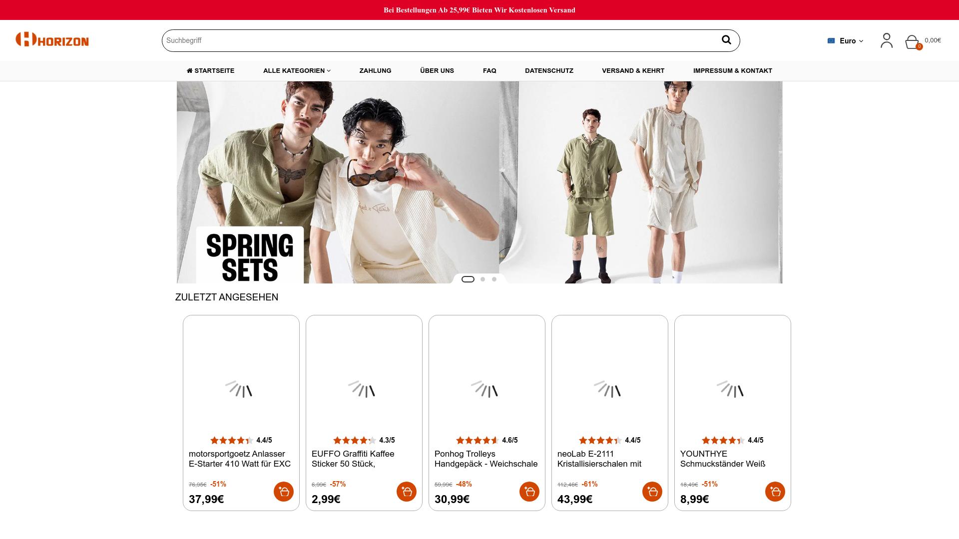 Die Webseite bietet eine Auswahl an verschiedenen Produkten, die hauptsächlich in den Kategorien Mode und Accessoires angesiedelt sind. Ein zentraler Bereich der Seite zeigt eine Werbebotschaft für „Spring Sets“, die vielseitige Bekleidungsoptionen für die Frühjahrsaison bewerben. Die angezeigten Modelle zeigen lässige und modische Freizeitkleidung, die in hellen Farben und lockeren Schnitten gestaltet ist. Unterhalb der Hauptpromotion werden mehrere Produkte aufgelistet, die Nutzer zuletzt betrachtet haben. Die angezeigten Artikel umfassen einen E-Starter für Motorräder, Sticker, Trolleys, eine individuelle Kristallliser-Schale sowie einen Schmuckständer. Die Produkte sind jeweils mit Preisnachlässen versehen, die bis zu 61% betragen, was auf ermäßigte Angebote hinweist. Jedes Produkt verfügt über eine eigene Bewertung durch Käufer, wobei die Bewertungen im Durchschnitt zwischen 4.3 und 4.6 von 5 Sternen liegen. Die Seite bietet zudem Informationen zu verschiedenen Zahlungsmethoden und enthält Abschnitte zu häufig gestellten Fragen sowie zu Datenschutzrichtlinien. Es wird auch auf die Versandbedingungen hingewiesen, die bei Bestellungen ab einem bestimmten Betrag kostenlosen Versand anbieten. Zusätzlich ist ein Bereich für Impressum und Kontaktinformationen vorhanden, was in der Regel dazu dient, Transparenz über die Betreiber der Webseite zu schaffen. Die Navigation erfolgt über ein übersichtliches Menü, welches den Zugriff auf alle Kategorien und Unterkategorien der Produkte ermöglicht. Insgesamt vermittelt die Webseite den Eindruck eines Online-Shops, der ein breites Produktspektrum in den Bereichen Mode, Lifestyle und Zubehör anbietet, während Nutzer die Möglichkeit haben, zwischen verschiedenen Artikeln zu wählen und Bewertungen Iher Erfahrungen anzuzeigen.