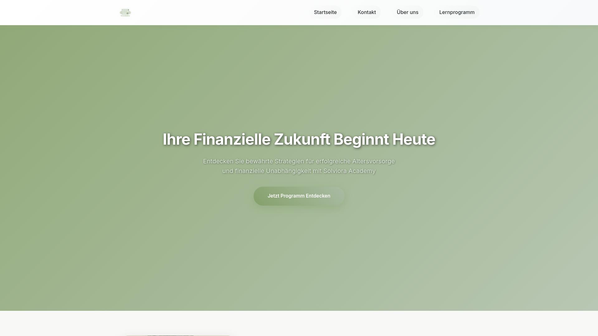 Die Webseite bietet Informationen und Programme zur finanziellen Bildung, insbesondere im Bereich der Altersvorsorge. Sie präsentiert sich unter dem Slogan „Ihre finanzielle Zukunft beginnt heute“ und lädt die Nutzer ein, Strategien für eine erfolgreiche Altersvorsorge und finanzielle Unabhängigkeit zu entdecken. Im Fokus der Webseite steht die „Solviora Academy“, die anscheinend Lerninhalte oder Programme anbietet, die darauf ausgerichtet sind, den Nutzern zu helfen, ihre finanziellen Kenntnisse und Planungsfähigkeiten zu verbessern. Es wird darauf hingewiesen, dass die angebotenen Strategien als bewährt angesehen werden. Die Nutzer haben die Möglichkeit, über einen gut sichtbaren Button zu einem Programm zu gelangen, das mit „Jetzt Programm Entdecken“ beschriftet ist. Diese Funktion soll vermutlich den Zugriff auf detaillierte Informationen zu den verschiedenen Lerninhalten oder Kursen erleichtern. Des Weiteren sind Links zu weiteren Informationen wie „Startseite“, „Kontakt“, „Über uns“ und „Lernprogramm“ vorhanden, was darauf hinweist, dass die Webseite eine klare Struktur hat und Besuchern möglicherweise erlaubt, sich über das Team hinter der Webseite sowie weitere spezifische Angebote zu informieren. Auf der Webseite wird ein minimalistisches Design verwendet, das sich durch eine einfache Navigation und eine ansprechende Farbgestaltung auszeichnet. Diese Gestaltung könnte darauf abzielen, eine benutzerfreundliche Erfahrung zu gewährleisten und den Besuchern die Orientierung auf der Seite zu erleichtern. Insgesamt umfasst die Webseite sowohl Services, die sich mit Finanzbildung und persönlichen Finanzstrategien befassen, als auch eine klare Benutzeroberfläche, die den Besuchern helfen soll, sich leicht mit dem Inhalt und den angebotenen Programmen auseinanderzusetzen.