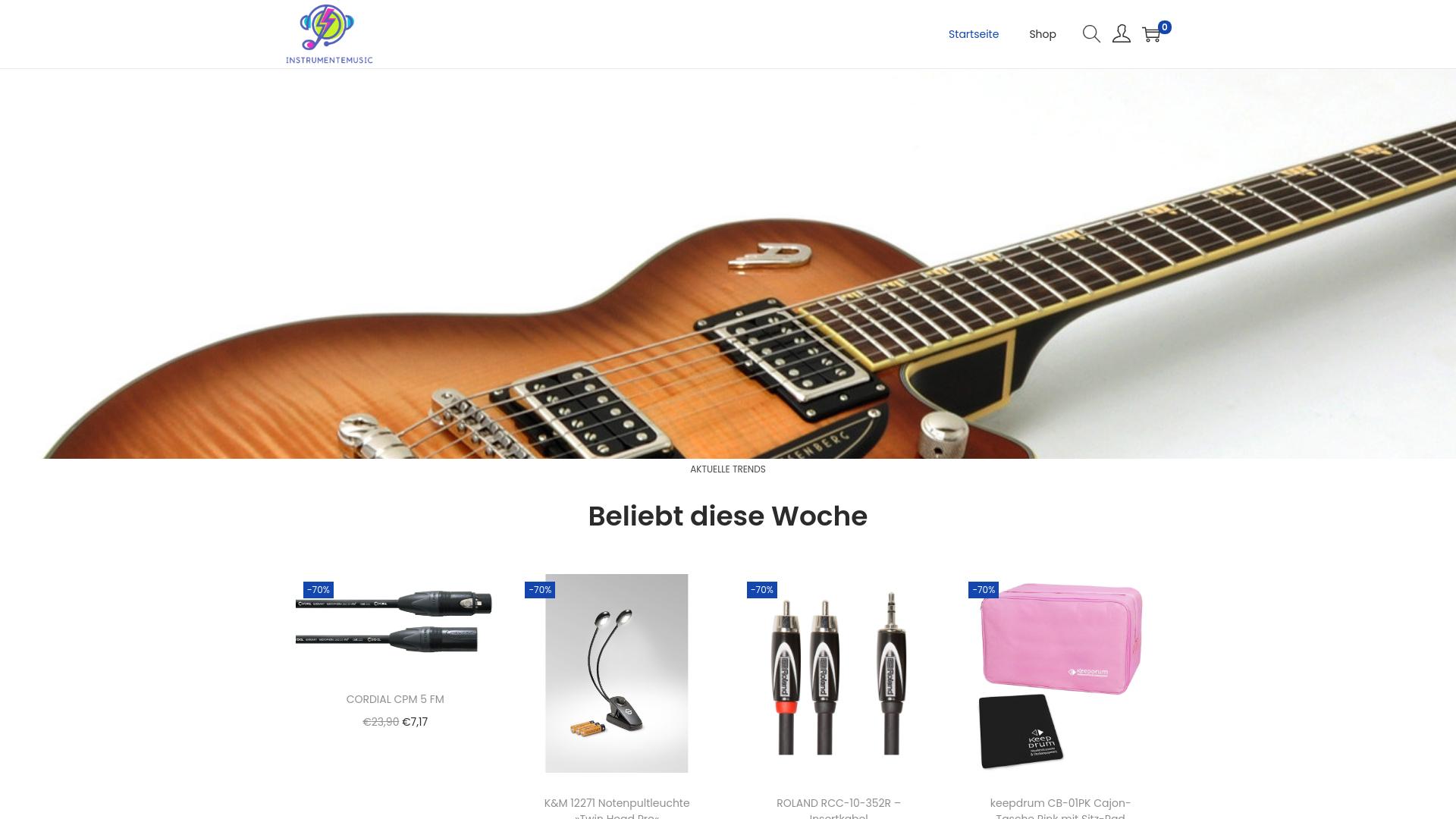 Die Webseite bietet eine Auswahl an Musikinstrumenten und Zubehör, die für Musiker und Musikliebhaber von Interesse sein könnten. Auf der Startseite wird eine elektrische Gitarre präsentiert, die als zentrales Bild dient und möglicherweise die Hauptkategorie der angebotenen Produkte hervorhebt. Es werden mehrere Artikel angezeigt, die sich in der Rubrik „Beliebt diese Woche“ befinden, was darauf hinweist, dass diese Produkte aktuell im Fokus stehen. Zu den angebotenen Produktkategorien gehören unter anderem Musikkabel, Notenleuchten und verschiedene Audioanschlusskabel. Beispielsweise wird ein Produkt namens „Cordial CPM 5 FM“ vorgestellt, dessen Preis nach einem Rabatt von 70% auf 7,17 Euro gesenkt wurde. Des Weiteren wird eine Notenleuchte von K&M, die ein praktisches Hilfsmittel für Musiker darstellen könnte, und ein Kabelset von Roland angeboten, das zur Verbindung von Audioequipment genutzt wird. Ein weiteres Produkt ist eine Aufbewahrungslösung für Musikinstrumente, die möglicherweise dazu dient, Zubehör sicher zu transportieren oder zu lagern. Diese Angebote sind visuell ansprechend gestaltet und enthalten Preisangaben sowie Hinweise zu Rabatten, die auf der Webseite beworben werden. Die Seite scheint sich auf die Bedürfnisse von Musikern zu konzentrieren, indem sie eine Vielzahl von Zubehör und Instrumenten präsentiert, die sowohl für Anfänger als auch für erfahrene Musiker von Interesse sein könnten. Insgesamt wird eine deutliche Ausrichtung auf musikalische Produkte und Hilfsmittel für die Ausübung der Musik deutlich. Die Darstellung ist klar strukturiert, um den Besuchern eine einfache Navigation und Suche nach spezifischen Instrumenten oder Zubehör zu ermöglichen. In den verschiedenen Kategorien könnten auch weitere Produkte zu finden sein, die den unterschiedlichen Anforderungen und Vorlieben von Musikern gerecht werden.