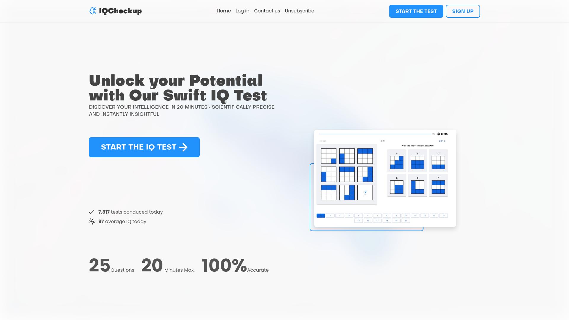 Die Webseite IQCheckup bietet einen IQ-Test an, der Nutzer darin unterstützt, ihre Intelligenz innerhalb von 20 Minuten zu ermitteln. Der Test besteht aus 25 Fragen, die darauf abzielen, logische Denkanforderungen zu testen. Nach Abschluss des Tests soll eine sofortige Auswertung erfolgen, die dem Nutzer anzeigt, wie hoch sein IQ im Vergleich zu anderen Teilnehmern ist. Auf der Startseite wird darauf hingewiesen, dass am aktuellen Tag bereits 7.817 Tests durchgeführt wurden und ein durchschnittlicher IQ von 97 ermittelt wurde. Die Webseite stellt hervor, dass der Test als wissenschaftlich präzise gilt und gibt an, dass die Genauigkeit der Ergebnisse bei 100 % liegen soll. Nutzer haben die Möglichkeit, den Test über einen klar gekennzeichneten Button zu starten. Optionen für die Registrierung oder das Anmelden sind ebenfalls vorhanden, was darauf hinweist, dass die Nutzung der Seite möglicherweise eine Erstellung eines Kontos erfordert. Die Benutzeroberfläche scheint benutzerfreundlich gestaltet zu sein, wobei eine grafische Darstellung von Testfragen in einem leicht verständlichen Format präsentiert wird. Die Webseite enthält Informationen zu den Testdetails und hebt die Zeitlimits sowie die Anzahl der Fragen hervor. Darauf wird auch im weiteren Verlauf der Seite verwiesen, um die Nutzererfahrung zu optimieren und die notwendige Transparenz zu gewährleisten. Zusammenfassend bietet IQCheckup einen strukturierten und zeitlich begrenzten IQ-Test an, dessen Ergebnisse sofort bereitgestellt werden, was für Nutzer von Interesse sein könnte, die eine schnelle Einschätzung ihrer intellektuellen Fähigkeiten suchen. Die Webseite steuert ihre Inhalte darauf hin, eine effiziente Testumgebung zu schaffen, in der die Nutzer ihre Ergebnisse mit denen anderer vergleichen können.