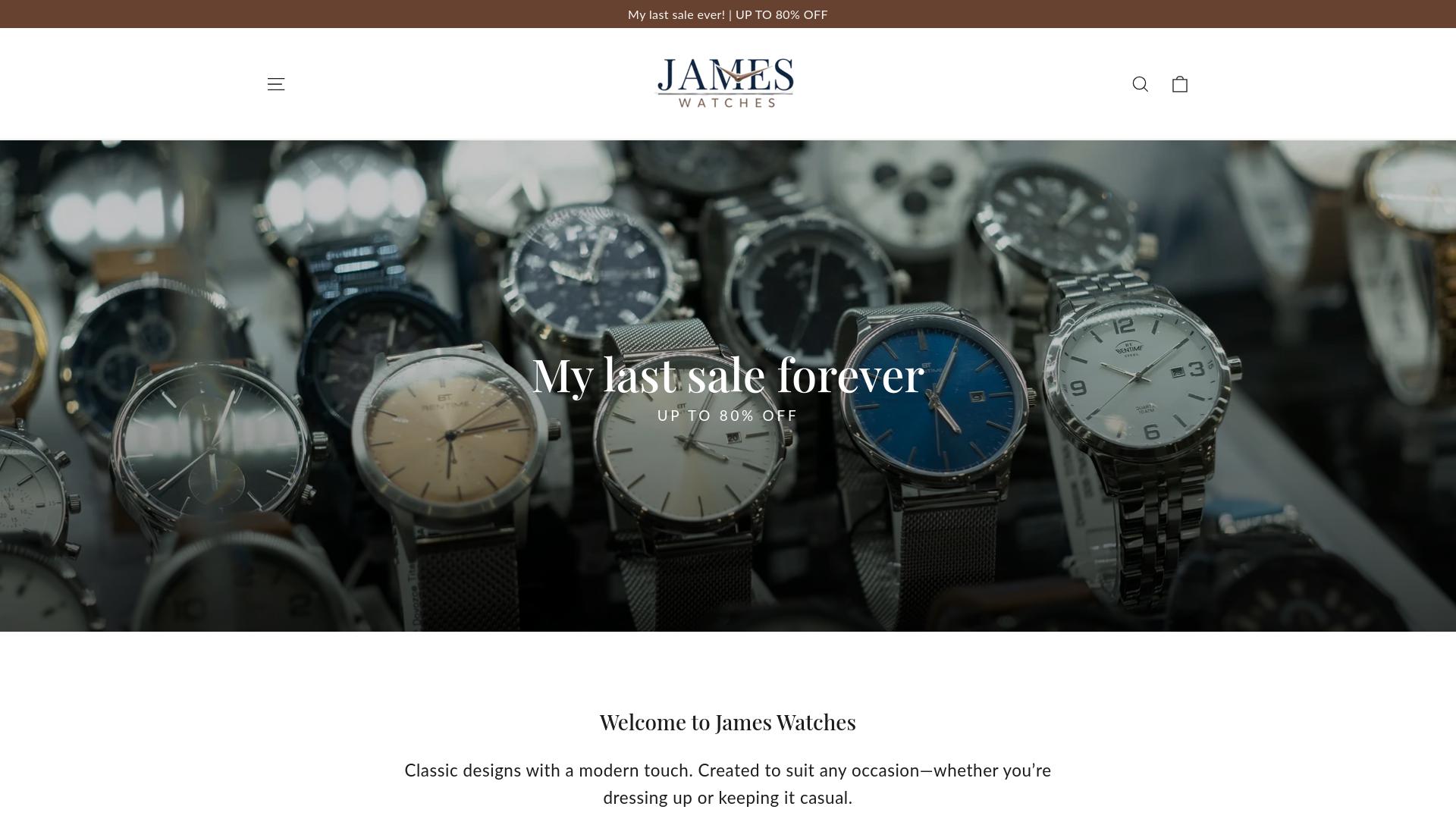 Die Webseite „James Watches“ bietet eine Auswahl an Uhren an und wird durch die Präsentation von verschiedenen Modellen charakterisiert. Auf der Startseite wird ein Rabatt von bis zu 80 % auf die angebotenen Produkte angekündigt, was den Eindruck eines Sonderverkaufs vermittelt. Im oberen Bereich der Seite wird eine zentrale Botschaft angezeigt, die auf einen letzten Verkauf hinweist. Die Kategorisierung der Produkte scheint auf klassische Designs abzuzielen, die durch eine moderne Note ergänzt werden. Die Webseite legt nahe, dass die Uhren für verschiedene Anlässe geeignet sind, unabhängig davon, ob man sich formell kleidet oder einen legere Stil bevorzugt. Die Navigation auf der Webseite ist einfach und übersichtlich gestaltet, sodass Nutzer die verschiedenen Produkte schnell erreichen können. Es gibt visuelle Darstellungen der Uhren, die eine Vielfalt in Design und Farbe zeigen. Die Details zu den Uhrenpunkten umfassen möglicherweise Materialangaben, Funktionen sowie Unterschiede zwischen den einzelnen Modellen, um eine informierte Kaufentscheidung zu unterstützen. Zusätzlich könnte die Seite Informationen zu Versand- und Rückgabebedingungen sowie Kundenservice anbieten, um potenziellen Käufern eine Orientierung zu geben. Die Gestaltung der Webseite könnte professionell wirken, mit einem klaren Design und ansprechenden Bildern, die die Uhren in verschiedenen Blickwinkeln zeigen, um die Details hervorzuheben. Es ist wichtig zu beachten, dass die Webseite auf eine breite Zielgruppe abzielt, die an Uhren interessiert ist, und es keine spezifischen Informationen zu Herstellern oder Markenspezifikationen gibt. Die präsentierten Produkte scheinen eine Mischung aus unterschiedlichen Stilen zu umfassen, die sowohl für Herren als auch für Damen geeignet sind. Insgesamt umfasst die Webseite eine Produktvielfalt im Bereich Uhren und betont Angebote und Rabatte, die für potenzielle Käufer ansprechend sein könnten, ohne jedoch spezifische Details zur Seriosität oder zur Unternehmenspolitik preiszugeben.