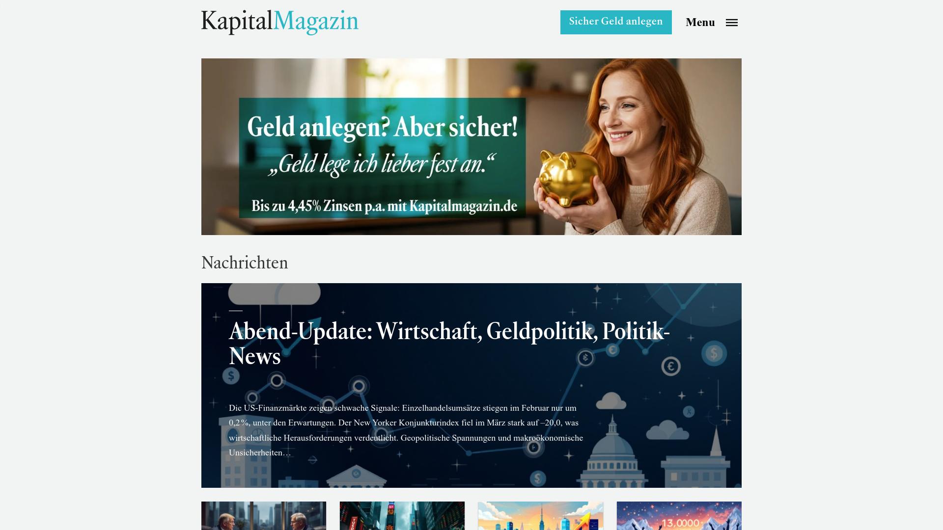 Die Webseite „KapitalMagazin“ bietet Informationen und Dienstleistungen im Bereich Geldanlagen an. Im oberen Bereich der Seite wird ein Angebot zur Geldanlage beworben, das Zinssätze von bis zu 4,45% pro Jahr verspricht. Es wird eine bildliche Darstellung einer Person gezeigt, die eine goldene Sparschweinfigur hält, was auf das Thema des Sparens und der Geldanlage hinweist. Unter dem Bereich „Nachrichten“ sind aktuelle wirtschaftliche Themen und Finanznachrichten aufgeführt. Eine Beispielnachricht thematisiert die Entwicklungen auf den US-Finanzmärkten, in der es um schwache Signale und unter den Erwartungen liegende Einzelhandelsumsätze geht. Der Beitrag verweist auf den New Yorker Konjunkturindex und dessen Rückgang sowie auf geopolitische Spannungen und makroökonomische Unsicherheiten. Zusätzlich könnte es weitere Artikel zu ökonomischen Trends, Geldpolitik und politischen Einflüssen auf die Wirtschaft geben, die das Informationsangebot der Seite ergänzen. Die Struktur der Webseite lässt darauf schließen, dass sie einen aktuellen Überblick über wirtschaftliche Entwicklungen und geldpolitische Maßnahmen bieten möchte. Die Benutzeroberfläche scheint darauf ausgelegt zu sein, eine einfache Navigation zu ermöglichen, um schnell zu den verschiedenen Informationssegmenten zu gelangen. Die Website könnte sowohl für Einzelinvestoren als auch für interessierte Leser, die sich über wirtschaftliche Themen informieren möchten, von Bedeutung sein. Insgesamt wird auf der Webseite potenziellen Nutzern ein breites Spektrum an Informationen zur Verfügung gestellt, das sich um Finanz- und Wirtschaftsthemen dreht, insbesondere im Zusammenhang mit der Geldanlage. Hinweise zur Sicherheit oder zur Vertrauenswürdigkeit der Angebote sind nicht enthalten.