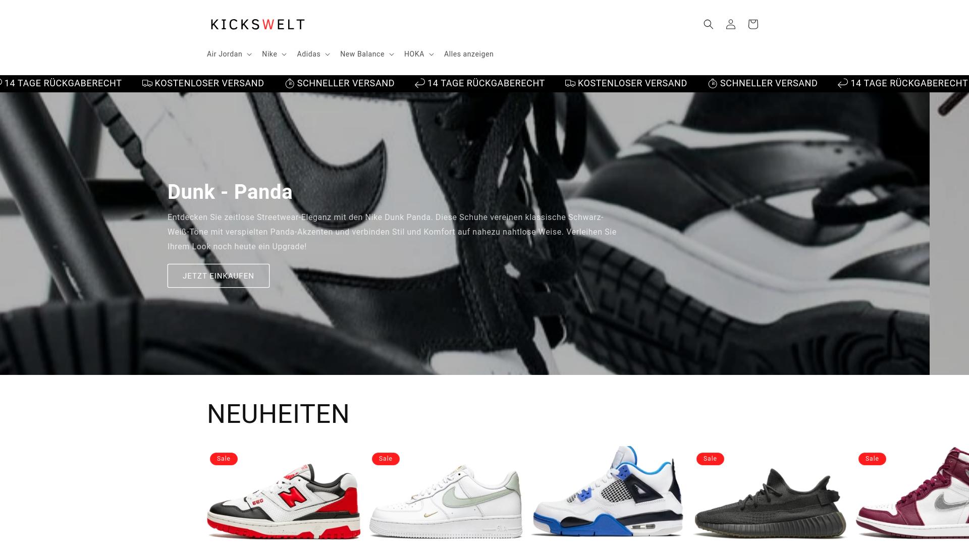 Die Webseite „Kickswelt“ bietet eine Auswahl an Sportschuhen und Sneakern verschiedener Marken, einschließlich Nike, Adidas, New Balance und HOKA. Im Fokus stehen besonders neueste Modelle, die durch visuelle Darstellungen und Produktbeschreibungen hervorgehoben werden. Auf der Hauptseite wird ein spezifisches Modell, die „Nike Dunk Panda“, prominently beworben. Diese Schuhe sind in klassischen Schwarz-Weiß-Tönen gehalten und richten sich an Nutzer, die an modischer Sportbekleidung interessiert sind. Die Beschreibung hebt die Kombination aus Stil und Komfort hervor, ohne auf spezifische technische Details einzugehen. Neben dem hervorgehobenen Modell gibt es eine Sektion für „Neuheiten“, in der verschiedene Schuhmodelle angezeigt werden. Diese Modelle können Sale-Preise bieten, was darauf hinweist, dass einige Produkte zu reduzierten Preisen erhältlich sind. Zu den angezeigten Schuhen gehören Designs von verschiedenen Marken, die für ihre Sport- und Freizeitschuhe bekannt sind. Die Webseite bietet Informationen zu Versandkosten und Rückgabebedingungen an. Ein kostenloser Versand wird hervorgehoben, sowie eine Rückgabefrist von 14 Tagen, gleichfalls werden Optionen für schnellen Versand angeboten. Nutzer können die Seite anscheinend sowohl für Informationen als auch zum Einkauf von Sportschuhen nutzen. Es wird darauf hingewiesen, dass die Webseite eine klare Struktur hat, die es den Nutzern ermöglicht, schnell zwischen den unterschiedlichen Produktkategorien zu navigieren. Es scheint auch eine Benutzeroberfläche für die Anmeldung von Benutzerdaten zu geben, die es den Nutzern ermöglicht, ein Konto zu erstellen oder sich anzumelden. Insgesamt vermittelt die Webseite den Eindruck, eine Plattform zu sein, die sich auf den Verkauf von Sneakers und damit verbundenen Produkten spezialisiert hat, ohne weiterführende Informationen zu zusätzlichen Dienstleistungen oder Besonderheiten der angebotenen Waren bereitzustellen.