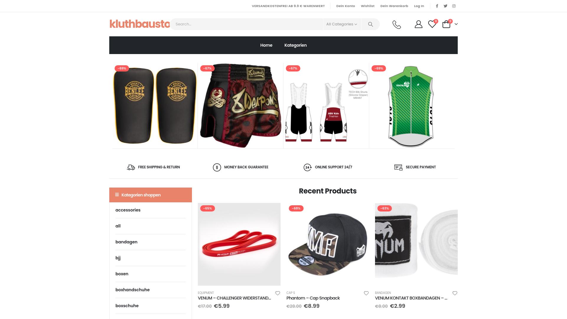 Die Webseite „kluthbausto“ bietet eine Vielzahl von Produkten im Bereich Sport- und Fitnesszubehör an, mit einem Schwerpunkt auf Kampfsportausrüstung. Die Startseite präsentiert verschiedene Artikel, die in Kategorien unterteilt sind, darunter „Zubehör“, „Banden“ sowie spezifische Kampfsportarten wie „Boxen“ und „BJJ“ (Brazilian Jiu-Jitsu). Im oberen Bereich sind mehrere Produkte abgebildet, die jeweils mit Rabatten von bis zu 69 % gekennzeichnet sind. Zu den angezeigten Artikeln gehören unter anderem Schlagpolster, Shorts für Kampfsport und Trikots. Neben der Produktansicht bietet die Seite Informationen zu Versandoptionen, inklusive kostenlosem Versand ab einem bestimmten Warenwert, sowie Rückgabemöglichkeiten. Die Webseite weist auch eine Geld-zurück-Garantie auf und hebt die Verfügbarkeit von Online-Support 24 Stunden am Tag hervor. Im Bereich der neuesten Produkte werden Artikel wie eine Fitnessgummiband, eine Cap und Boxbandagen zum Verkauf angeboten, welche ebenfalls durch prozentuale Rabatte gekennzeichnet sind. Ein Menü auf der linken Seite ermöglicht es Nutzern, durch die verschiedenen Kategorien zu navigieren und gezielt nach Artikeln zu suchen. Die Produktdarstellungen sind mit Preisangaben versehen, die sowohl den ursprünglichen Preis als auch den reduzierten Preis anzeigen. Zusätzlich ist die Webseite in einem modernen Design gehalten und bietet eine einfache Benutzeroberfläche, die es den Nutzern erleichtert, zwischen den verschiedenen Produkten und Kategorien zu wechseln. Es gibt Optionen zur Erstellung eines Benutzerkontos, zur Verwaltung einer Wunschliste und für den Warenkorb, der visuell hervorgehoben wird. Insgesamt zielt die Webseite darauf ab, eine umfangreiche Auswahl an Fitness- und Kampfsportausrüstung zu präsentieren und Interessierten eine klare Anlaufstelle zum Einkauf zu bieten.