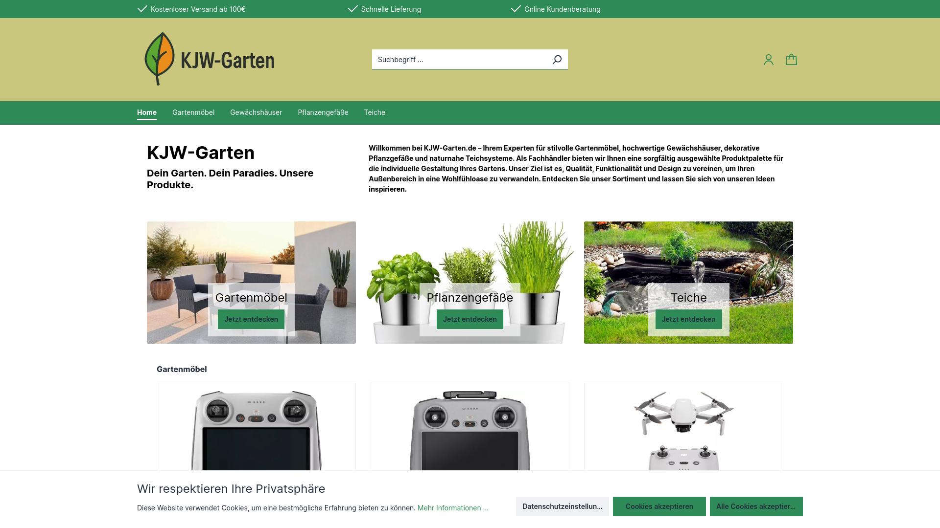 Die Webseite KJW-Garten bietet eine Vielzahl von Produkten, die sich auf den Bereich Garten und Außenbereich konzentrieren. Die Hauptkategorien umfassen Gartenmöbel, Gewächshäuser, Pflanzgefäße und Teichzubehör. Im Bereich Gartenmöbel werden verschiedene Möbelstücke angeboten, die für den Einsatz im Freien konzipiert sind. Dazu gehören Tische, Stühle und andere Sitzgelegenheiten, die in unterschiedlichen Designs und Materialien erhältlich sind. Die Auswahl zielt darauf ab, eine funktionale und ästhetisch ansprechende Gestaltung der Außenbereiche zu ermöglichen. Die Kategorie Gewächshäuser umfasst Produkte, die darauf ausgelegt sind, Pflanzen unter kontrollierten Bedingungen zu kultivieren. Die Gewächshäuser sind in unterschiedlichen Größen und Ausführungen verfügbar, um den verschiedenen Bedürfnissen von Hobbygärtnern oder professionellen Landwirten gerecht zu werden. Unter der Rubrik Pflanzgefäße werden verschiedene Arten von Behältern angeboten, die zur Pflanzenzucht verwendet werden können. Diese Gefäße sind in diversen Materialien und Designs erhältlich, um sowohl Funktionalität als auch eine ansprechende Optik zu bieten. Die Produkte sind darauf ausgelegt, die pflanzenfreundlichen Bedingungen zu fördern und an verschiedene Garten- oder Innenraumstile angepasst zu werden. Die Teichkategorie präsentiert Produkte und Zubehör für die Gestaltung und Pflege von Teichen. Hierzu zählen auch dekorative Elemente sowie technische Ausstattungen, die für die Instandhaltung und das Wohlbefinden von Teichbewohnern relevant sind. Die Webseite hebt den kostenlosen Versand ab einem bestimmten Bestellwert und die Möglichkeit einer Online-Kundenberatung hervor. Nutzer können durch die angebotenen Kategorien navigieren, um spezifische Produkte zu entdecken und zu vergleichen. Es wird darauf hingewiesen, dass die Webseite Cookies verwendet, um die Benutzererfahrung zu optimieren. Insgesamt bietet KJW-Garten eine strukturierte Plattform, die auf die Bedürfnisse von Gartenliebhabern und -freunden ausgerichtet ist, indem sie verschiedene Produkte zur Verfügung stellt, die das Gärtnern im Freien erleichtern und bereichern sollen.