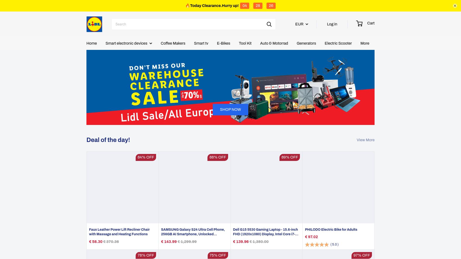 Die Webseite präsentiert eine Vielzahl von Produkten aus den Bereichen Elektronik und Haushalt. Sie ist offensichtlich darauf ausgelegt, verschiedene elektronische Geräte anzubieten, darunter Smart-TVs, Kaffeemaschinen, E-Bikes, Generatoren und weitere technische Ausstattungen. Auf der Startseite wird ein Banner angezeigt, der auf eine „Warehouse Clearance Sale“ hinweist, bei der bis zu 70% Rabatt auf ausgewählte Artikel angeboten werden. Es gibt auch spezifische Angebote des Tages, die besonders reduzierte Preise für ausgewählte Produkte hervorheben. Die Produktübersicht zeigt Rabatte von bis zu 97% auf verschiedene Artikel. Unter den Angeboten findet man beispielsweise einen „Faux Leather Power Lift Recliner Chair“ mit Massage- und Heizfunktionen zu einem stark reduzierten Preis. Weitere Produkte umfassen ein Hochleistungs-Smartphone, ein Gaming-Laptop sowie ein Elektrofahrrad. Die Preise der Artikel werden sowohl in Euro als auch in durchgestrichenen Orginalpreisen angezeigt, um den Preisnachlass zu verdeutlichen. Die Webseite verfügt über Kategorien wie „Smart electronic devices“, „Coffee Makers“, „Tool Kit“ und „Auto & Motorrad“, was darauf hindeutet, dass eine breite Palette an technischen und Haushaltswaren abgedeckt wird. Nutzer können die Seite nach verschiedenen Produktarten durchsuchen und erhalten möglicherweise die Möglichkeit, sich anzumelden, um Angebote oder Neuigkeiten zu erhalten. Darüber hinaus gibt es eine Option zur Warenkorbfunktion sowie eine Möglichkeit, sich im Benutzerkonto einzuloggen. Ein Countdown im Kopfbereich der Seite weist darauf hin, dass gewisse Angebote zeitlich begrenzt sind, was die Dringlichkeit zum Kauf erhöhen könnte. Insgesamt bietet die Webseite eine Übersicht über diverse elektronische Produkte zu ermäßigten Preisen und ist strukturiert, um den Nutzern eine einfache Navigation durch die Angebote zu ermöglichen. Die Darstellung der Rabatte, sowie die Kategorisierung der Produkte, schaffen eine klare Übersicht, die potenzielle Käufer ansprechen soll.