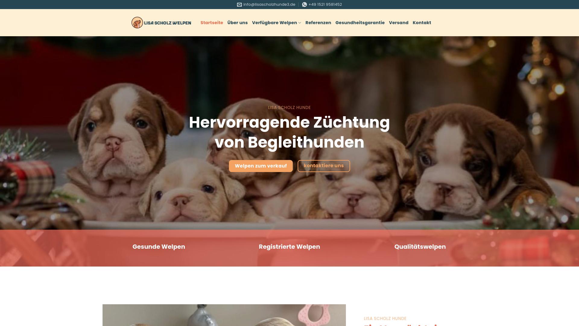 Die Webseite „Lisa Scholz Welpen“ bietet Informationen zur Zucht von Begleithunden an. Auf der Startseite wird die Zucht als „hervorragend“ bezeichnet und wirbt mit gesunden Welpen. Die Hauptkategorie der Seite ist die Vorstellung von Welpen, die zum Verkauf angeboten werden. Zusätzlich zur Verkaufsinformation gibt es einen Bereich mit registrierten Welpen. Hier könnte man erwarten, Details über die Herkunft oder Rasse der angebotenen Tiere zu finden. Die Webseite enthält auch einen Abschnitt zu Gesundheitsgarantien, der möglicherweise Informationen zu Impfungen oder allgemeinen Gesundheitszuständen der Welpen bietet. Ein weiterer Abschnitt könnte Hinweise auf Versandmöglichkeiten für die Welpen beinhalten, was darauf hindeutet, dass die Tiere, nach dem Erwerb, auch über längere Distanzen zu neuen Besitzern gebracht werden können. Der Abschnitt „Über uns“ könnte Informationen über die Züchterin und deren Zuchtphilosophie oder Erfahrungen enthalten. Die Webseite enthält auch einen Kontaktbereich, über den Interessierte direkt mit dem Anbieter in Verbindung treten können. Kommunikationsmöglichkeiten sind angegeben, darunter eine E-Mail-Adresse und eine Telefonnummer, was auf die Absicht hinweist, potenzielle Käufer direkt zu informieren oder eventuelle Fragen zu beantworten. Insgesamt konzentriert sich die Webseite auf die Präsentation und den Verkauf von Welpen, mit zusätzlichen Informationen zu Zucht, Gesundheit und Kontaktdaten für interessierte Käufer.