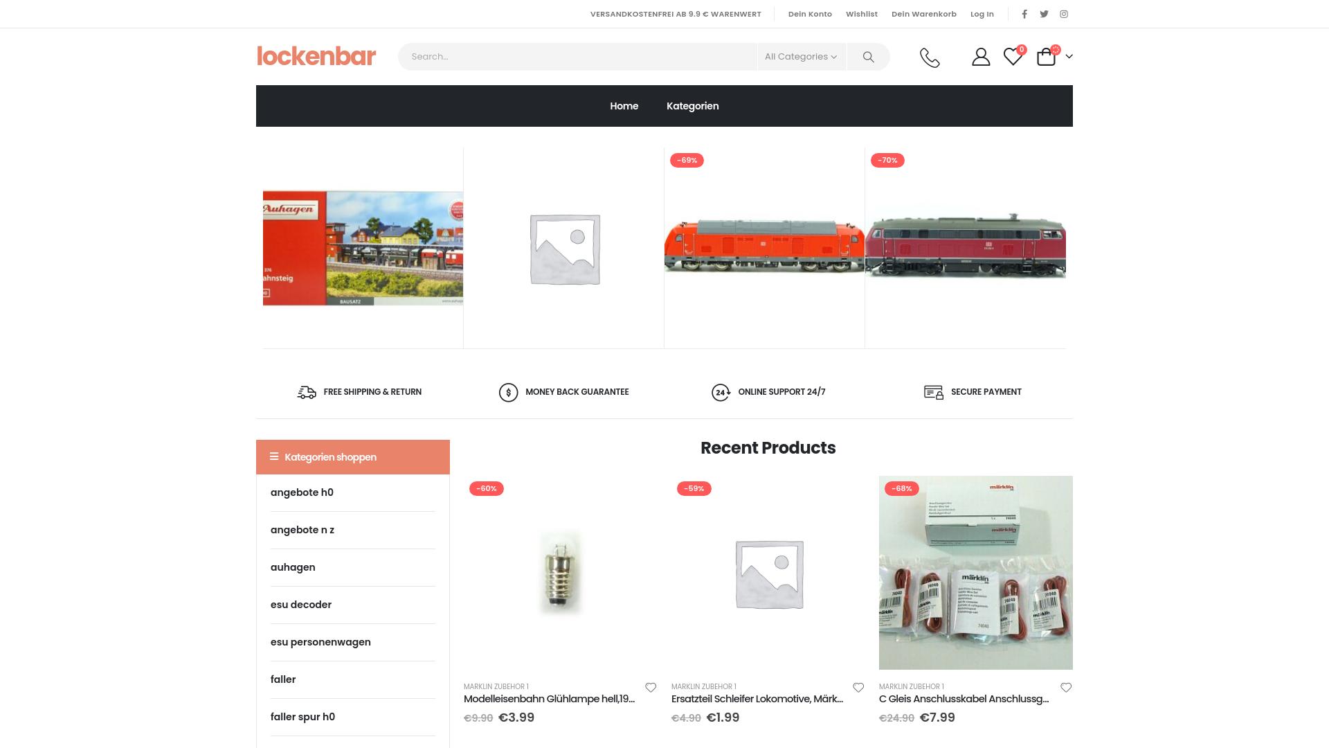 Die Webseite „lockenbar“ bietet eine Auswahl von Produkten im Bereich Modellbau, insbesondere für Modelleisenbahnen. Nutzer können verschiedene Artikel in mehreren Kategorien durchsuchen, darunter die Kategorien „Angebote H0“, „Angebote N Z“, „Auahagen“, „ESU Decoder“, „ESU Personenwagen“, „Faller“ sowie „Faller Spur H0“. Auf der Startseite werden unter anderem mehrere Artikel mit Preisnachlässen angezeigt. Beispiele sind eine Modellbahn-Gühllampe, Ersatzteile für Lokomotiven sowie Anschlußkabel. Diese Produkte werden jeweils mit dem alten Preis und dem reduzierten Preis dargestellt, wobei die Abzüge in Prozent angegeben sind. Die Webseite informiert darüber hinaus über kostenlose Versand- und Rückgabemöglichkeiten und wirbt mit einer Geld-zurück-Garantie. Es gibt einen Abschnitt, der Unterstützung rund um die Uhr anbietet, was bedeutet, dass Nutzer jederzeit Fragen oder Anliegen an das Kundenserviceteam richten können. Die Navigation auf der Seite scheint benutzerfreundlich gestaltet zu sein, mit klaren Kategorien, die den Zugang zu spezifischen Produkten erleichtern. Eine Suchfunktion ermöglicht es den Nutzern, gezielt nach bestimmten Artikeln zu suchen. Zusätzlich sind die neuesten Produkte auf der Seite aufgelistet, was den Besuchern einen Überblick über aktuelle Angebote und Artikel im Sortiment gibt. Die Produktverfügbarkeit und die entsprechenden Preise sind ebenfalls ersichtlich. Insgesamt bietet die Webseite eine Plattform für Modellbahn-Enthusiasten, um verschiedene Produkte zu finden und zu erwerben. Die dargestellten Informationen zielen darauf ab, den Nutzern eine schnelle und effiziente Einkaufserfahrung zu ermöglichen.