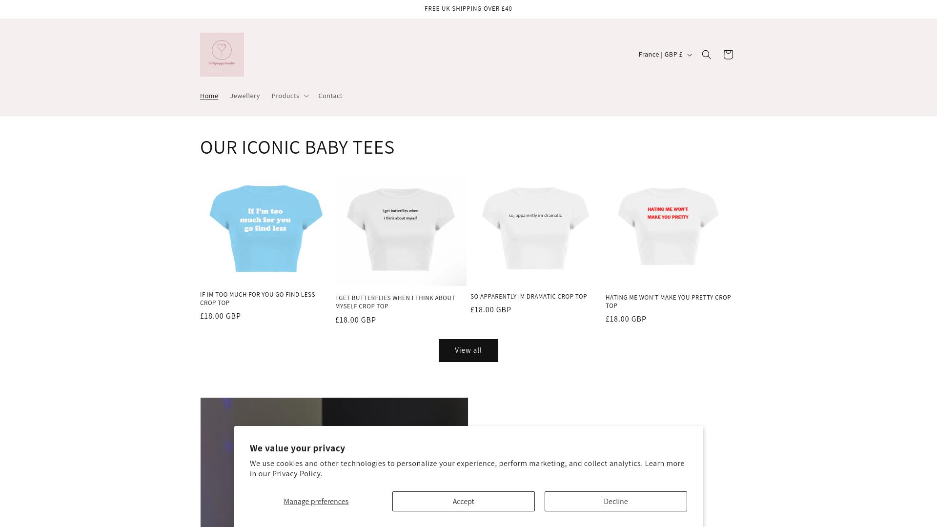 Die Webseite bietet eine Auswahl an Bekleidungsartikeln, insbesondere Crop Tops für Damen. Die angebotenen Produkte sind mit verschiedenen Aussagen und Sprüchen bedruckt. Zu den verfügbaren Artikel gehören unter anderem: 1. **If I’m too much for you go find less Crop Top** – in blauer Farbe, erhältlich für 18,00 GBP. 2. **I get butterflies when I think about myself Crop Top** – in weißer Farbe, ebenfalls für 18,00 GBP. 3. **So apparently I’m dramatic Crop Top** – ebenfalls in weiß, zum Preis von 18,00 GBP. 4. **Hating me won’t make you pretty Crop Top** – in klassischem weiß, zu einem Preis von 18,00 GBP. Die Preise für die Crop Tops liegen einheitlich bei 18,00 GBP. Die Seite verwendet eine klare und einfache Gestaltung, um die Produkte darzustellen. Neben der Produktpräsentation gibt es einen Menübereich, der weitere Kategorien anzeigt, darunter Schmuck und eine Kontaktseite. Ein Hinweis auf die Versandbedingungen ist ebenfalls vorhanden, wo angegeben wird, dass der Versand innerhalb des Vereinigten Königreichs kostenlos ist, sofern der Bestellwert über 40 GBP liegt. Es werden typische Zahlungsmethoden nicht direkt erwähnt, sodass es unklar bleibt, welche Optionen den Kunden zur Verfügung stehen. Insgesamt konzentriert sich die Webseite auf den Verkauf von modeorientierten Textilien mit textlichen Aufdrucken und bietet eine grundlegende Navigation für Interessierte, die sich für das Produktangebot interessieren könnten. Die Designs der Shirts scheinen auf humorvolle oder sarkastische Weise formuliert zu sein, jedoch wird keine detaillierte Beschreibung der Produktionsbedingungen oder der Materialqualität gegeben. Die Webseite scheint sich an ein jüngeres oder modebewusstes Publikum zu richten, bietet jedoch keine zusätzlichen Informationen zu Rückgabebedingungen oder Kundenservice an.