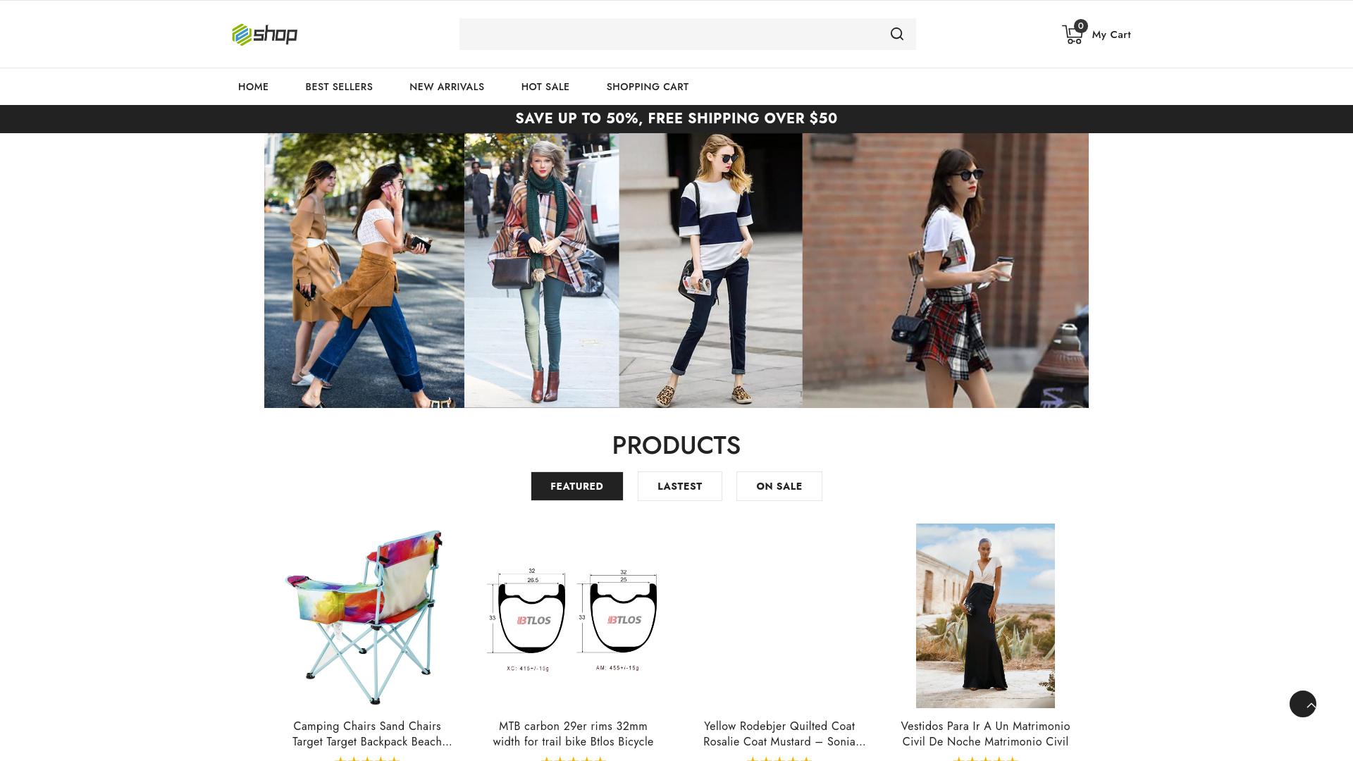 Die Webseite bietet eine Vielzahl von Produkten in den Kategorien Kleidung und Zubehör an. Auf der Hauptseite sind verschiedene stilisierte Fotos von Frauen zu sehen, die verschiedene Outfits präsentieren, was auf ein modisches Angebot hinweist. Unter dem Abschnitt „Produkte“ werden diverse Artikel angezeigt, einschließlich Campingstühlen, Fahrradteilen und Bekleidungsstücken. Die Campingstühle werden als „Sand Chairs“ beschrieben und scheinen für den Außenbereich geeignet zu sein. Ein Modell wird mit einer farbenfrohen, mehrfarbigen Gestaltung präsentiert. Zusätzlich werden Fahrradkomponenten angeboten, beispielsweise Radsatzteile für MTB-Fahrräder, mit spezifischen technischen Angaben zu den Maßen. Dies deutet darauf hin, dass die Webseite auch Artikel für Sport und Freizeit abdeckt. Im Bekleidungssegment werden sowohl Freizeit- als auch formelle Kleidungsstücke aufgeführt. Unter anderem sind Oberbekleidung sowie formelle Kleider zum Tragen bei besonderen Anlässen zu finden. Es wird erwähnt, dass die Seite Rabatte von bis zu 50 % und kostenlosen Versand bei Bestellungen über 50 US-Dollar anbietet. Die Navigation scheint klar strukturiert zu sein, mit Bereichen für „Beliebte Artikel“, „Neuheiten“ und „Aktionen“, was es Nutzern erleichtert, Produkte zu finden. Die präsentierten Produkte sind mit kurzen Beschreibungen und teilweise mit Bildern versehen, um den Nutzern eine visuelle Vorstellung zu geben. Zusammengefasst bietet die Webseite eine Auswahl an Modeartikeln und Freizeitprodukten, wobei ein klarer Fokus auf ästhetischen Präsentationen im Kontext von Kleidung liegt und zusätzliche Artikel wie Camping- und Fahrradprodukte inkludiert sind.