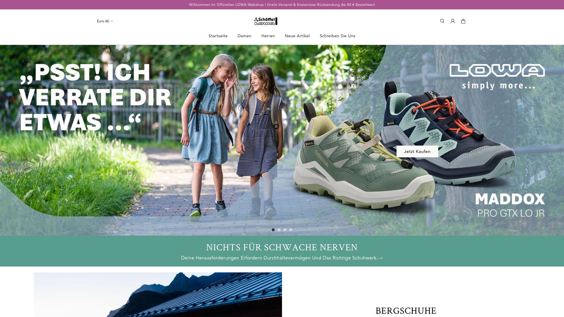 Die Webseite bietet ein Sortiment an Outdoor-Schuhen, insbesondere Berg- und Wanderschuhe, die für verschiedene Aktivitäten im Freien gedacht sind. Auf der Homepage wird ein ansprechendes visuelles Design verwendet, das verschiedene Modelle in einer naturbezogenen Umgebung zeigt. Die dargestellten Produkte sind sowohl für Damen als auch für Herren verfügbar, und die Seite enthält spezifische Kategorien, die den Nutzern die Navigation erleichtern. Es wird auf die Funktionalität und die speziellen Eigenschaften der Schuhe eingegangen, wie etwa Wasserdichtigkeit und rutschfeste Sohlen, die für unterschiedliche Gelände geeignet sind. Zudem findet sich eine Auswahl an Kinder-Modellen, die für junge Sportler gedacht sind. Weitere angebotene Artikel werden in einer Rubrik für neue Produkte hervorgehoben, um Kunden über aktuelle Angebote und Neuheiten zu informieren. Ein bemerkenswerter Aspekt der Webseite ist das Angebot von kostenlosem Versand sowie die Möglichkeit der kostenlosen Rücksendung ab einem bestimmten Bestellwert. Diese Informationen sind für potenzielle Käufer relevant, um die Kaufentscheidung zu erleichtern. Darüber hinaus enthält die Webseite einen Bereich, der es Nutzern ermöglicht, direkt Kontakt mit dem Kundenservice aufzunehmen, um Fragen zu Produkten oder Bestellungen zu klären. Die Gestaltung der Webseite fokussiert sich auf Benutzerfreundlichkeit, mit einem klaren Layout und verständlichen Links zu den verschiedenen Produktkategorien. Die Texte verwenden zum Teil markante Slogans und motivierende Untertitel, die den Outdoor-Lebensstil ansprechen. Generell zielt die Webseite darauf ab, ein breites Publikum von Outdoor-Enthusiasten anzusprechen, indem sie praktische Informationen sowie eine ansprechende Produktpräsentation bereitstellt. Die gesamte Nutzererfahrung wird durch visuelle Elemente und durchdachte Textgestaltung unterstützt, die den Besuchern hilft, sich über die angebotenen Produkte zu informieren und eine Kaufentscheidung zu treffen.