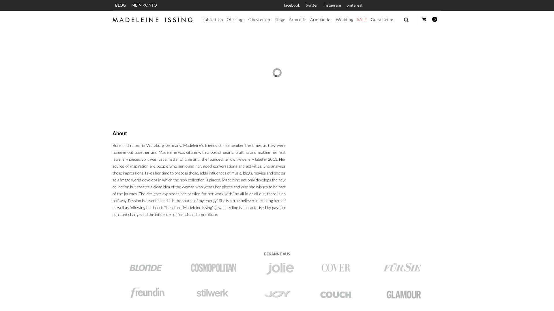 Die Webseite von Madeleine Issing präsentiert eine Schmuckmarke, die eine Vielzahl von handgefertigten Schmuckstücken anbietet. Der Inhalt umfasst vor allem verschiedene Kategorien, darunter Halsketten, Ohrringe, Ohrstecker, Ringe, Armbänder, Armreifen und Hochzeits-Schmuck. Jede Kategorie enthält eine Auswahl an Designs, die verschiedene Stile und Materialien repräsentieren. Die „Über uns“-Sektion beschreibt die Gründerin, Madeleine Issing, und ihren Hintergrund. Sie wurde in Würzburg, Deutschland, geboren und gründete 2011 ihr eigenes Schmucklabel. Die Inspiration für ihre Kollektionen zieht sie aus den Menschen, die sie umgeben, sowie aus Einflüssen aus Musik, Blogs, Filmen und Fotos, die sie in ihrer kreativen Arbeit verarbeitet. Es wird erwähnt, dass die Kollektionen einen Eindruck von der Persönlichkeit der Trägerin vermitteln sollen. Die Webseite listet auch soziale Medien und Plattformen, auf denen die Designs präsentiert werden, um die Sichtbarkeit der Marke zu erhöhen. Die Verwendung von Begriffen wie „Leidenschaft“ und „Energie“ weist darauf hin, dass die Designerin stark an ihre kreativen Prozesse und die emotionale Verbindung zu ihren Produkten gebunden ist. Zusätzlich finden sich Inhalte, die auf eine Verkaufsfunktion hinweisen, wobei Kunden die Möglichkeit haben, Gutscheine zu erwerben und in einem Sale-Bereich reduzierte Artikel zu finden. Die Präsentation der Produkte erfolgt in einem minimalistischen Design, das darauf abzielt, die Schmuckstücke in den Vordergrund zu stellen. Die Webseite ist darauf angelegt, Nutzer mit einem breiten Angebot an Schmuck zu versorgen, das sowohl alltägliche als auch besondere Anlässe anspricht. Zudem werden einige bekannte Magazine genannt, in denen die Marke möglicherweise vorgestellt wurde.