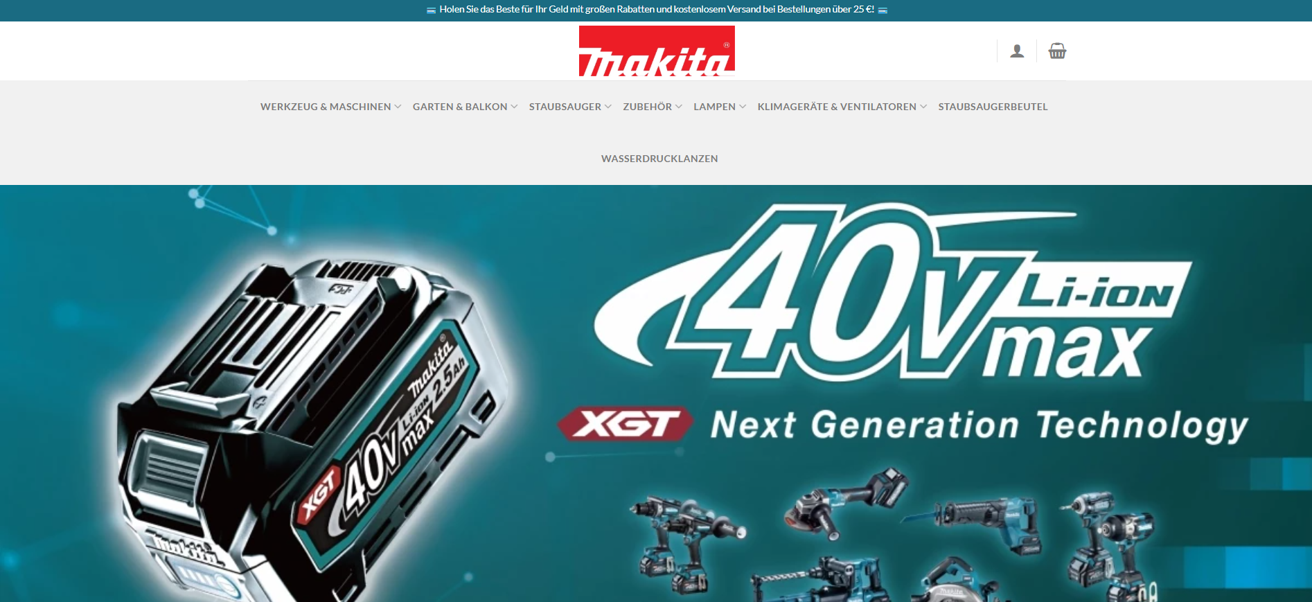 Die Webseite präsentiert verschiedene Produkte des Herstellers Makita und konzentriert sich auf Werkzeuge und Maschinen, die für den Einsatz im Bau- und Gartenbereich geeignet sind. Auf der Seite sind verschiedene Kategorien aufgelistet, darunter „Werkzeug & Maschinen“, „Garten & Balkon“, „Staubsauger“, „Zubehör“, „Lampen“, „Klimageräte & Ventilatoren“ sowie „Staubsaugerbeutel“. Innerhalb der einzelnen Kategorien können Nutzer offenbar unterschiedliche Arten von Produkten finden. Im Bereich „Werkzeug & Maschinen“ werden elektrische und akkuoperative Werkzeuge angeboten, die für handwerkliche Tätigkeiten oder Bauprojekte nützlich sind. Zu den genannten Produktmerkmalen zählen Modelle wie Akku-Schrauber, Bohrhämmer, Winkelschneider und weitere spezialisierte Werkzeuge. Die Kategorie „Garten & Balkon“ umfasst typischerweise Geräte für die Gartenpflege. Hierunter könnten Rasenmäher, Heckenschneider und weitere Gartengeräte fallen, um die Pflege oder Gestaltung von Außenanlagen zu unterstützen. Im Abschnitt „Staubsauger“ werden verschiedene Modelle angeboten, die auf unterschiedliche Reinigungsbedürfnisse zugeschnitten sind. Dabei könnte es sich um Handstaubsauger oder Bodenstaubsauger handeln, die für private oder gewerbliche Verwendungszwecke geeignet sind. Die Kategorie „Zubehör“ scheint eine Auswahl an ergänzenden Produkten zu beinhalten, die für die oben genannten Werkzeuge nützlich sind, wie beispielsweise Aufsätze und Ersatzteile. Darüber hinaus werden in der Rubrik „Lampen“ wahrscheinlich unterschiedliche Beleuchtungslösungen angeboten, die für den Einsatz in Werkstätten, auf Baustellen oder im Freien konzipiert sind. Die Webseite legt einen besonderen Fokus auf die „40V Li-ion max“ Akku-Technologie, die in mehreren Produkten hervorgehoben wird. Diese Technologie wird als „Next Generation Technology“ beschrieben, was auf eine moderne und leistungsfähige Produktlinie hinweisen soll. Zusammenfassend bietet die Webseite eine breite Palette an Werkzeugen und Maschinen, die für unterschiedliche Anwendungen im Bereich Bau, Garten und Reinigung ausgelegt sind. Die Struktur der Seite ermöglicht eine einfache Navigation durch die verschiedenen Produktkategorien.