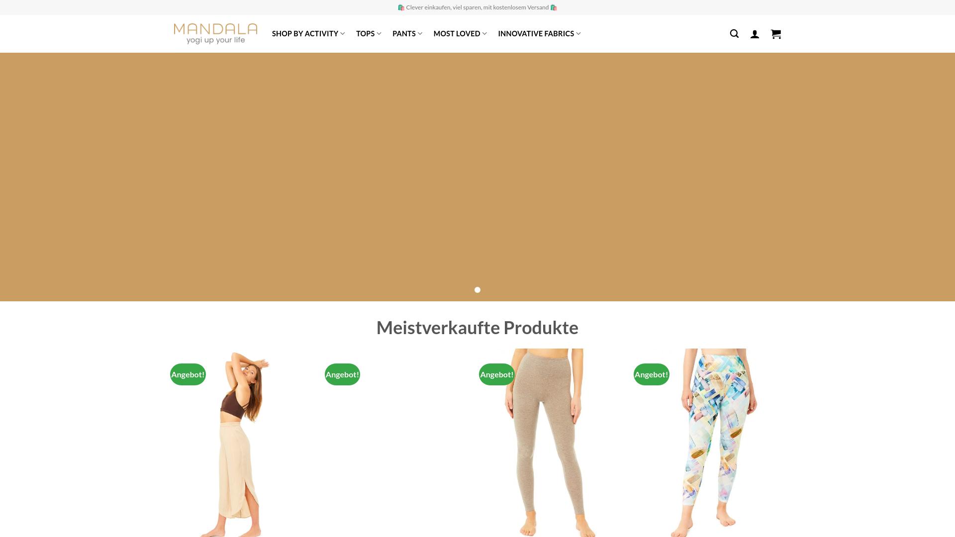 Die Webseite „Mandala“ bietet eine Auswahl an Bekleidungsartikeln, die sich überwiegend an Personen richten, die an Yoga-Aktivitäten interessiert sind. Im oberen Bereich der Webseite sind verschiedene Kategorien zu finden, darunter „Tops“, „Pants“, „Most Loved“ und „Innovative Fabrics“. Dies deutet darauf hin, dass die Seite auf eine Vielzahl von Kleidungsstücken spezialisiert ist, die für sportliche und entspannende Aktivitäten geeignet sind. Unter dem Abschnitt „Meistverkaufte Produkte“ werden mehrere Bekleidungsstücke präsentiert. Zu den sichtbaren Artikeln gehören legere Sportleggings in unterschiedlichen Designs sowie Oberteile, die den Komfort und die Funktionalität bei körperlicher Bewegung betonen. Die Produkte scheinen in verschiedenen Farben und Mustern angeboten zu werden, was auf eine Vielfalt in der Auswahl hindeutet. Ein weiteres Merkmal der Webseite sind Hinweise auf Sonderangebote, die durch ein „Angebot!“-Label gekennzeichnet sind, was potenziell darauf hinweist, dass bestimmte Artikel zu ermäßigten Preisen erhältlich sind. Die Nutzer können darauf basierend einkaufen und Bewertungen oder Trends zu den meistverkauften Artikeln einsehen. Die Webseite ist darauf ausgelegt, die Benutzerfreundlichkeit zu fördern, indem sie eine klare Navigation und verschiedene Suchmöglichkeiten zur Verfügung stellt. Dies erleichtert es den Nutzern, gezielt nach bestimmten Produkten oder Kategorien zu suchen. Zusammenfassend lässt sich sagen, dass die Webseite „Mandala“ eine Plattform für den Erwerb von Bekleidungsartikeln darstellt, die sich insbesondere an die Bedürfnisse von Yoga-Anhängern richtet. Die Vielzahl der angebotenen Produkte und die Möglichkeit, nach Kategorien zu filtern, sind zentrale Aspekte dieser Plattform.