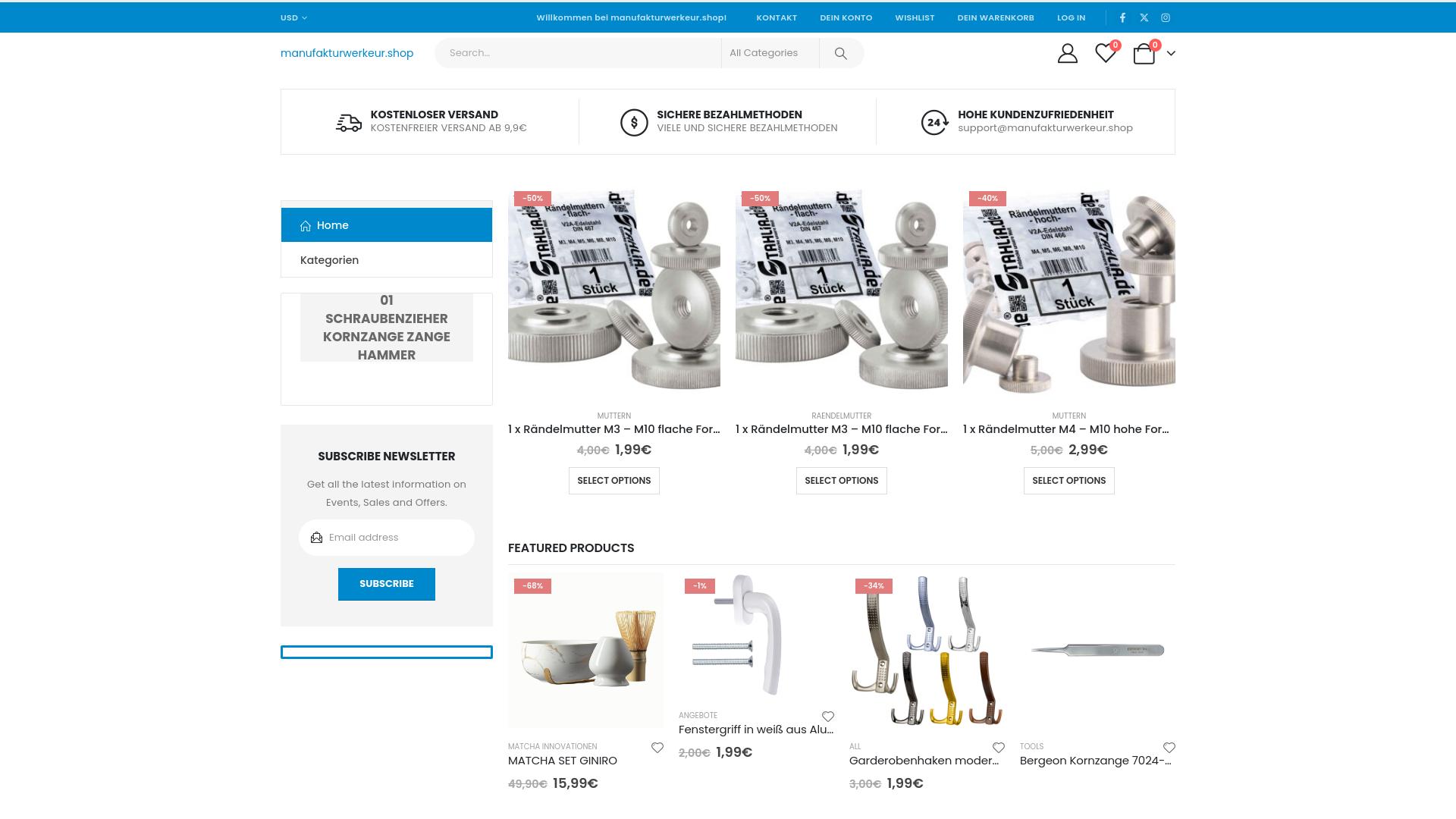 Die Webseite „manufakturwerkeru.shop“ bietet eine Auswahl an verschiedenen Produkten, hauptsächlich im Bereich Werkzeuge und Zubehör an. Die Hauptkategorie umfasst verschiedene Arten von Schrauben und Muttern, darunter Rändelmutter in verschiedenen Größen wie M3 und M4, die in jeweils unterschiedlichen Ausführungen angeboten werden. Die Preisgestaltung auf der Seite zeigt sowohl reguläre als auch reduzierte Preise, wobei einige Produkte mit Rabatten von bis zu 68% gekennzeichnet sind. Beispielsweise ist ein Set namens „MATCHA SET GINIRO“ gelistet, das ursprünglich zu einem Preis von 49,90 Euro angeboten wurde und nun für 15,99 Euro erhältlich ist. Des Weiteren werden weitere Produkte wie Fenstergriffe aus Aluminium und verschiedene Arten von Garderobenhaken gezeigt. Die Seite enthält zudem Informationen über die Versandkosten, die bei einem Bestellwert von unter 9,90 Euro anfallen, sowie die Möglichkeit, sich für einen Newsletter anzumelden, um über Neuigkeiten, Angebote und Veranstaltungen informiert zu werden. Die Zahlungsmethoden werden als sicher bezeichnet, wobei eine Vielzahl an Optionen erwähnt wird. Für Kunden, die an verschiedenen Werkzeugen und Zubehör interessiert sind, bietet die Seite somit eine zusammengestellte Kollektion zu unterschiedlichen Preisen an. Die Navigation auf der Seite erfolgt über eine klare Kategorisierung der angebotenen Produkte.